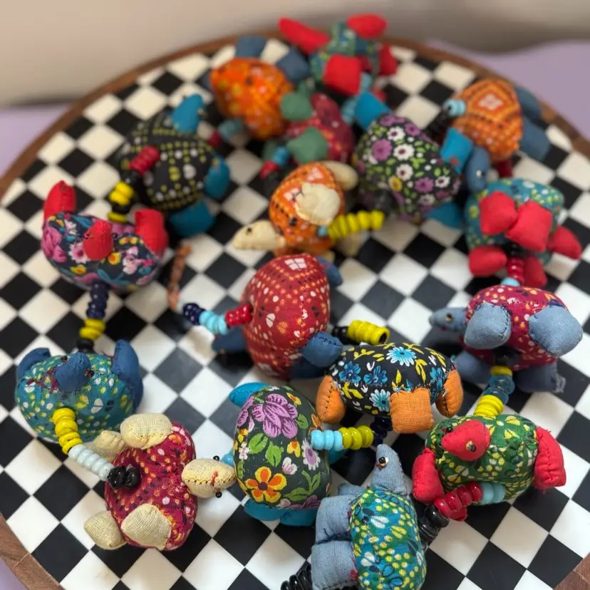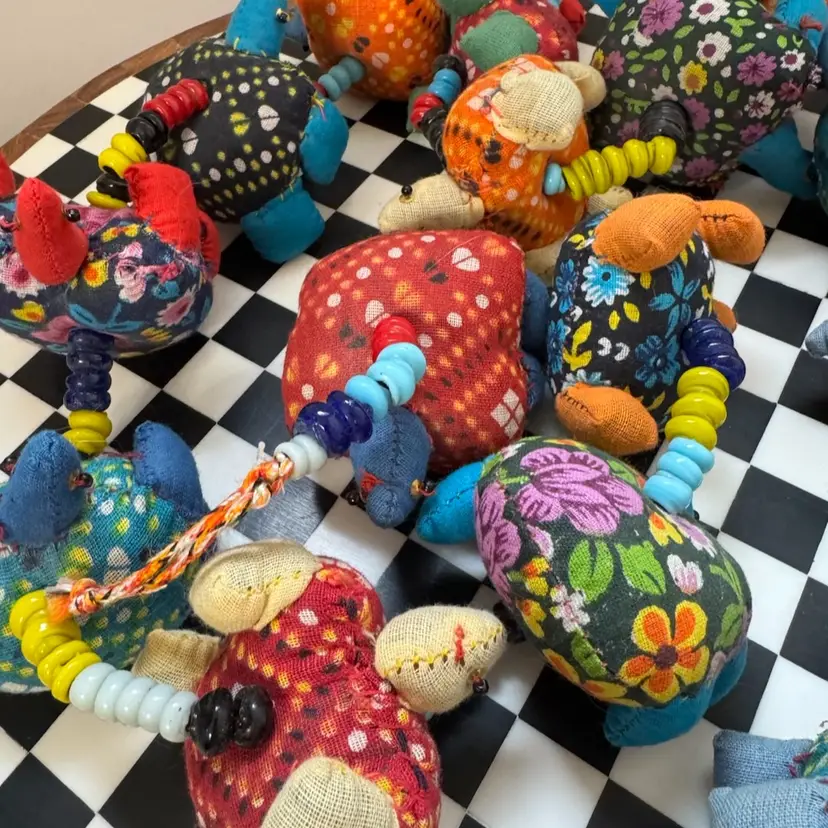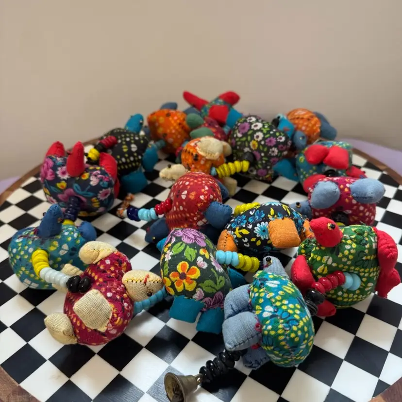 Really colorful stuffed turtles with a glass beating. Can be used as garland or hanging. Measures about 50 inches long including bell on bottom. One turtle is missing a leg.