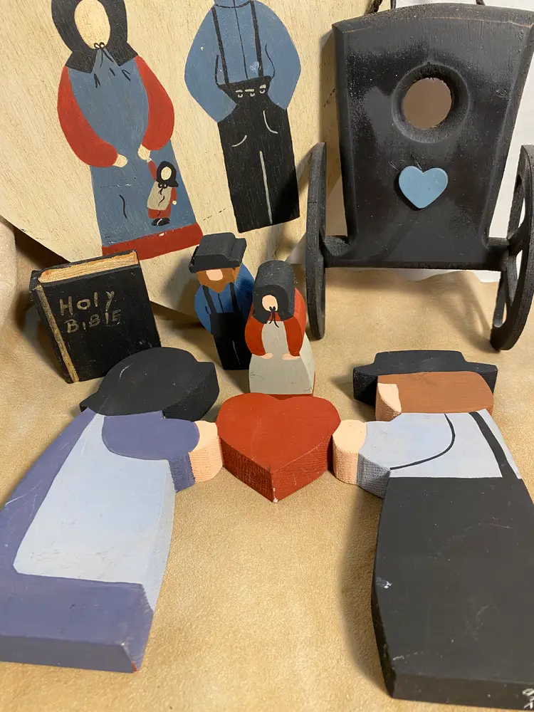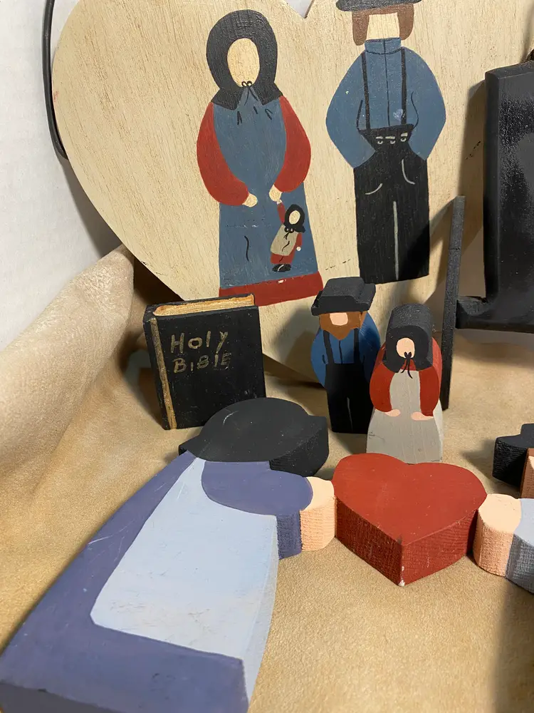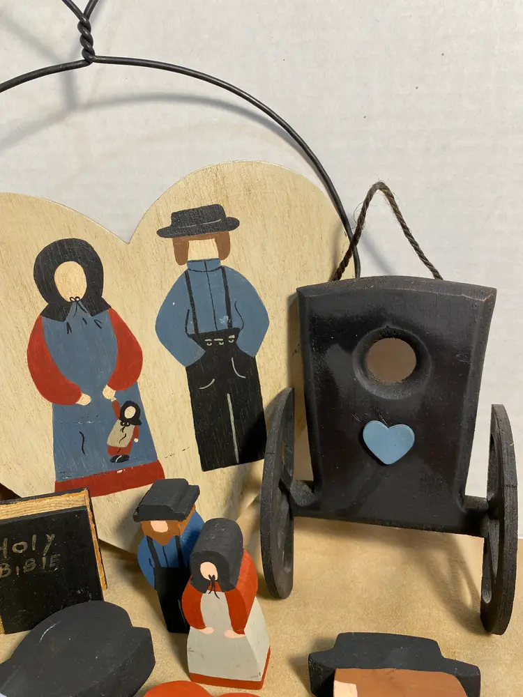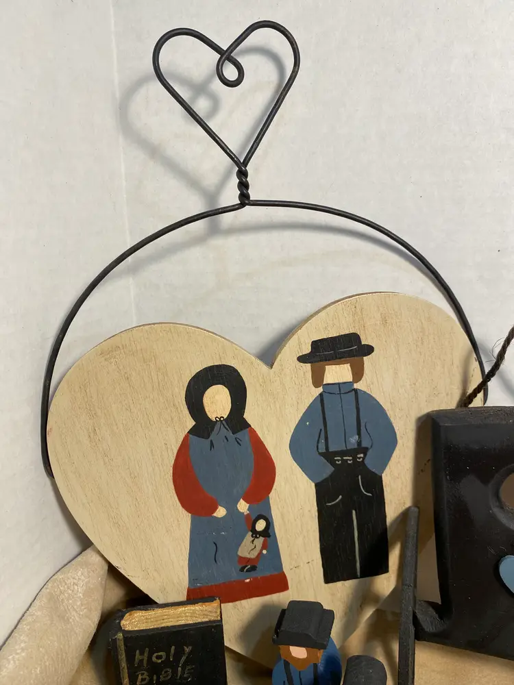 All pieces are medium to small, no piece is bigger then 1 foot. Wire hanging heart, wooden buggy back, two wooden Amish figures, wooden bible, boy and girl holding heart shelf setter. All are hand painted.