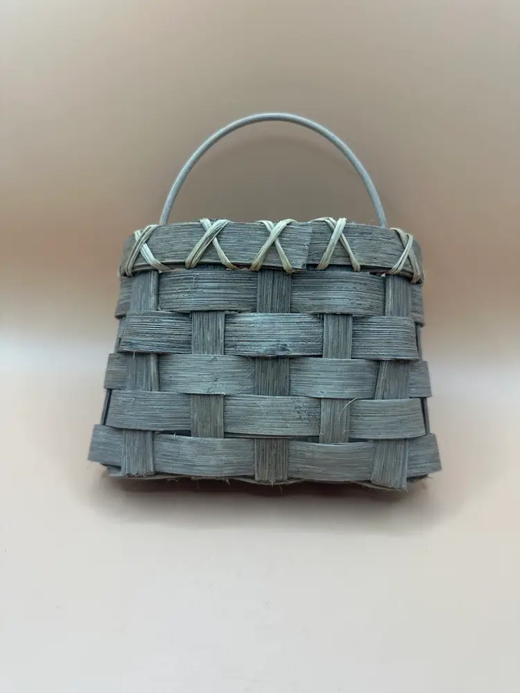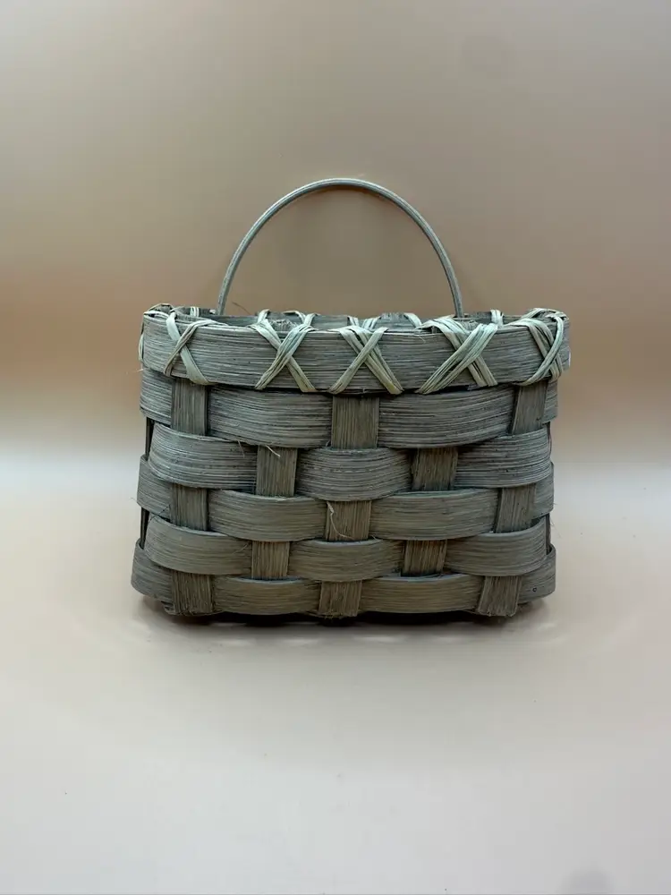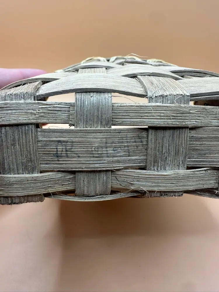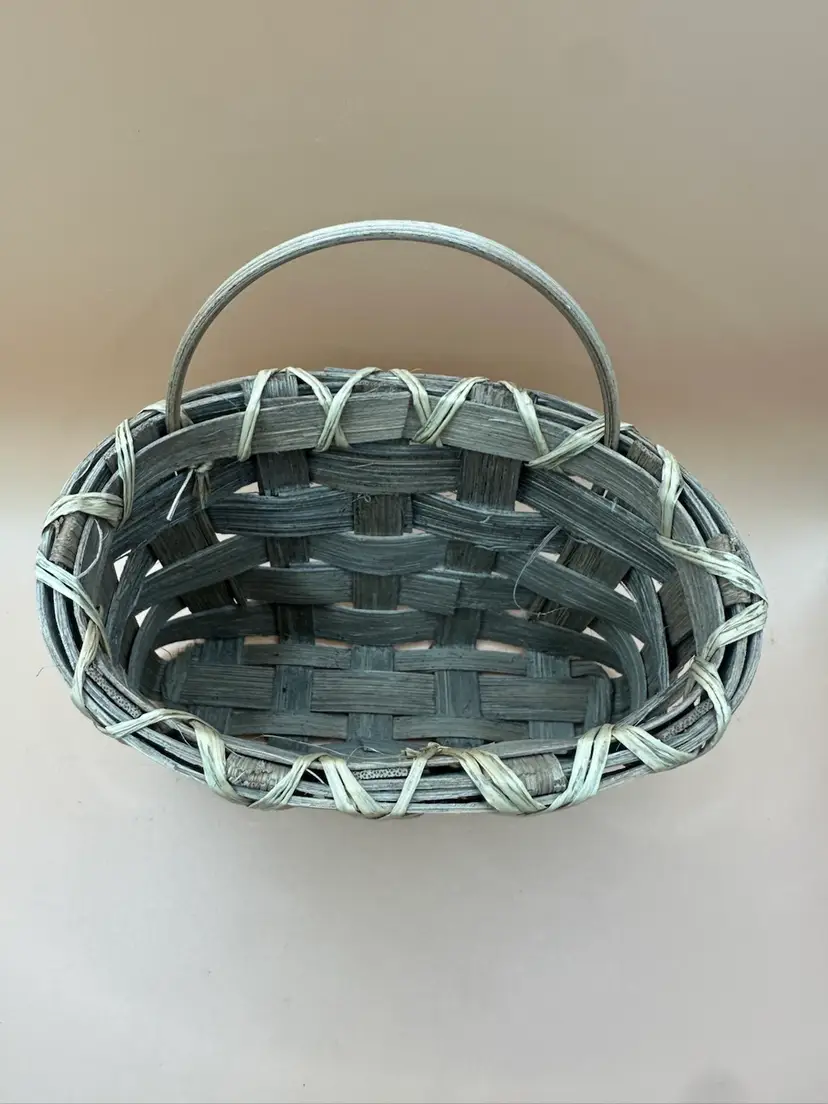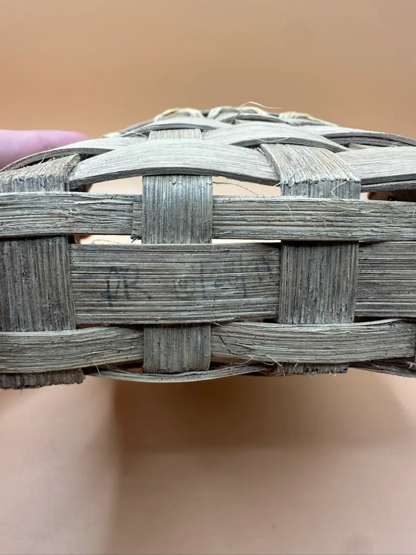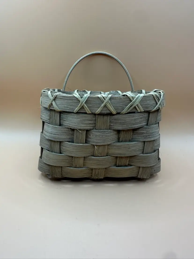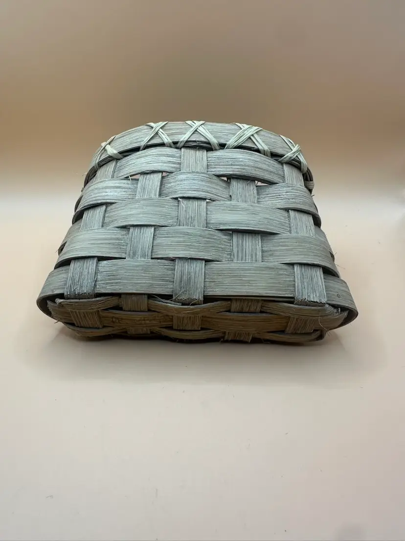 This vintage handmade woven basket signed and dated by the artist in 1990 is a unique piece of art made of wood with a beige color. The basket features a rectangular shape and is designed with a woven pattern. It has a country cottage style and is ideal for all occasions, perfect for any room in the house. With its natural finish and handle, this one-of-a-kind item from the late 20th century is a charming addition to any collection. Measures 5.5 inches length 4 inch height 3.5 inch width.
