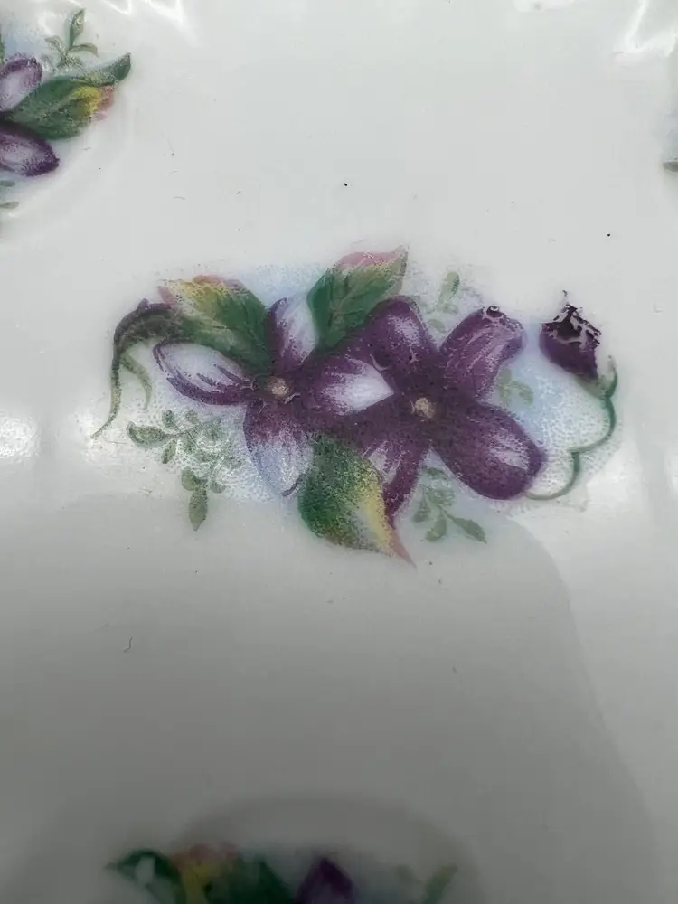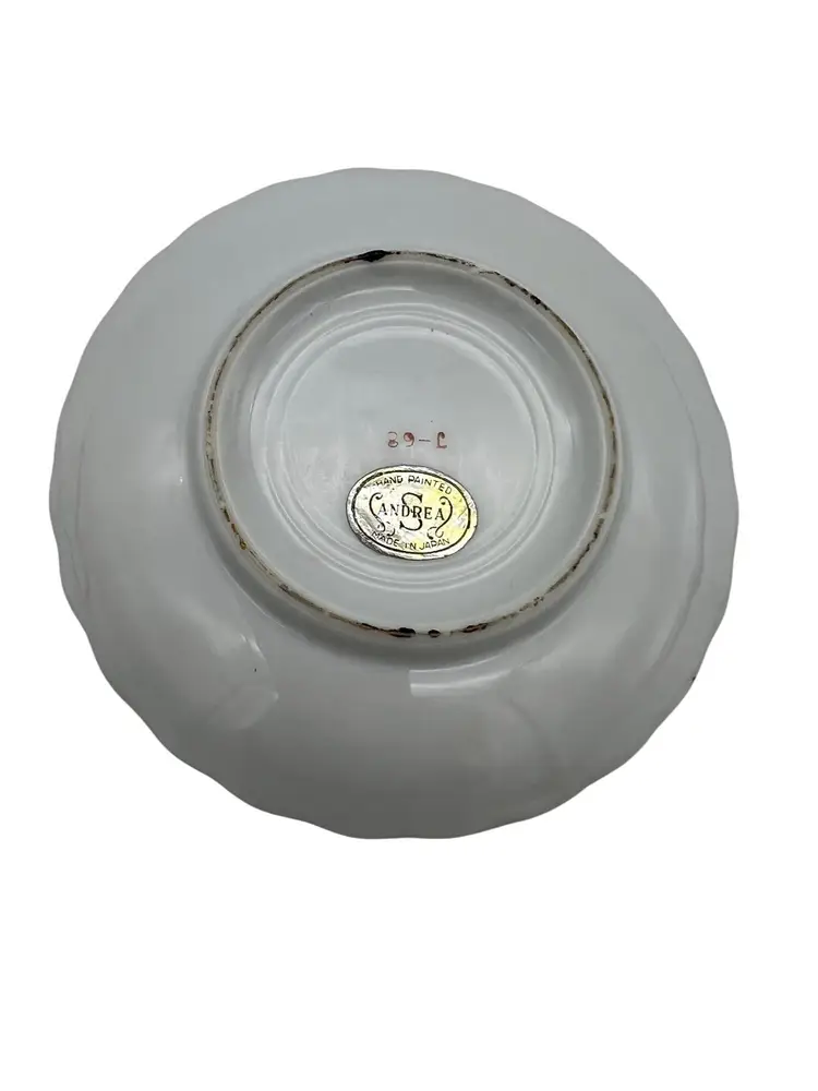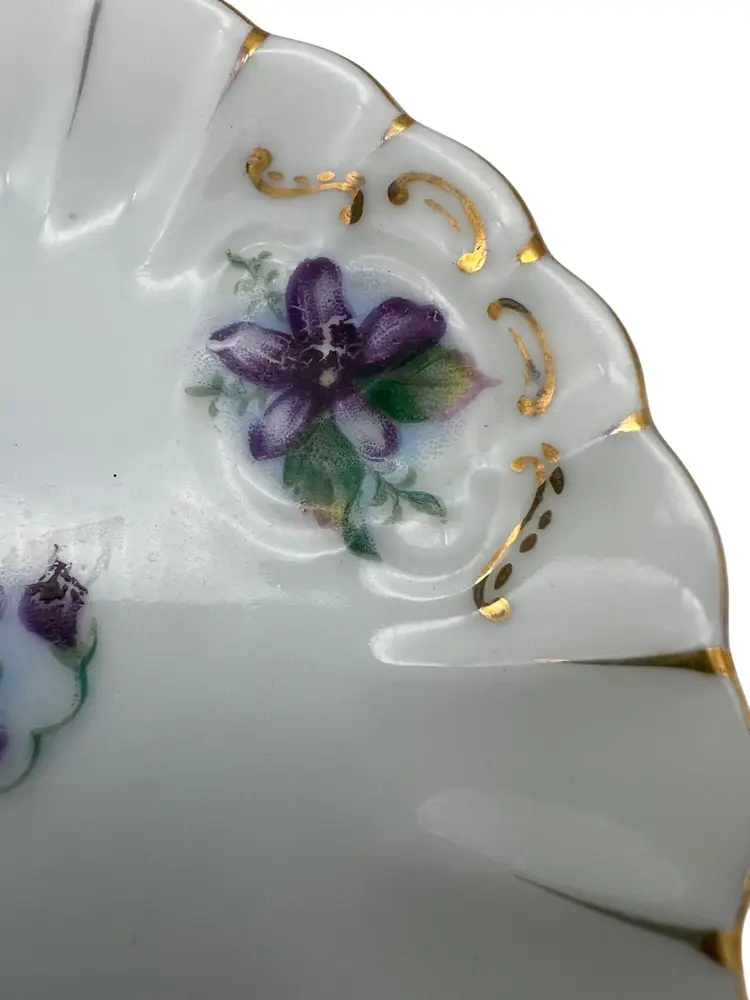 This vintage porcelain hand-painted miniature plate features a purple floral design and a gold-trimmed scalloped edge. It was made by Andrea in Japan. The plate measures 4.25" across.