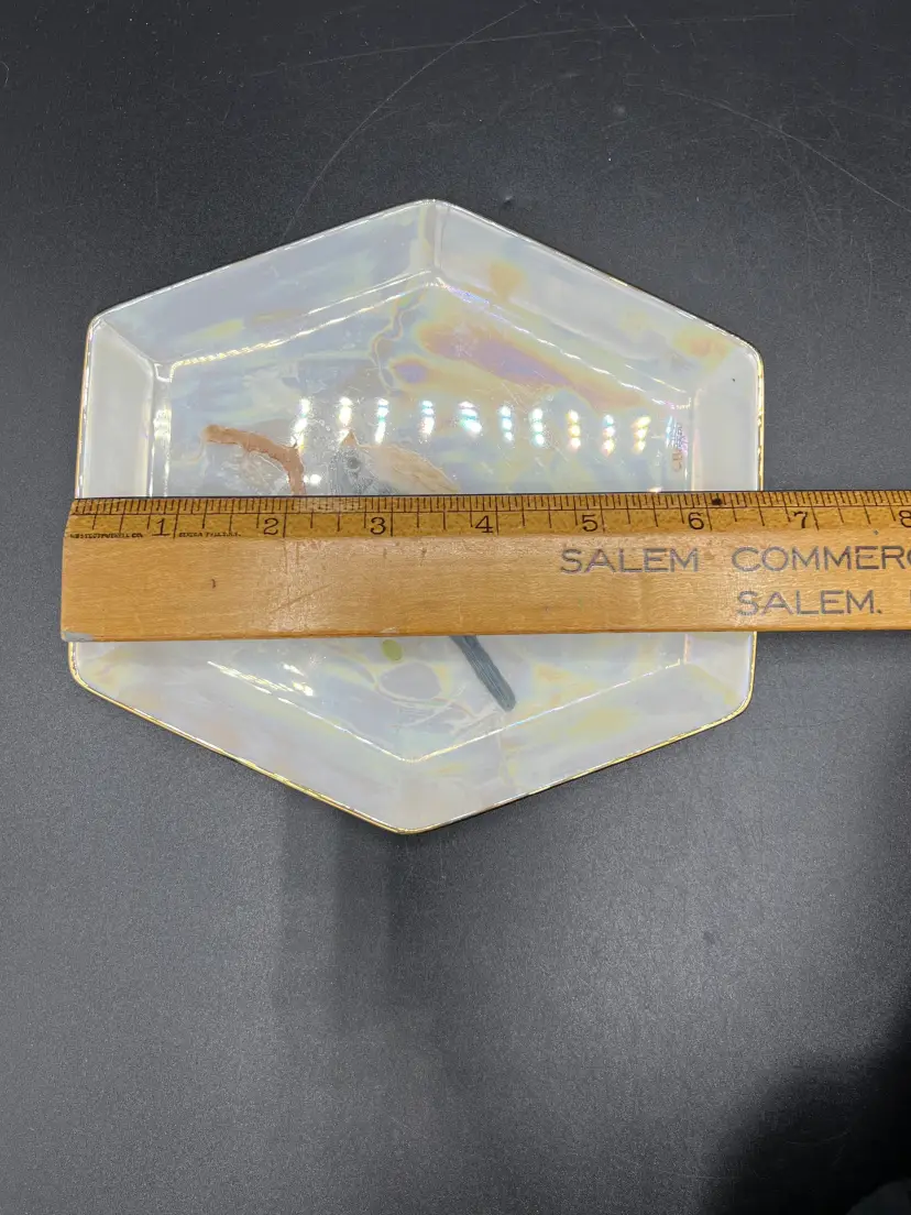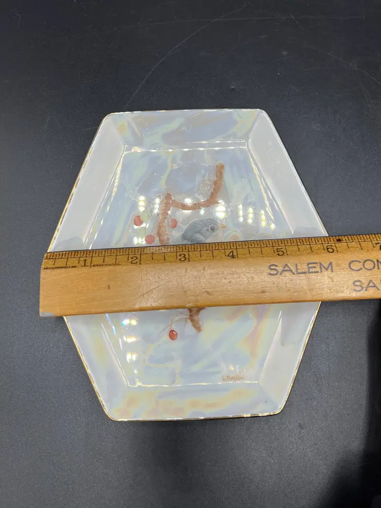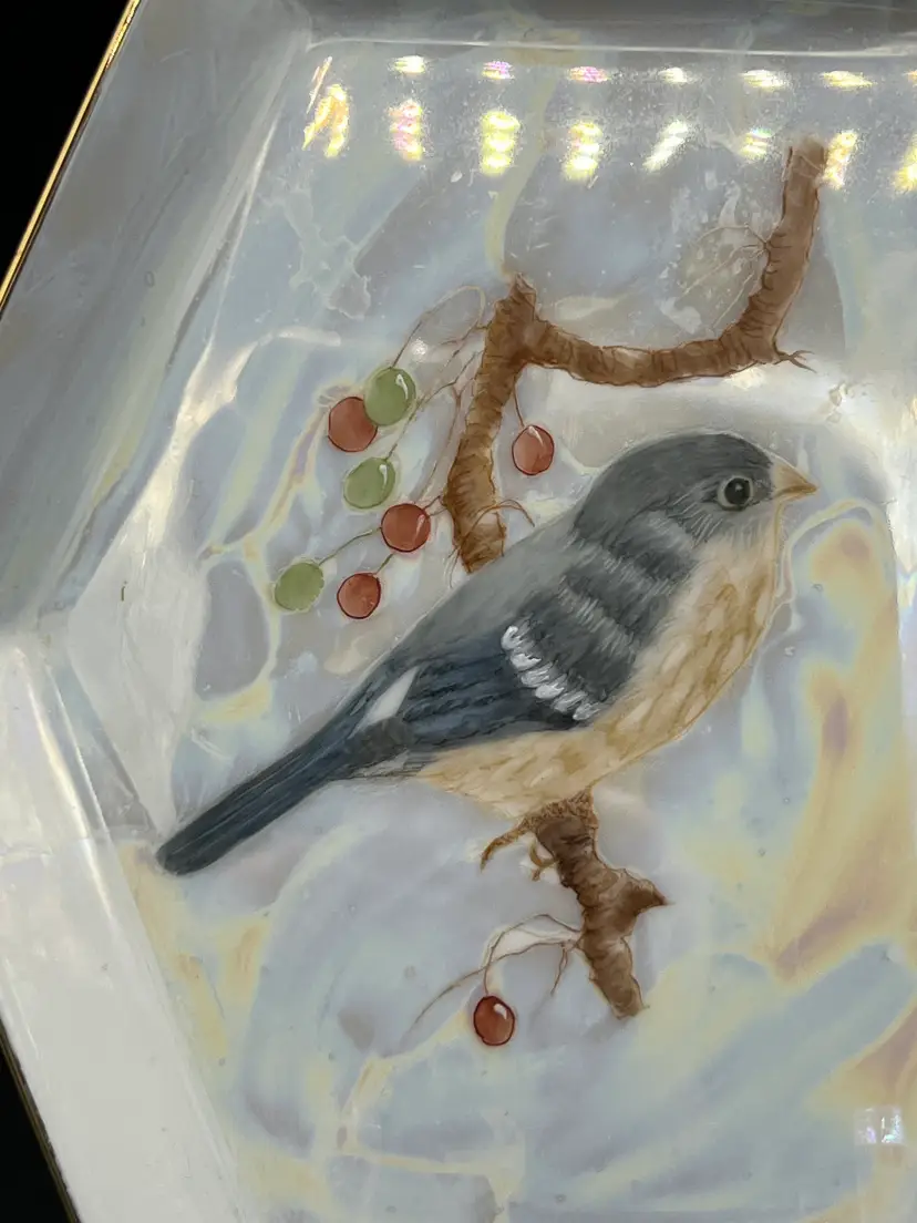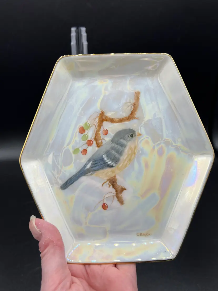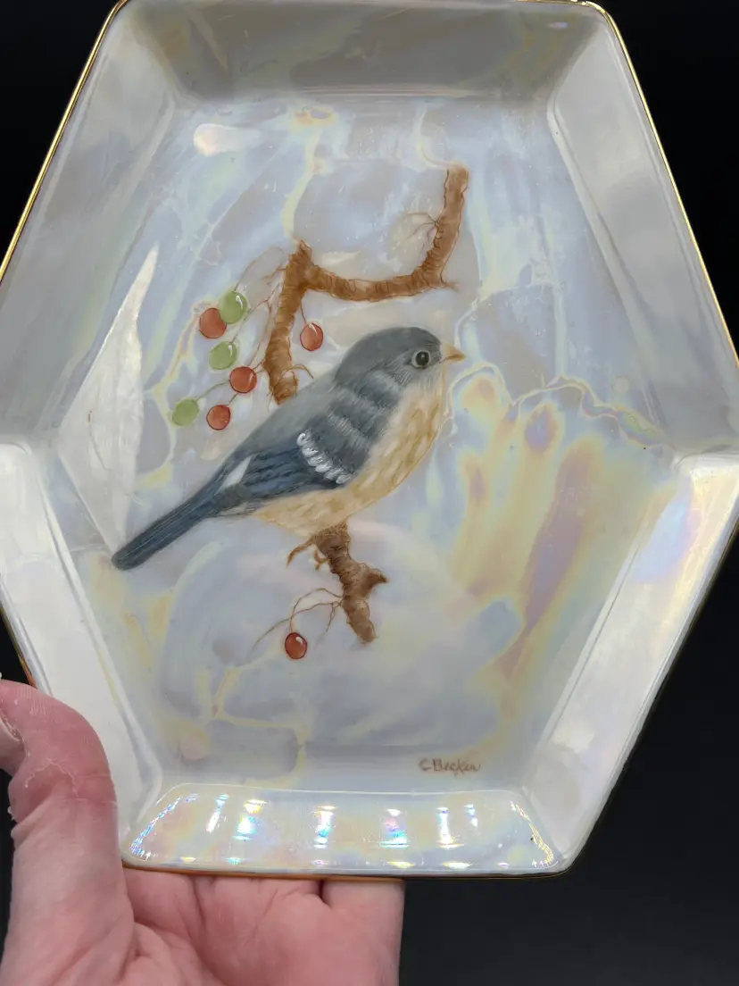 This beautiful vintage, 1930s – 40s hand-painted lustreware dish is decorated with a lovely bullfinch sitting atop a branch with red berries. The painting is delicately done and signed "CBecker". The dish itself is white opalescent lustreware with gold trim and shaped like a hexagon. This piece is dainty and would add a touch of whimsy to any decor.