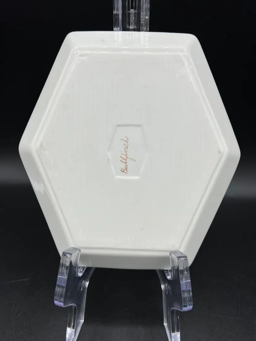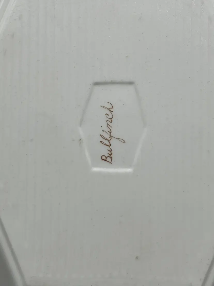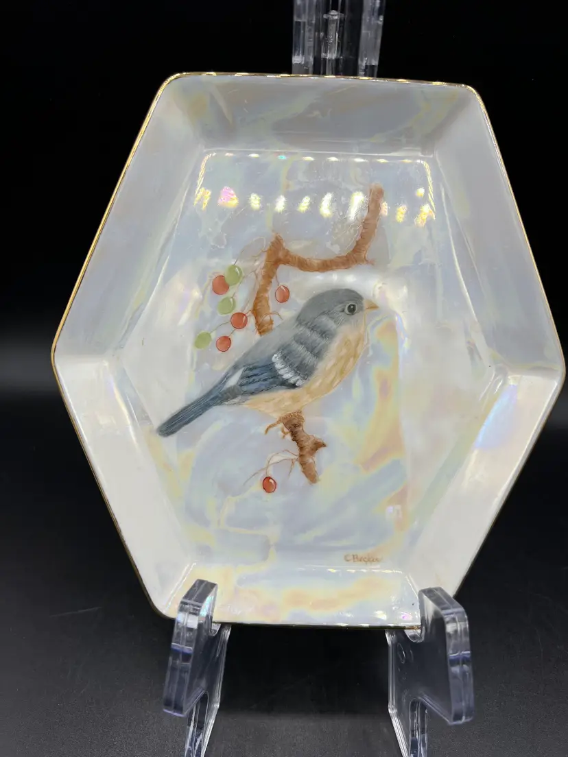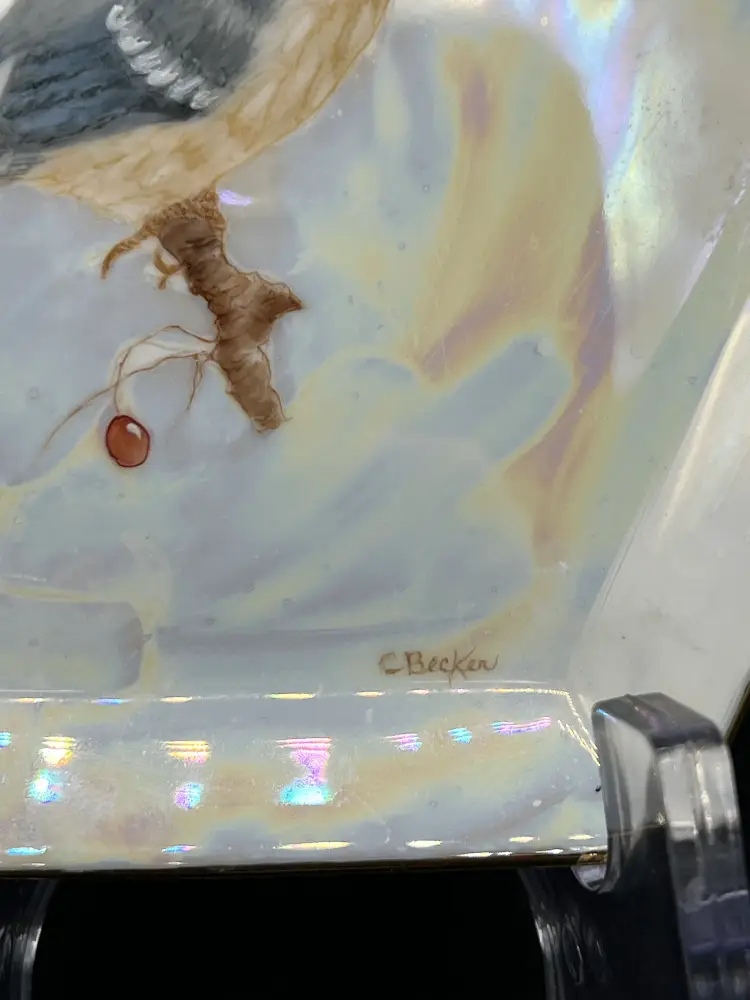 It is hand-signed by "C Becker on the front, and the back is hand-labeled "Bull Finch". It is in good condition. No chips, cracks, or crazing. There is slight wear to the gold trim.