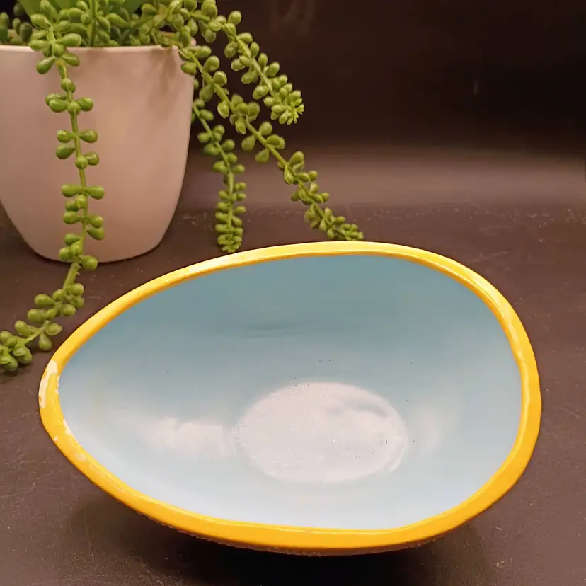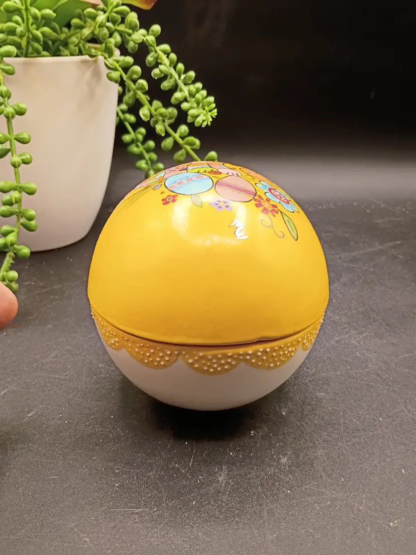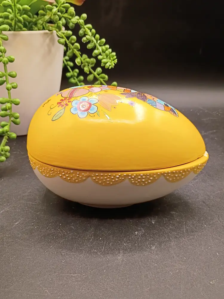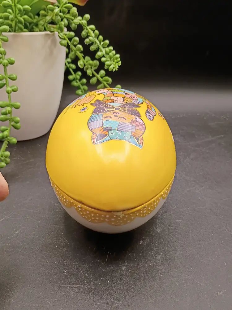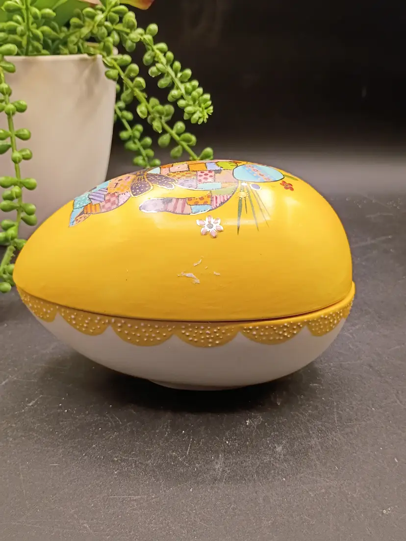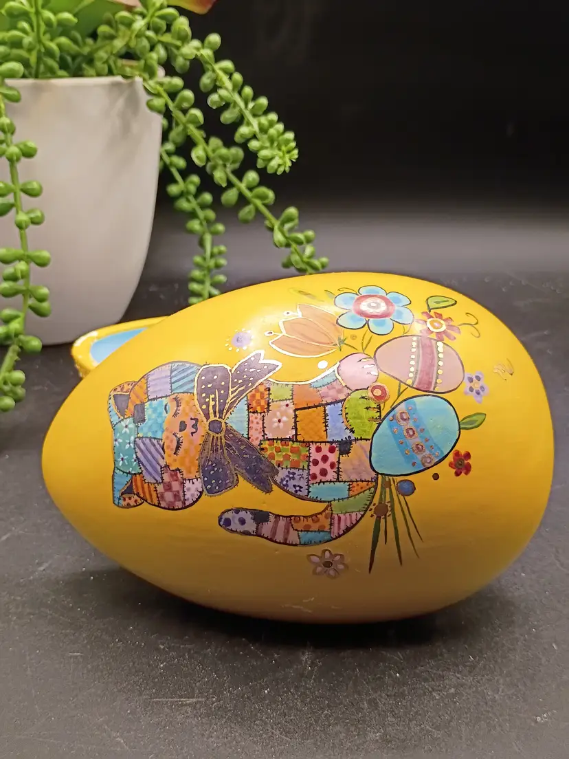 This vintage handpainted ceramic egg with patchwork cat design and yellow and white outside with Lovely Blue interior is an unique and charming decorative collectible perfect for Easter. The egg is marked with the name "Marie" from 1970, adding a nostalgic touch to its appeal. The intricate detailing and handpainted design make it a special piece for any collector or lover of vintage decor. HOBBYIST PIECE