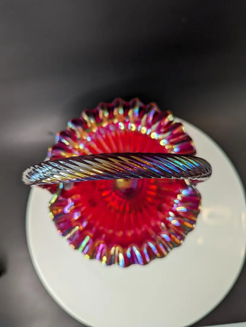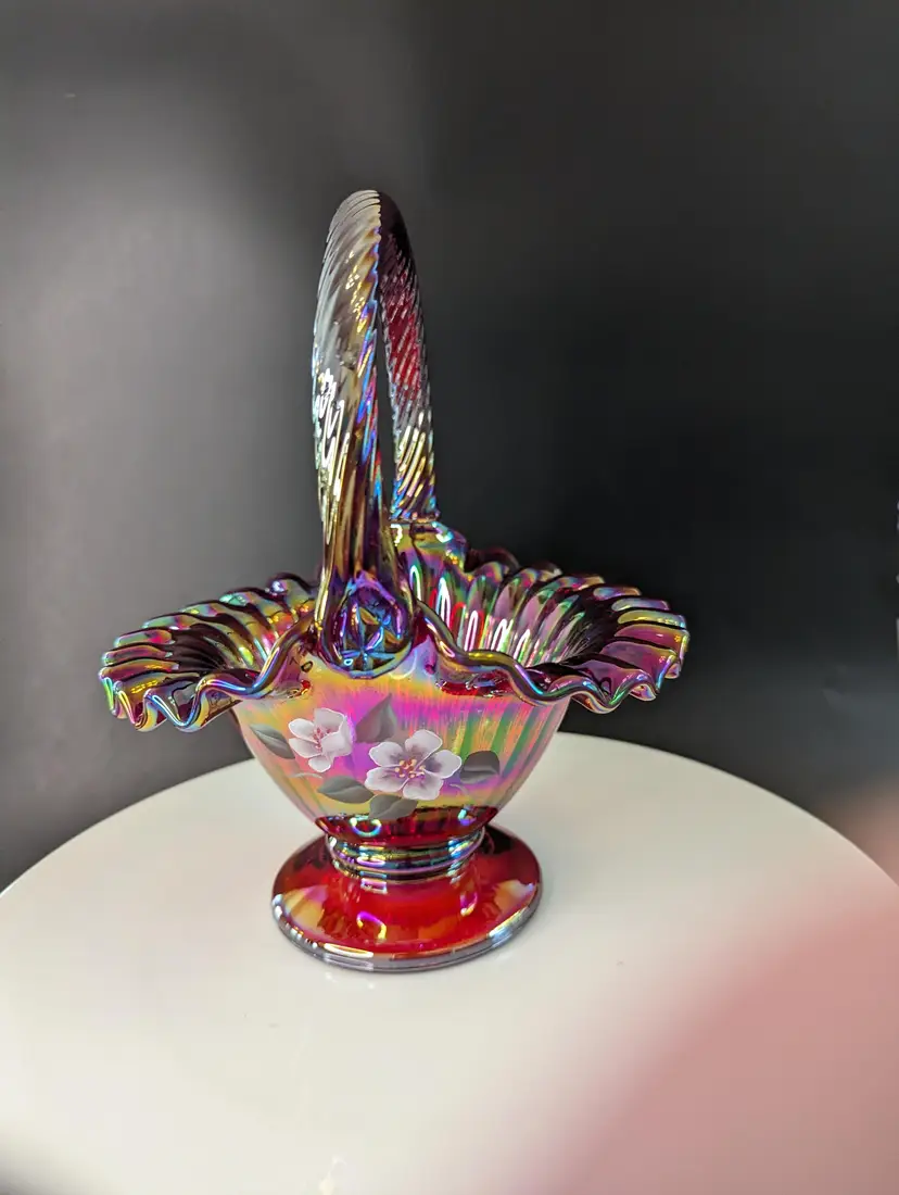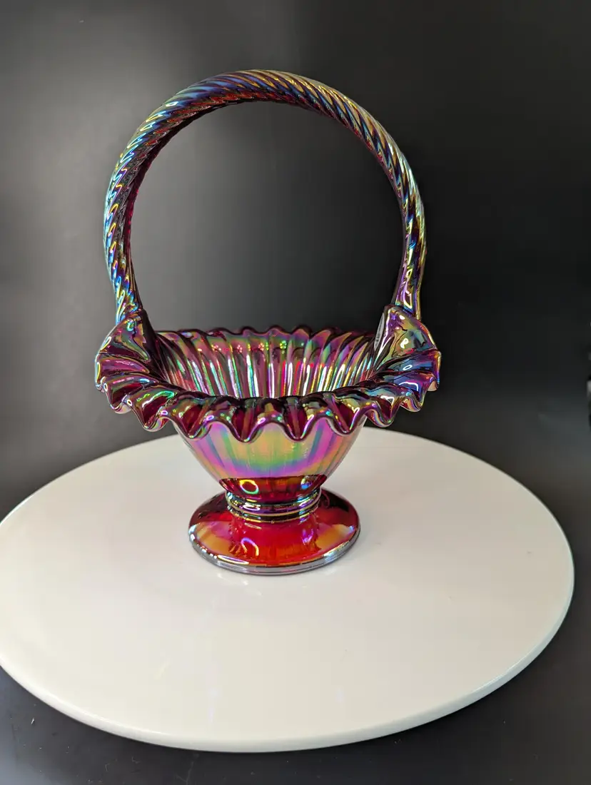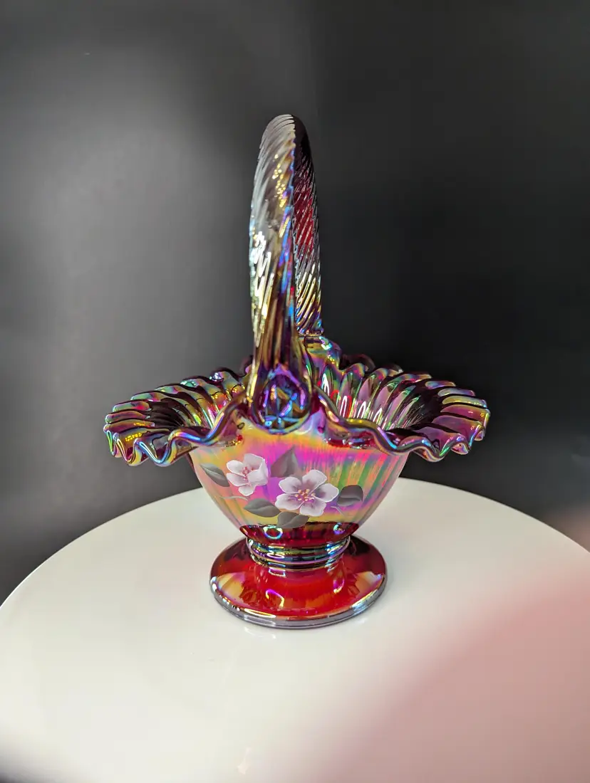 Add a splash of color to your home with this stunning vintage carnival glass basket. Featuring a vibrant iridescent finish and delicate hand-painted floral design, this piece is perfect for display or as a unique gift. Measures approximately 8 inches in height. Excellent condition. Please note that I'm happy to accept returns if you are unhappy with your purchase (buyer pays return shipping) and I'm happy to bundle items if more than one is purchased (as is safe) to save on shipping. I also refund shipping overages. Please let me know if you have any questions!
