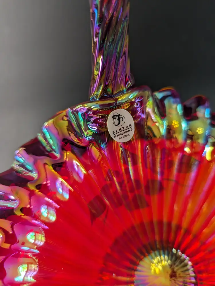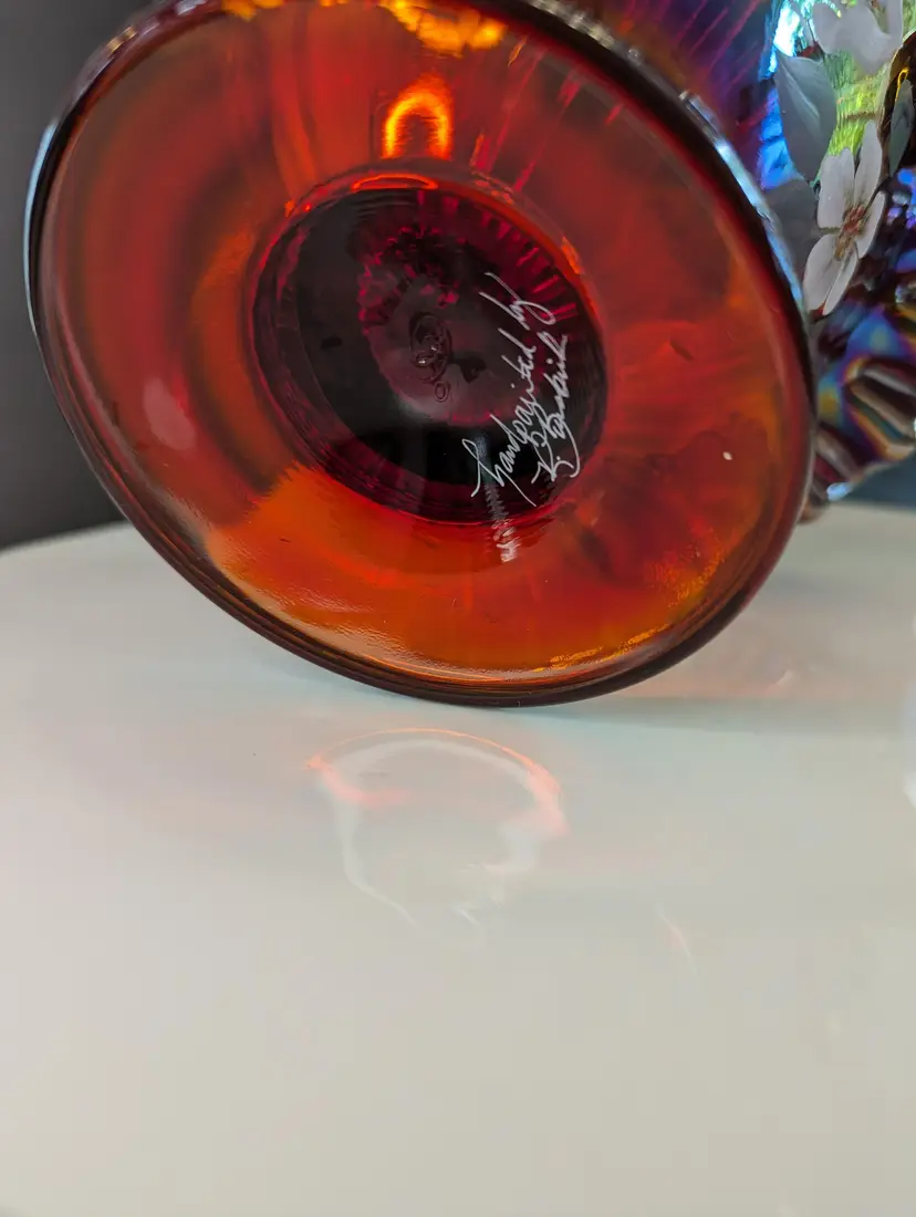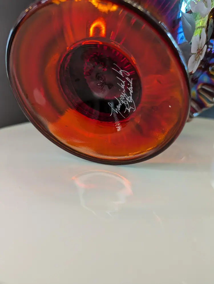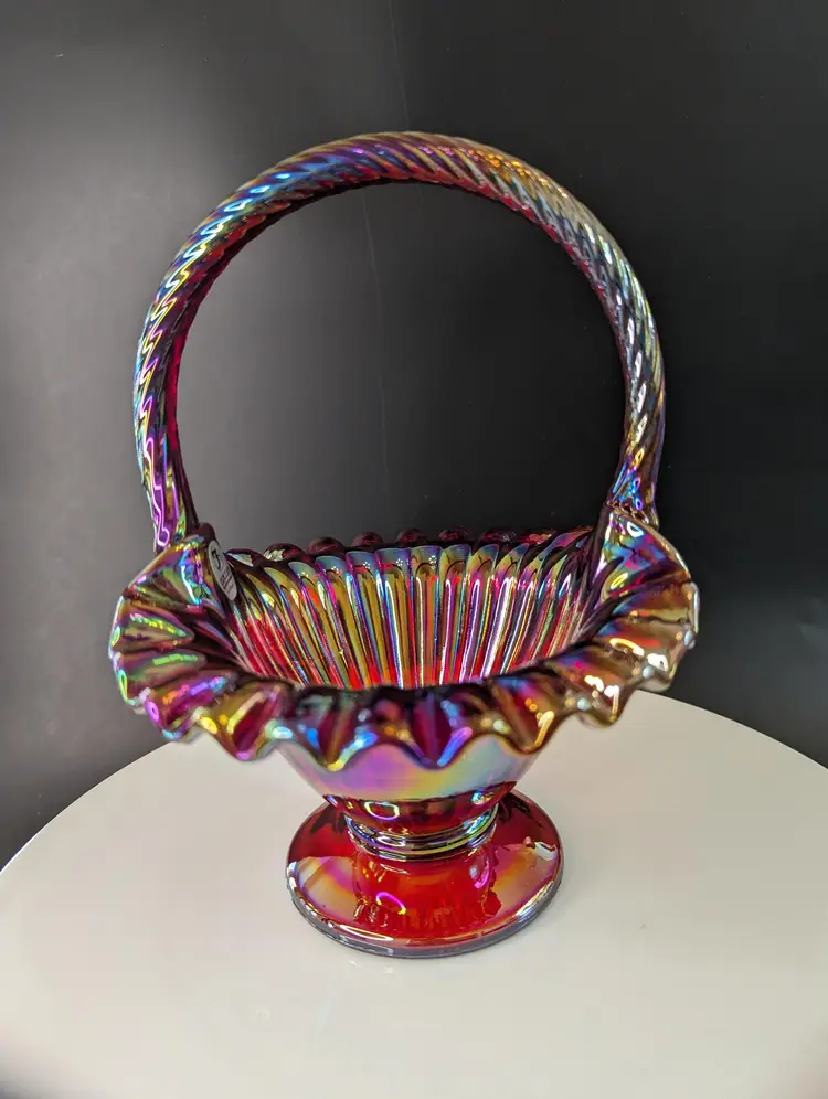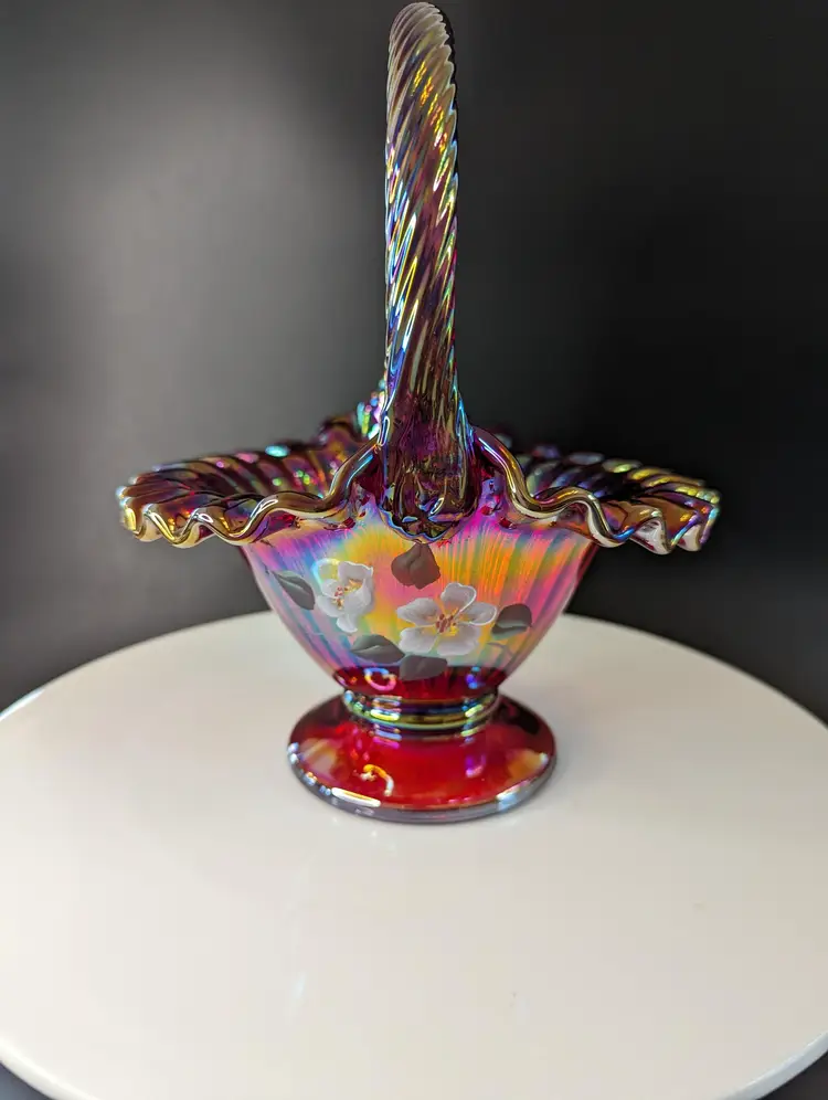 Add a splash of color to your home with this stunning vintage carnival glass basket. Featuring a vibrant iridescent finish and delicate hand-painted floral design, this piece is perfect for display or as a unique gift. Measures approximately 8 inches in height. Excellent condition. Please note that I'm happy to accept returns if you are unhappy with your purchase (buyer pays return shipping) and I'm happy to bundle items if more than one is purchased (as is safe) to save on shipping. I also refund shipping overages. Please let me know if you have any questions!