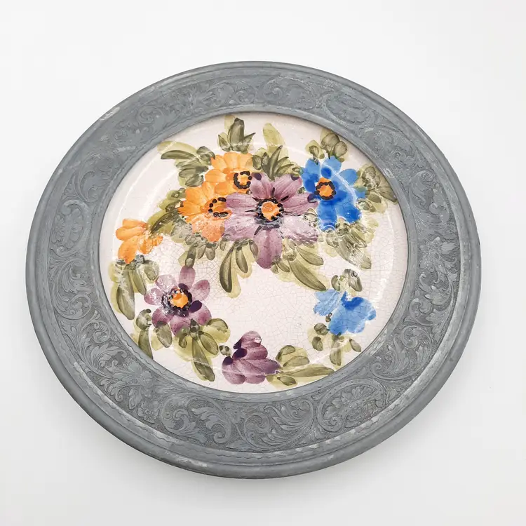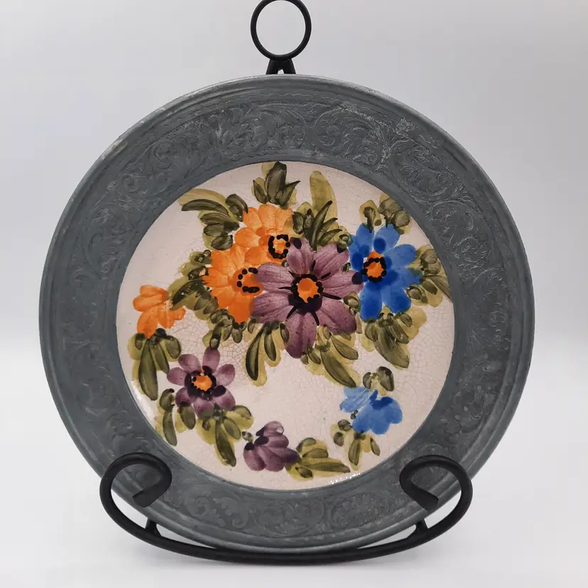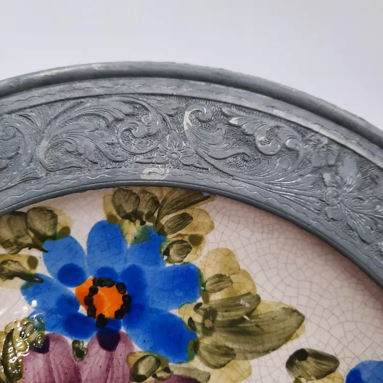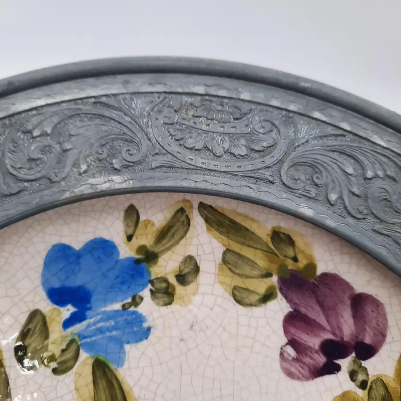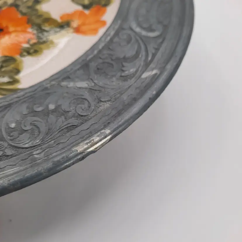 This beautiful plate measures 8 1/4", does have some wear from age to plate and oxidation on pewter rim.