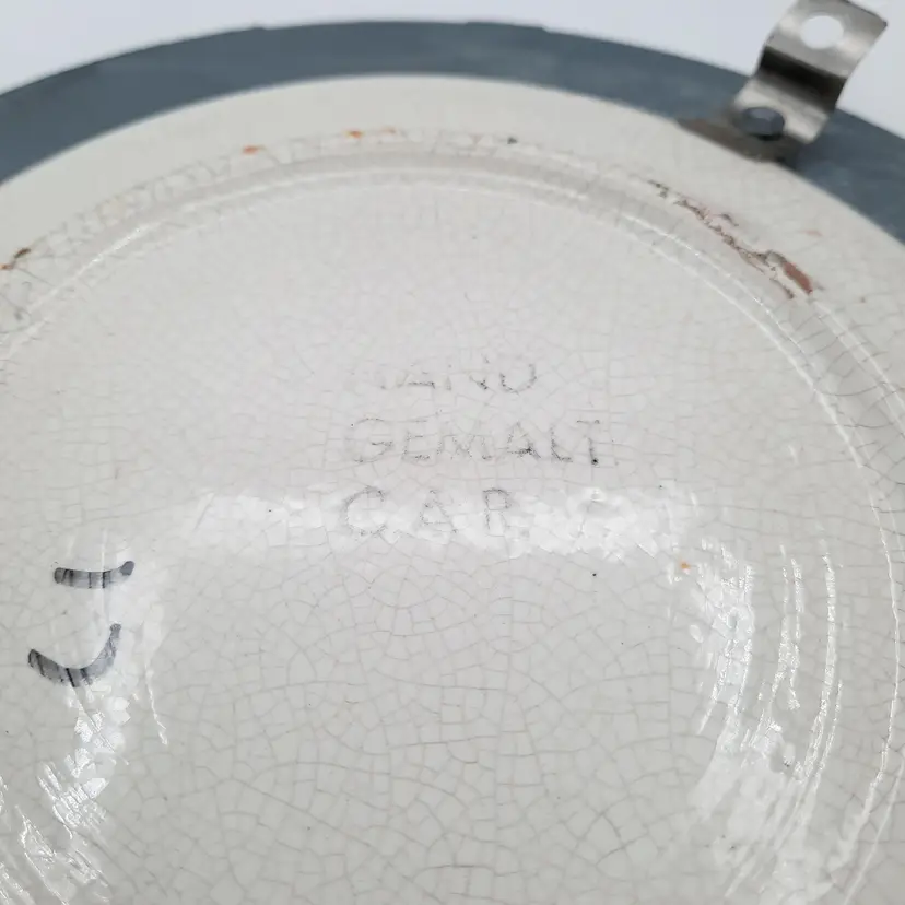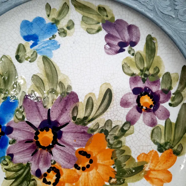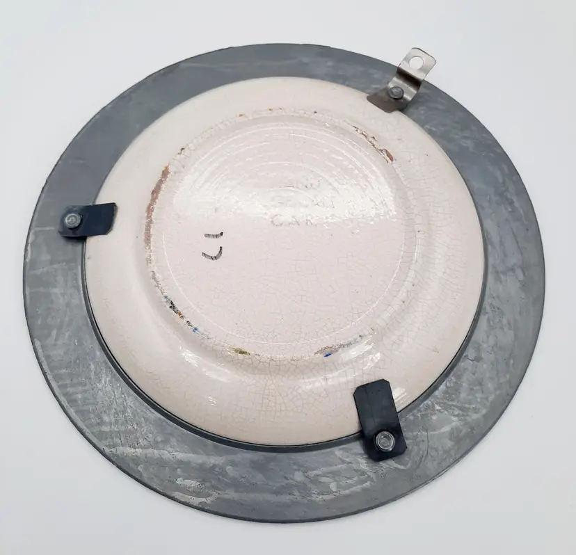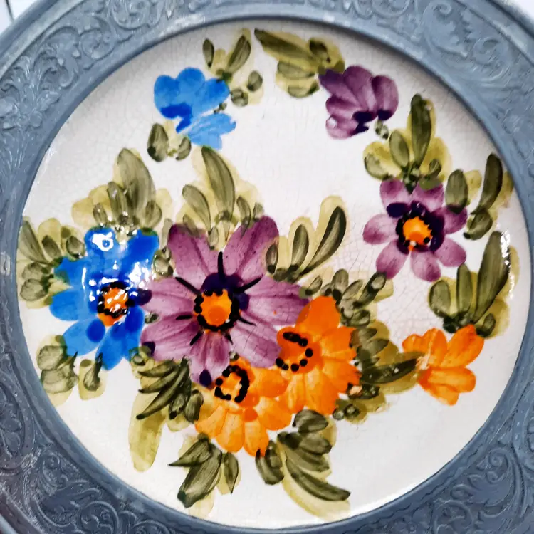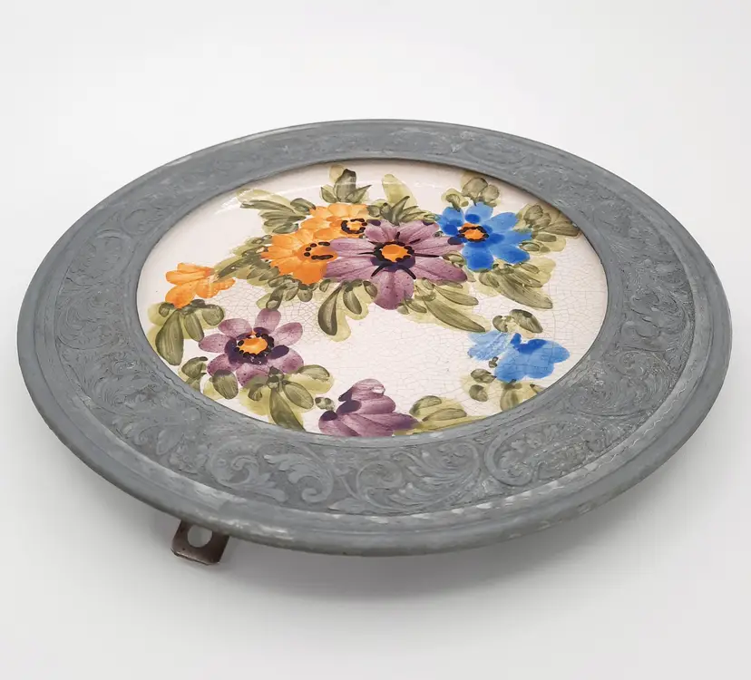 This beautiful plate measures 8 1/4", does have some wear from age to plate and oxidation on pewter rim.
