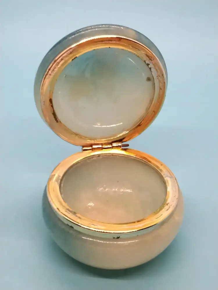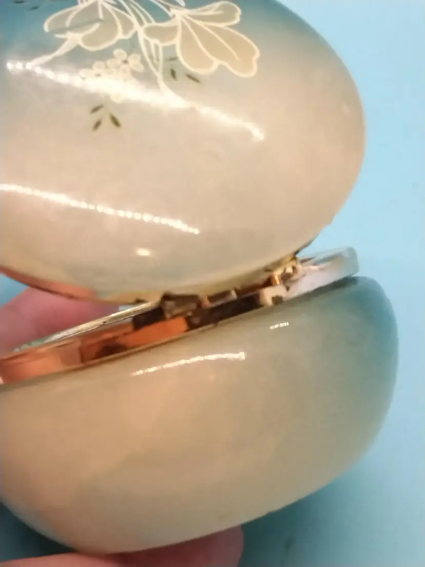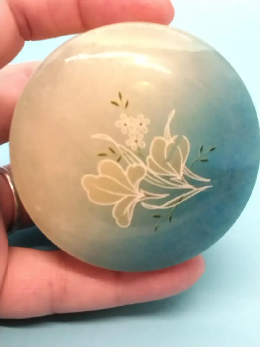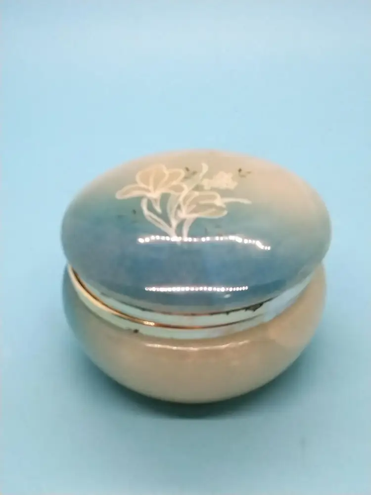 This charming vintage jade trinket box features a delicate floral design on a soft blue gradient background. Perfect for storing small keepsakes, jewelry, or other treasures. A lovely addition to any vanity or dresser.