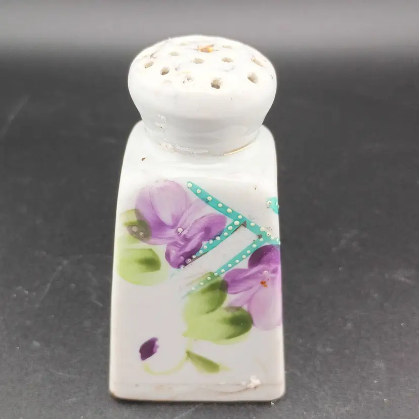 This little beauty would make a great hat pin holder--it's a single shaker with handpainted florals. It's in very good vintage condition with no chips or cracks and minimal wear.
