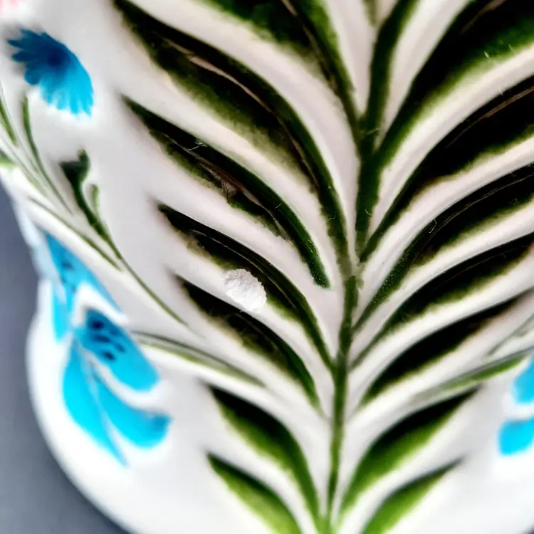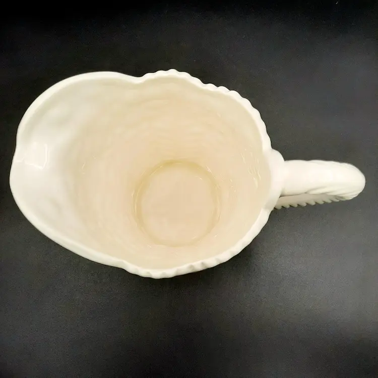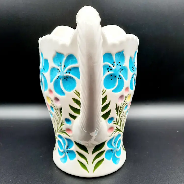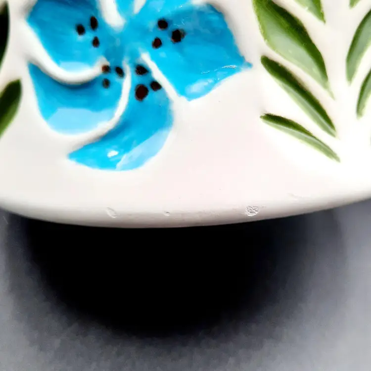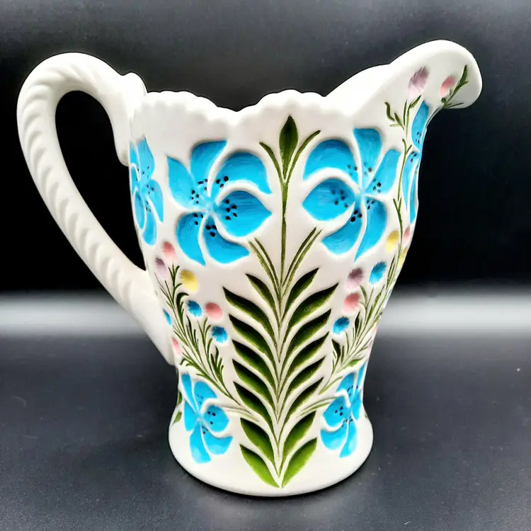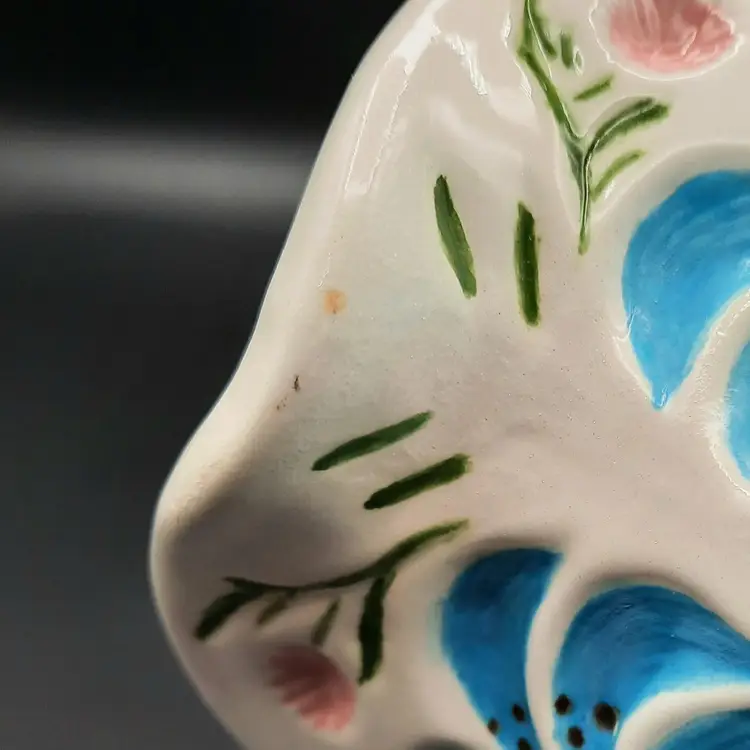 This beautiful pitcher with its vibrant colors and unique form is 8"H x 8 1/2"W spout to handle, does have some small chips, a defect on interior and some spots in glaze under spout