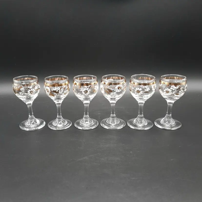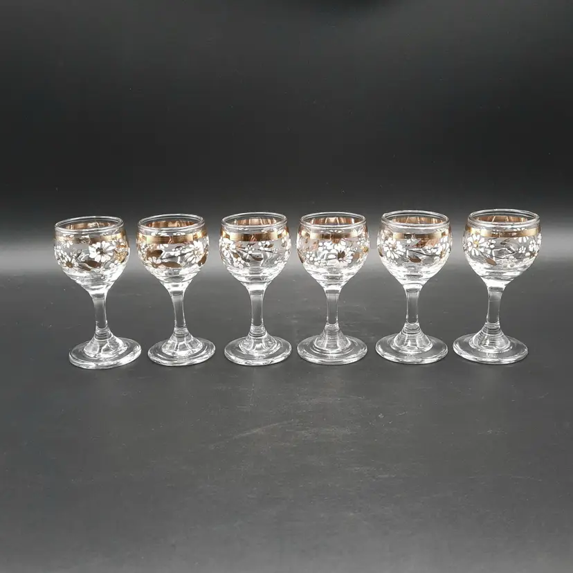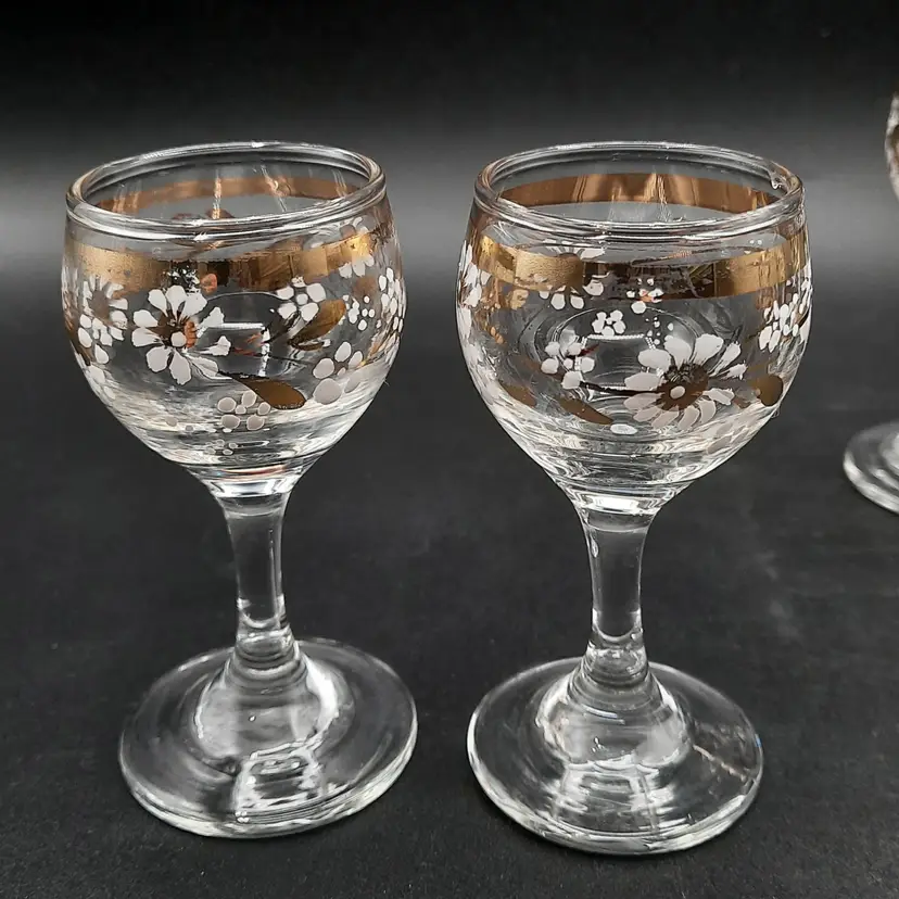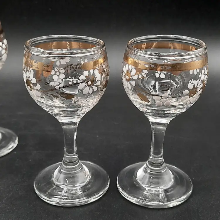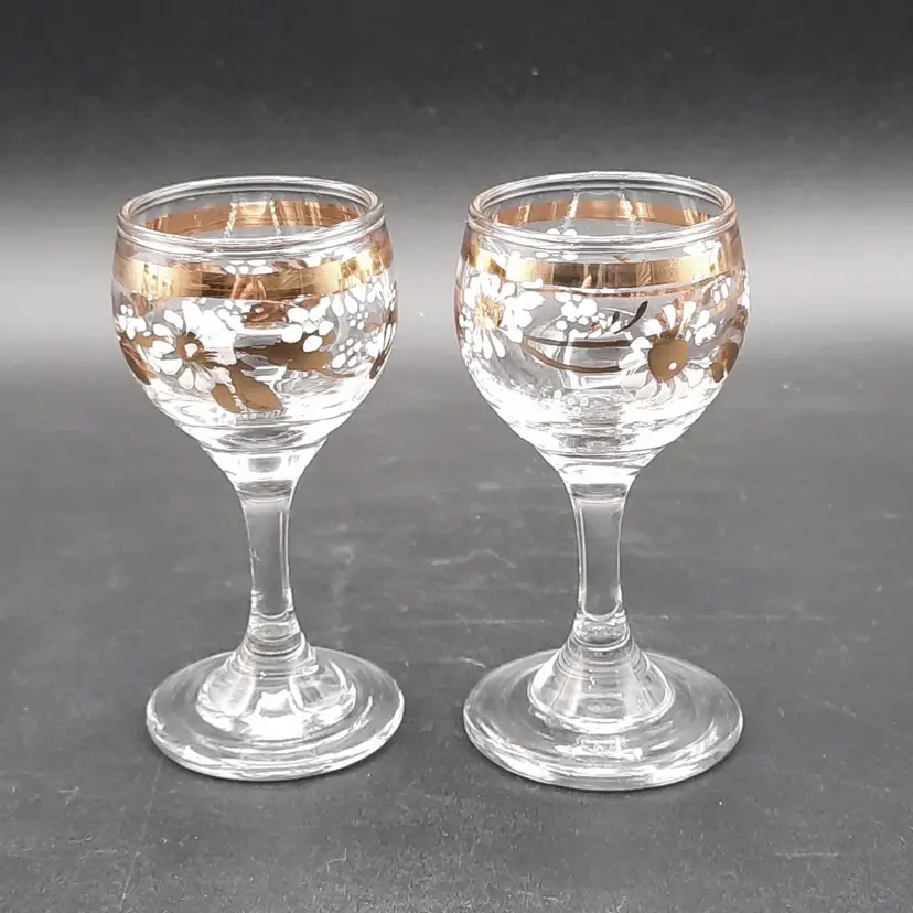 These beautiful cordial glasses are 3 1/4"H x 1 1/2"W, overall very good condition with some wear to gold bands around rim and one glass has a small mfg bump defect on inside of rim
