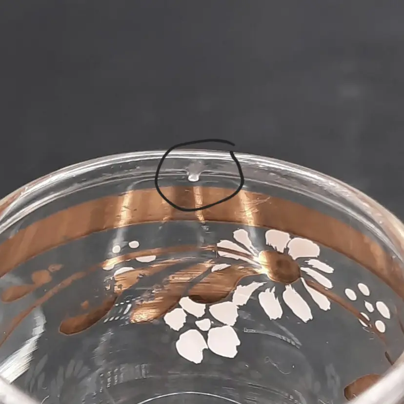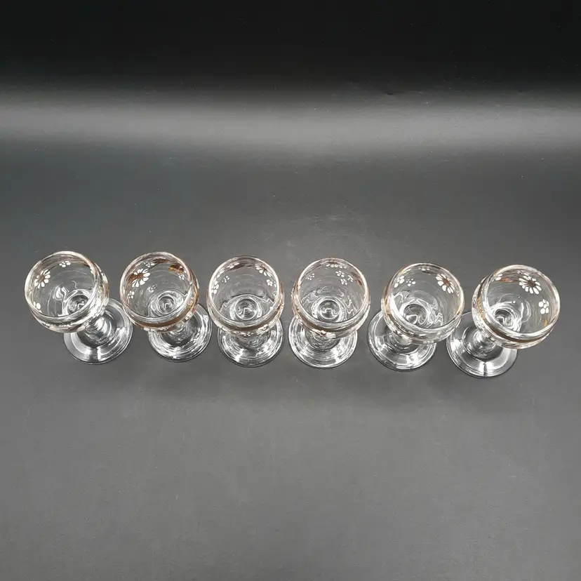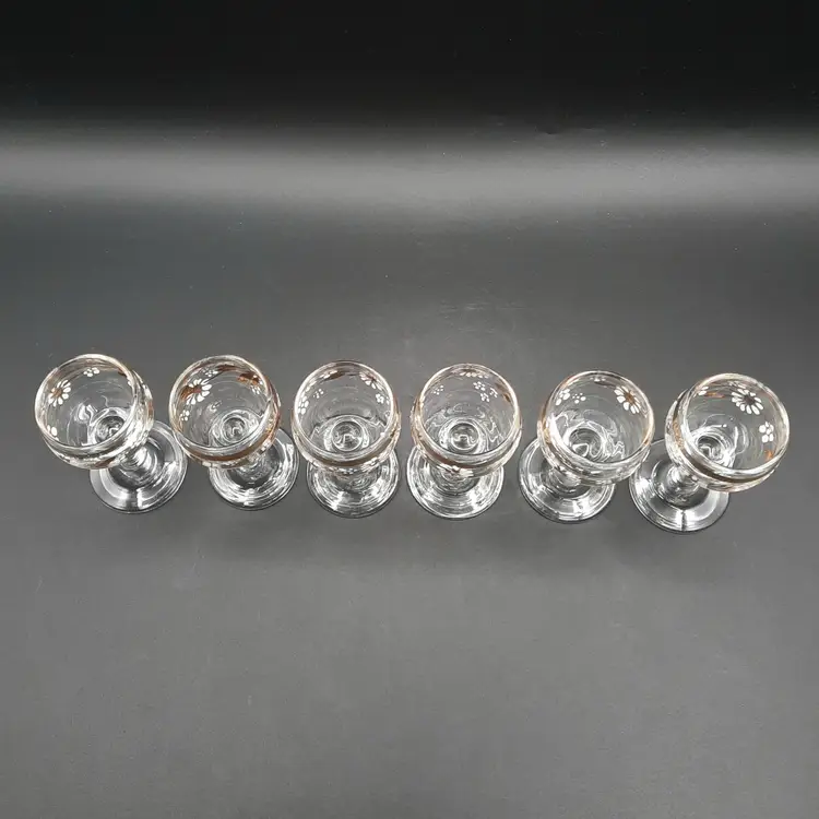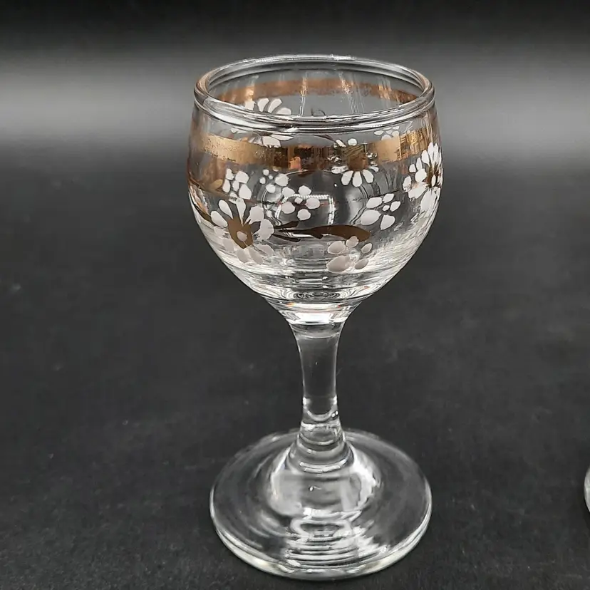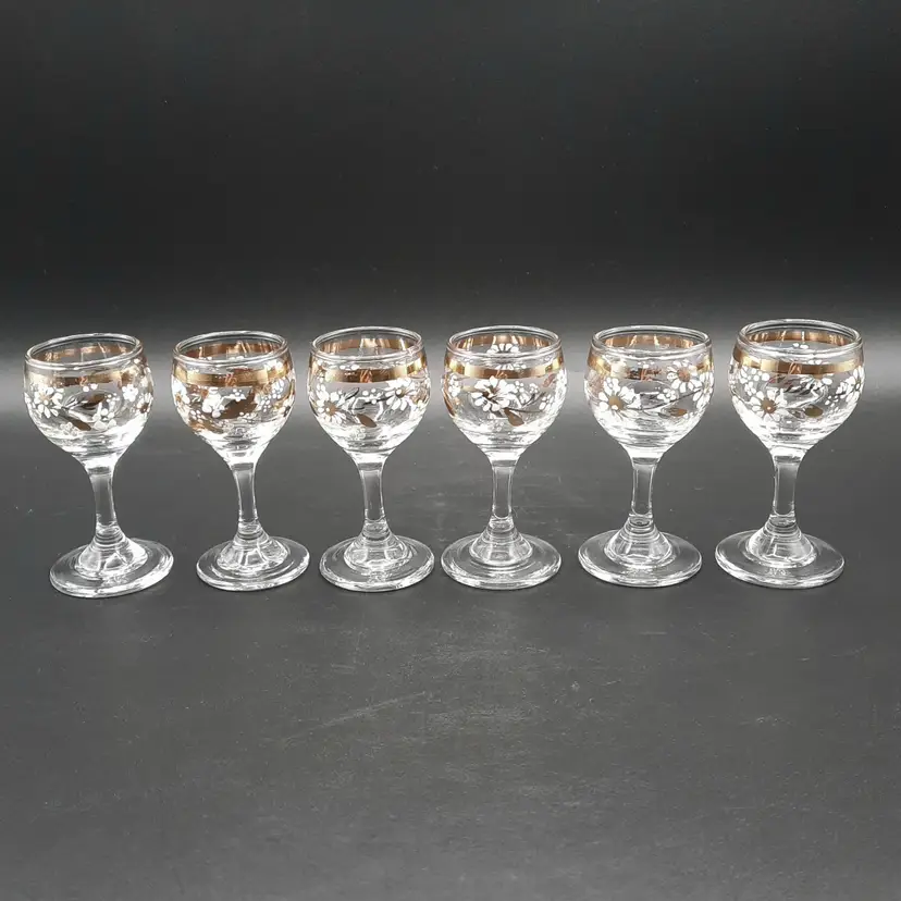 These beautiful cordial glasses are 3 1/4"H x 1 1/2"W, overall very good condition with some wear to gold bands around rim and one glass has a small mfg bump defect on inside of rim