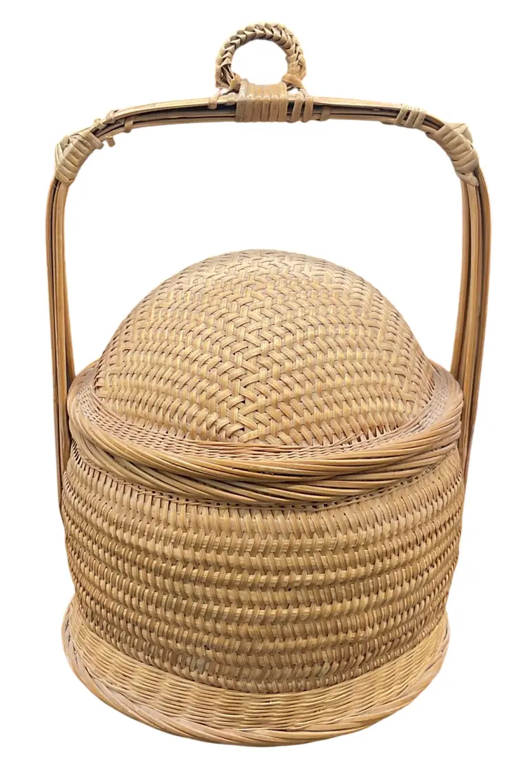 Vintage Handwoven Chinese Wedding Storage Basket With Intricate Lid & Handle