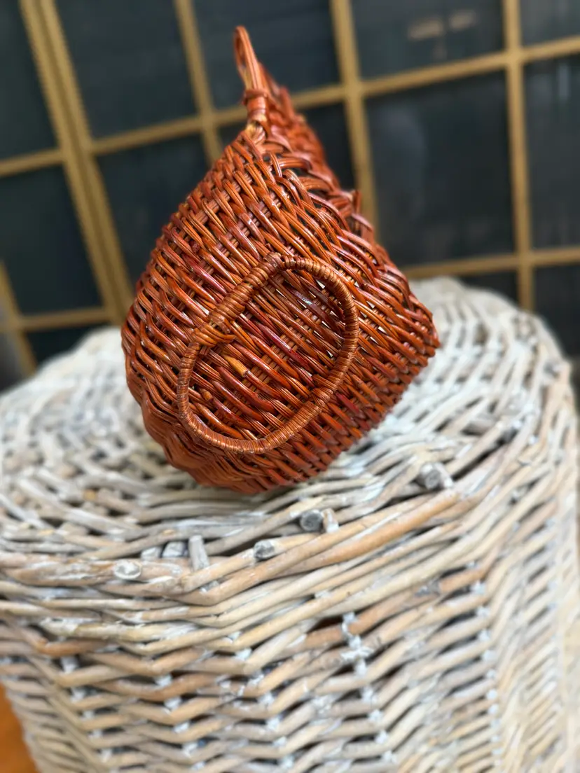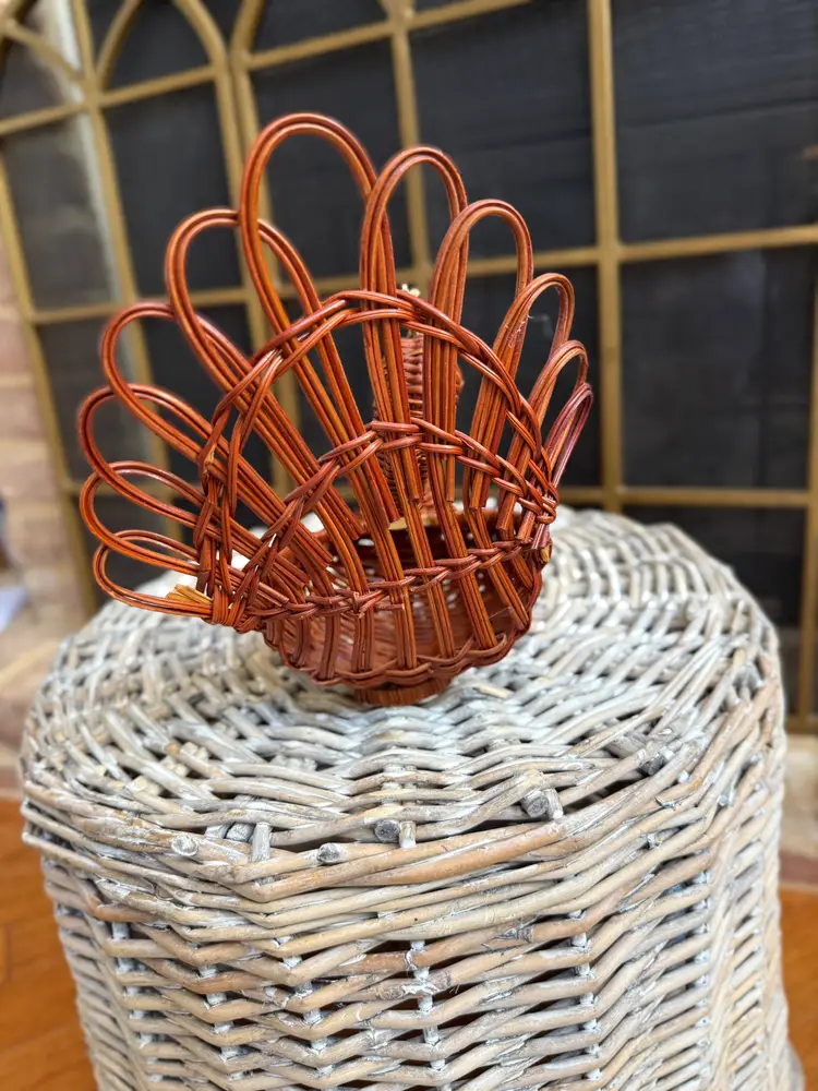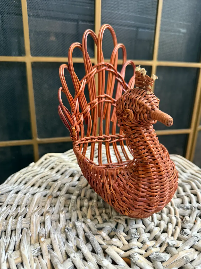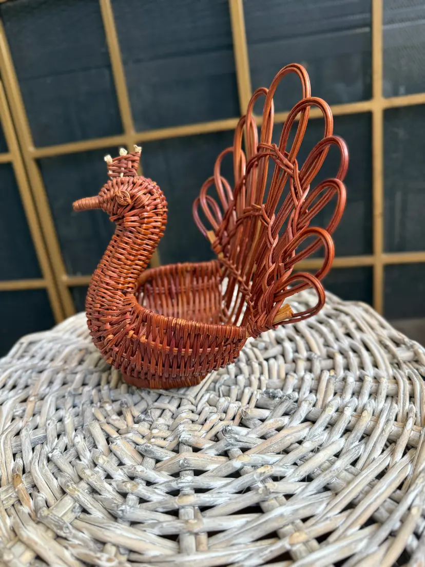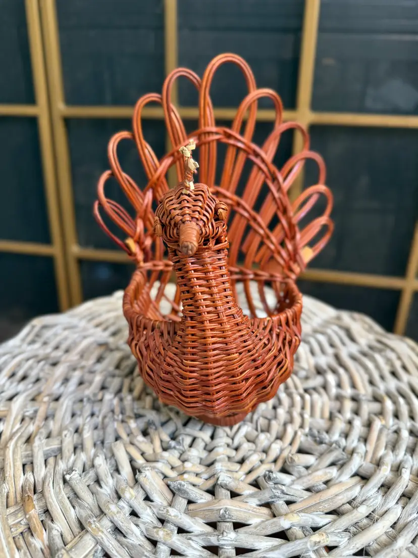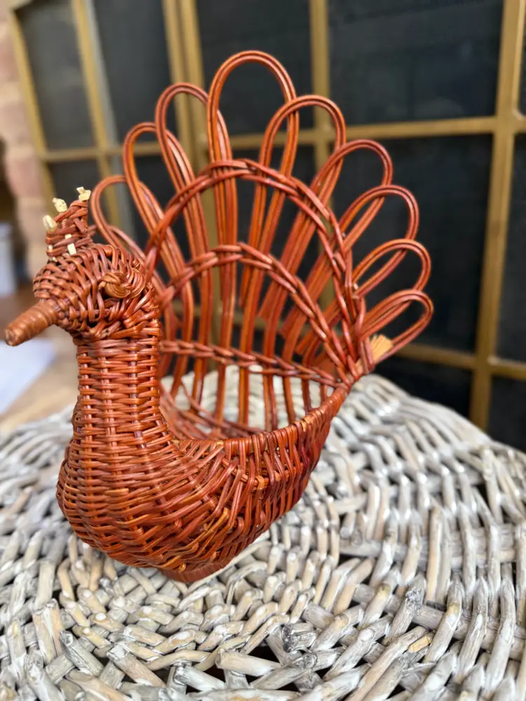 Bring a touch of rustic charm to your holiday table with this vintage wicker turkey basket. Handwoven with care, this decorative piece features a detailed turkey shape with fanned tail feathers – perfect as a Thanksgiving centerpiece, breadbasket, or candy holder.
