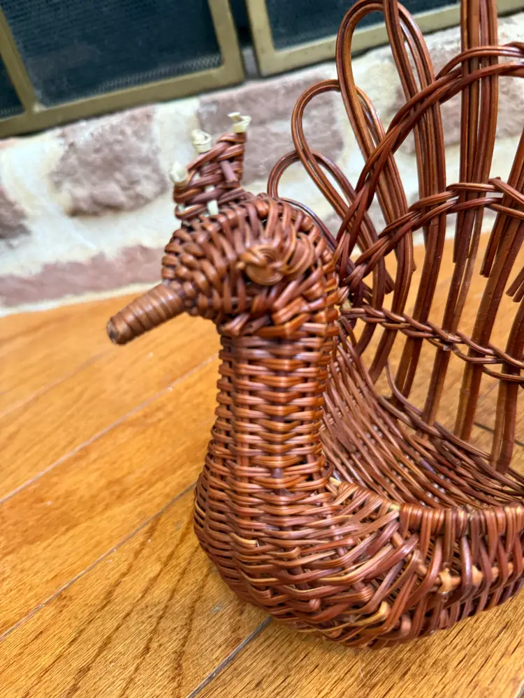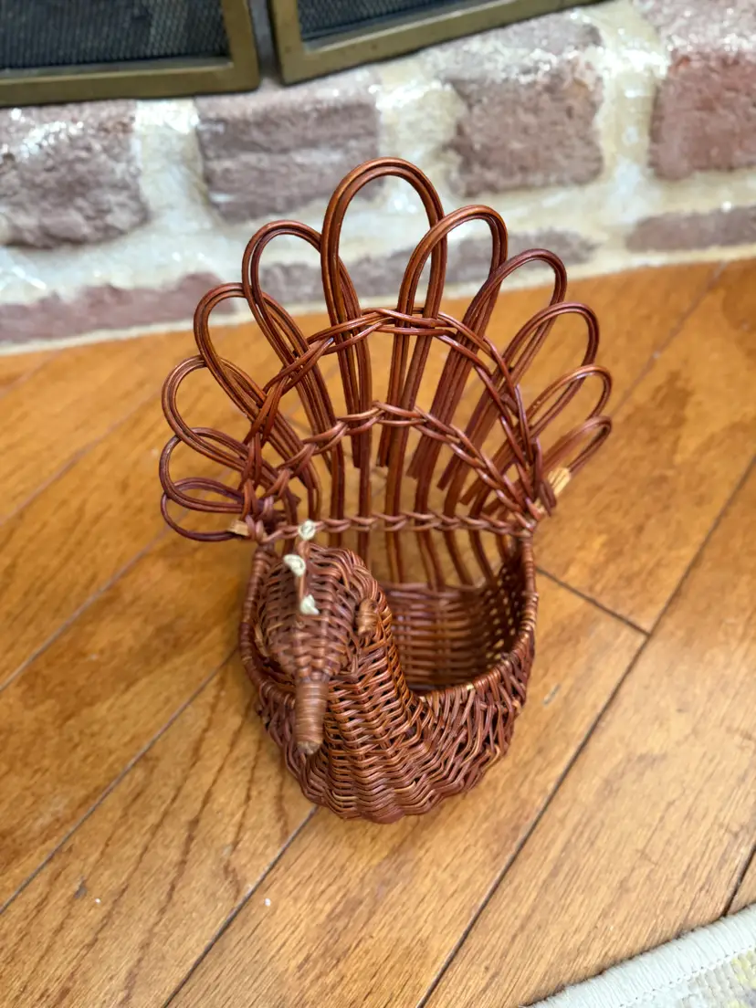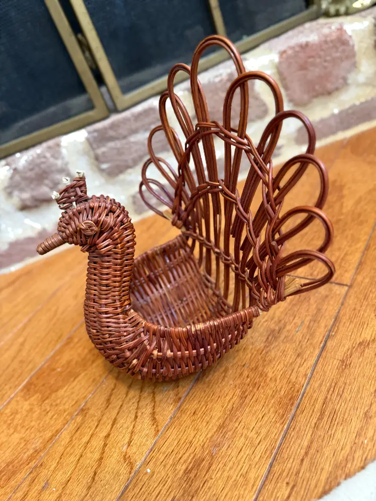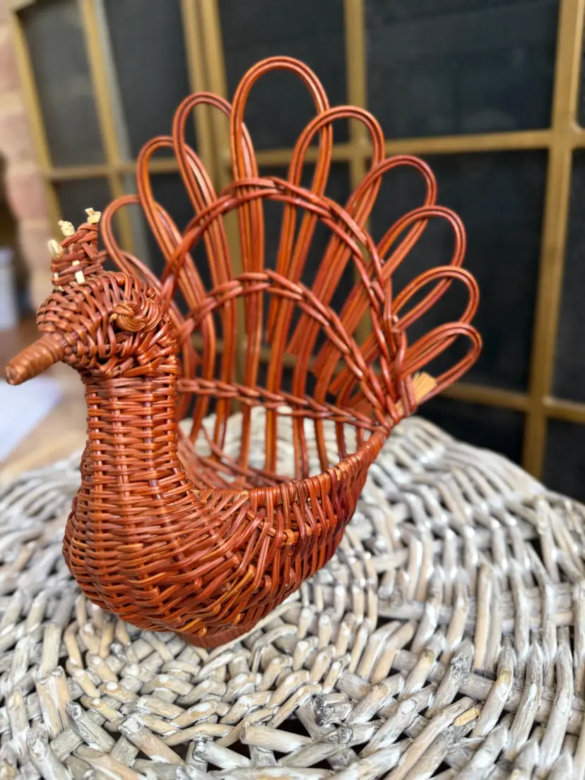 Material: Wicker / rattan Shape: Turkey with detailed feathers Era: 1970s–1980s (vintage holiday décor) Color: Warm brown natural wicker Condition: Excellent vintage condition – sturdy and clean with minimal wear