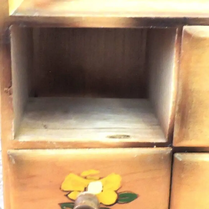 The decorative work on each drawer are decals, not hand painted.