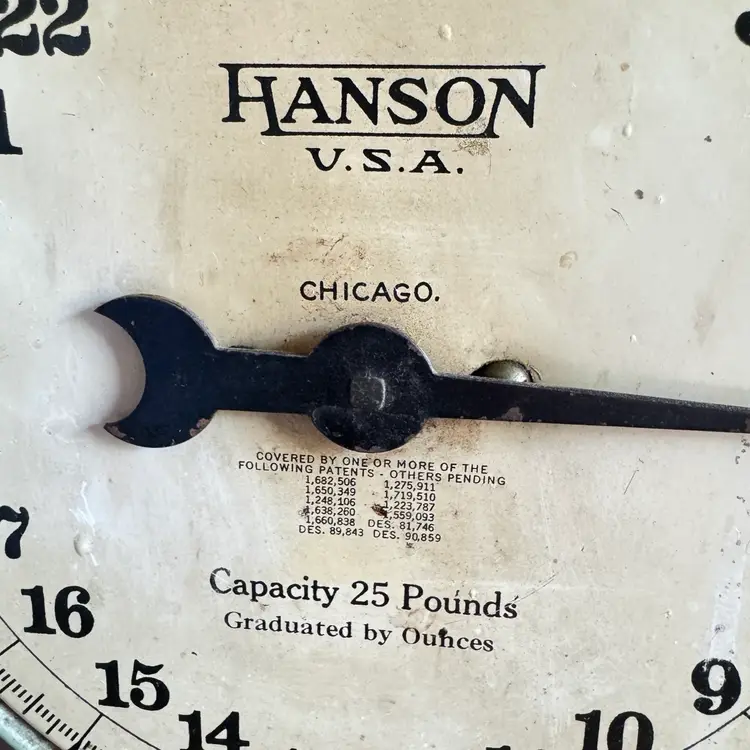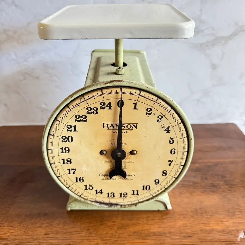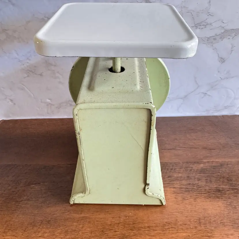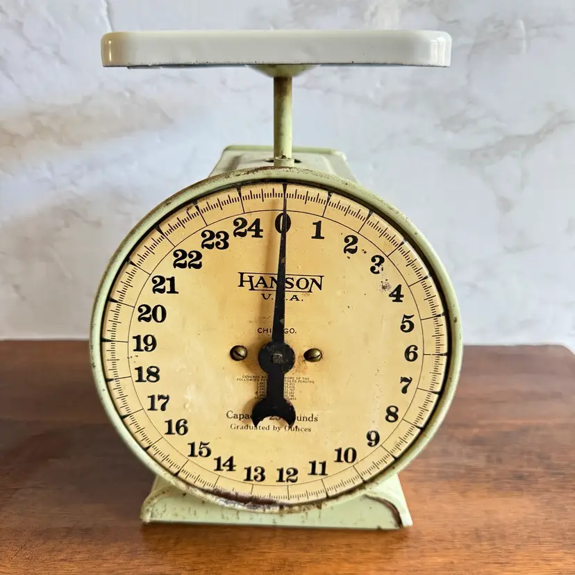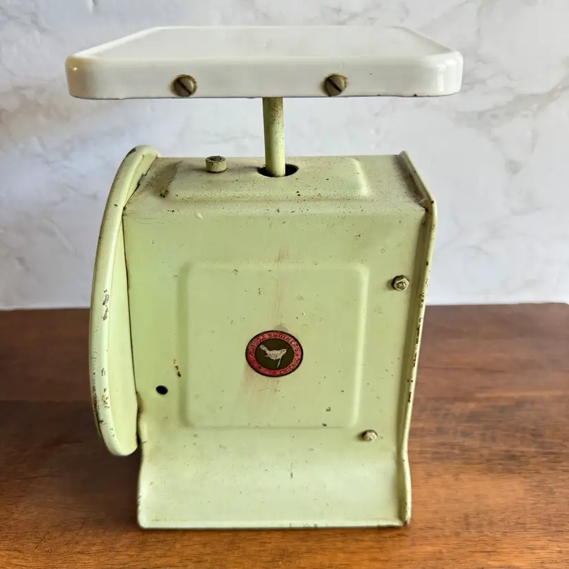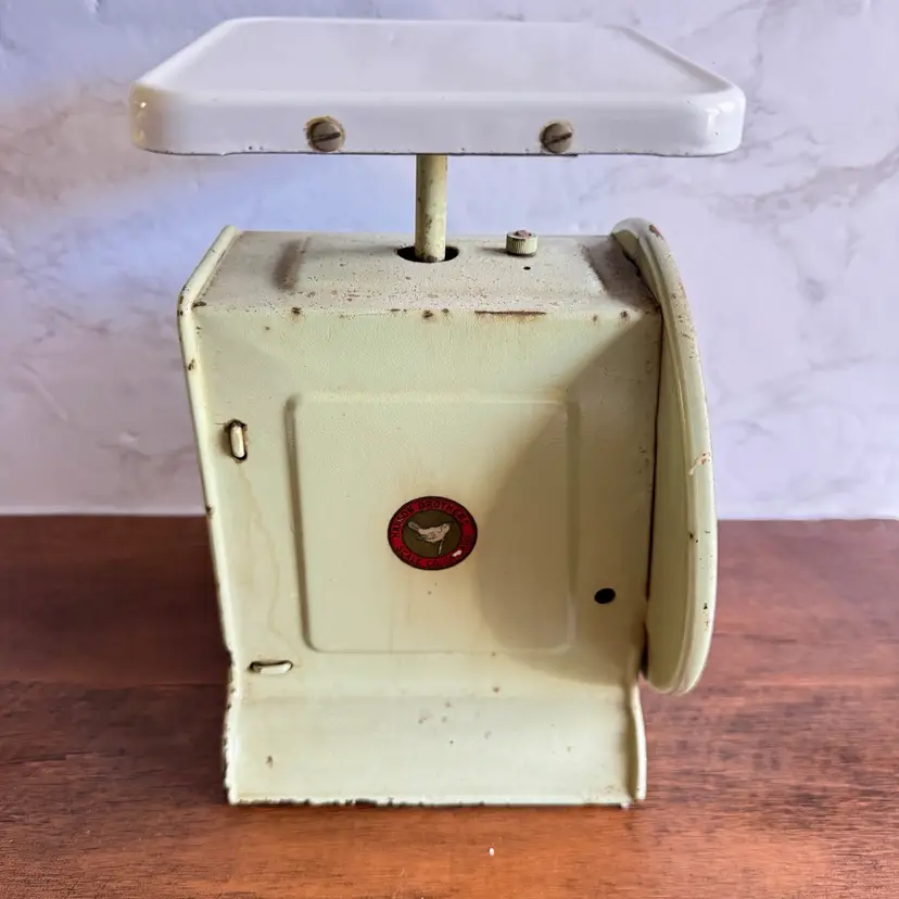 Shows signs of wear, tarnish, and rust due to age. Perfectly imperfect for a rustic farmhouse style. Works great and is accurate within an ounce.