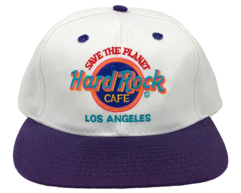 VINTAGE HARD ROCK CAFE SAVE THE PLANET LOS ANGELES CAP WHITE PURPLE SNAPBACK NOS One Size Fits All SnapBack Made in Taiwan 100% Cotton Cap in Excellent Condition Please See Pictures