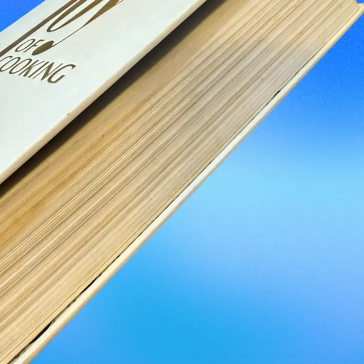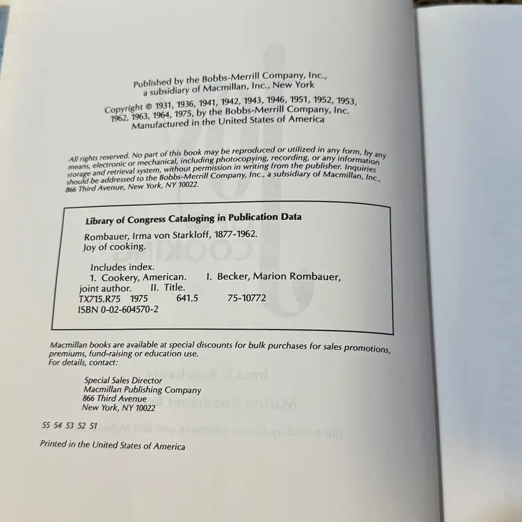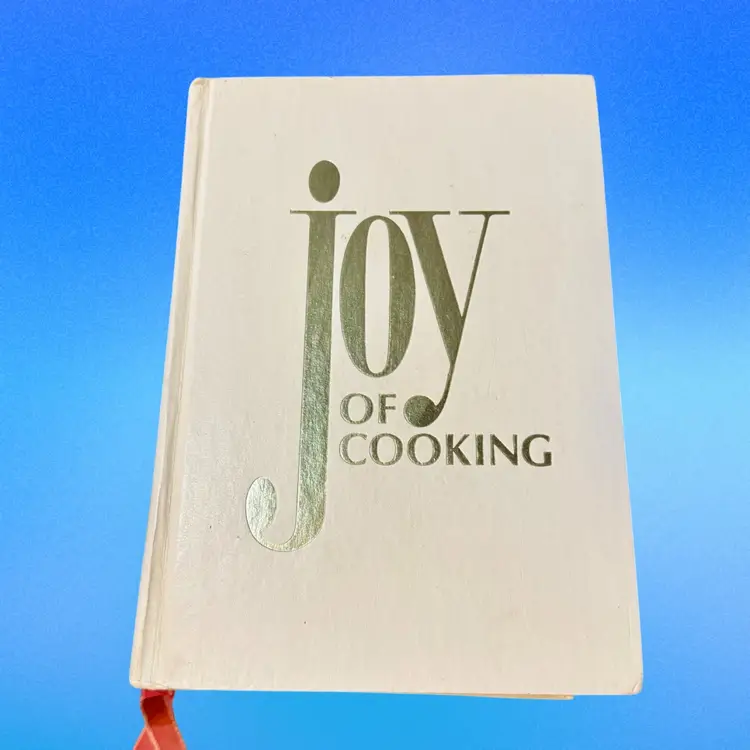 Approx 9.5” x 6.75” x 2”; ©️1975; 915pp; by Irma S. Rombauer and Marion Rombauer Becker; good vintage condition (top of spine pulling a bit from the cover, but overall is in good shape).