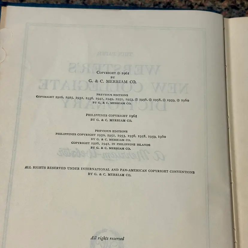 Approx 10” x 7”; ©️1961; 1174pp; by G.. & C. Marian Co.; good vintage condition. Minimal vintage wear (typical wear from handling and age to cover/edges); previous owner’s name on front cover has been crossed off in black marker (but someone’s name in black marker still visible inside front cover and on cover page).