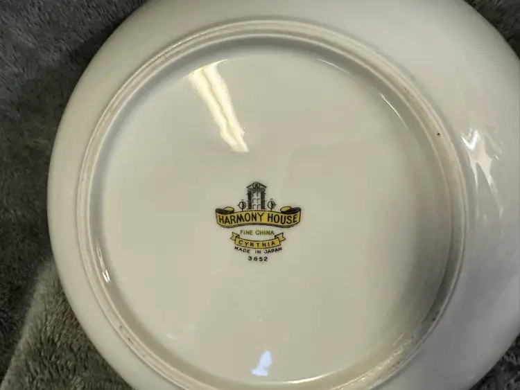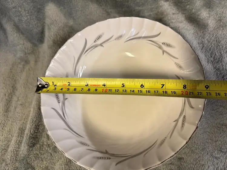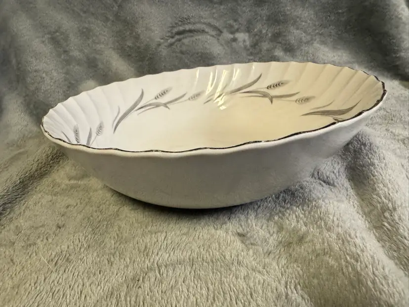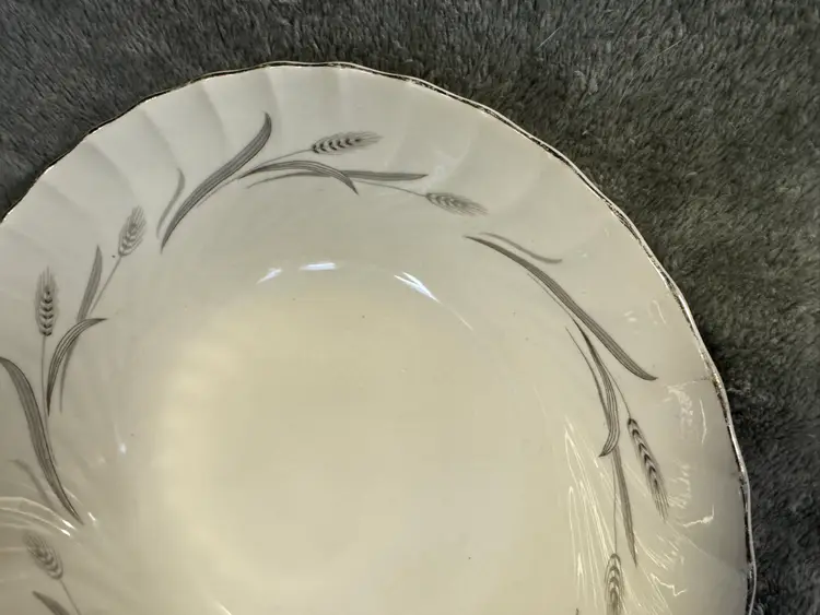 With its round shape and decorative features, the bowl is a product of Japan's renowned art pottery tradition of the 1960s. It boasts a printed backstamp authenticating its originality and is ideal for all occasions. Whether it's a casual dinner or a festive gathering, this exquisite piece from Harmony House/Sears will undoubtedly enhance your culinary presentation. Excellent condition. No chips, cracks, scratches or crazing. Wheat design shows no signs of wear; however, there is some slight wear to the silver on the rim.