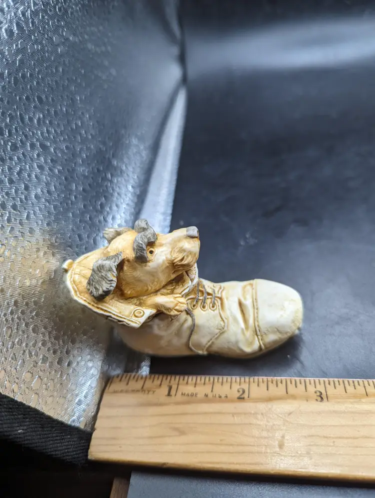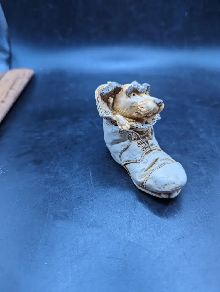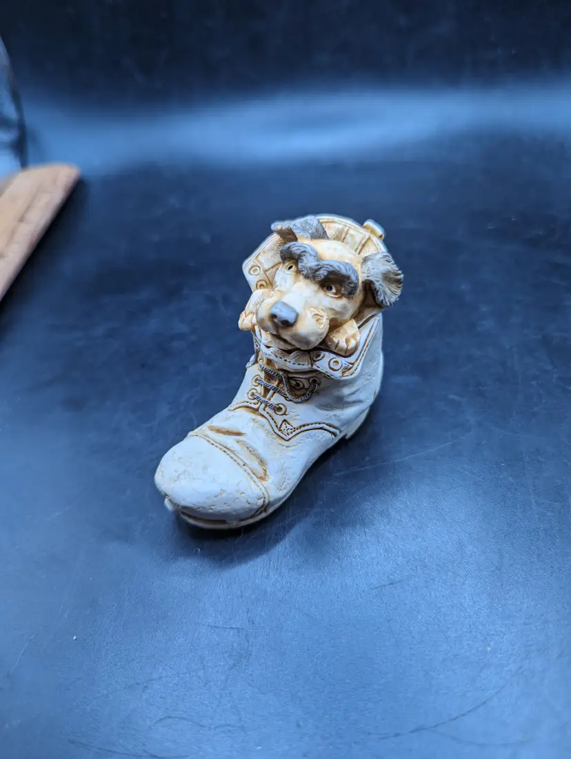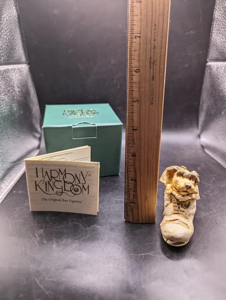 This is a lovely Vintage Harmony Kingdom "Sole Mate" Dog in Boot UK 1999 Trinket Box Figurine. Add a whimsical touch to your collection with this charming Harmony Kingdom figurine featuring a playful dog nestled in a shoe. Perfect for dog lovers and collectors of unique figurines. Please see all pictures for condition.