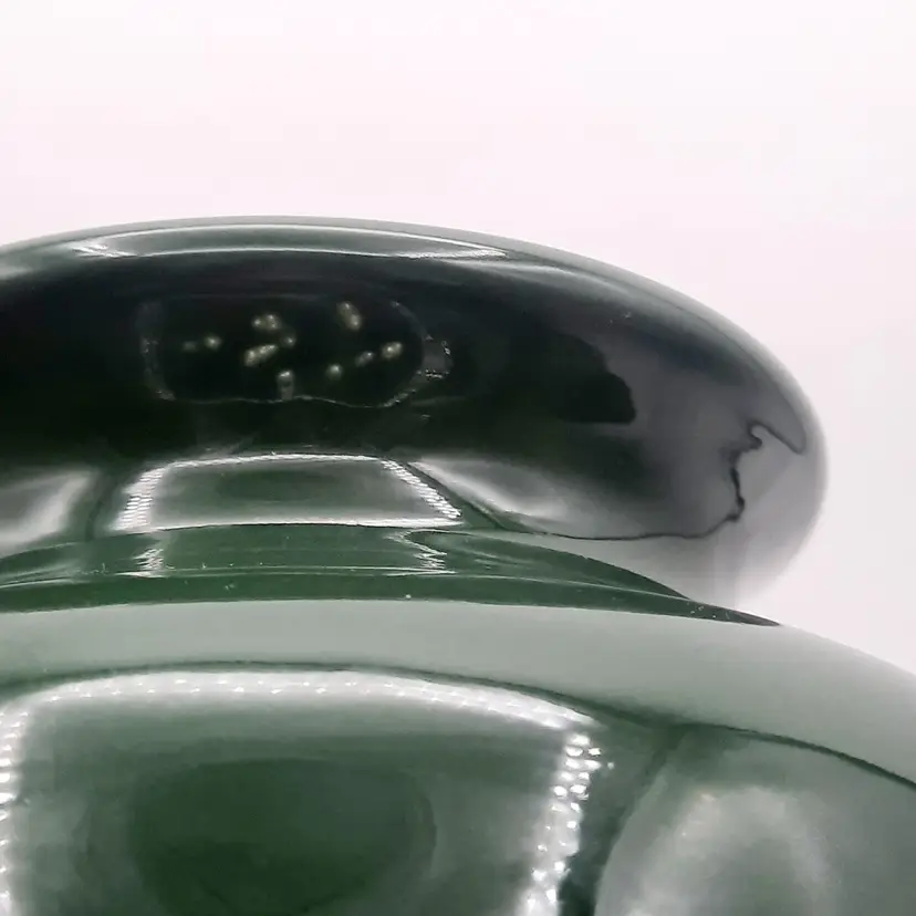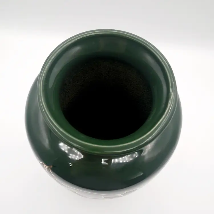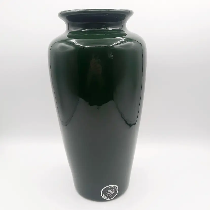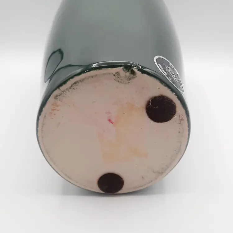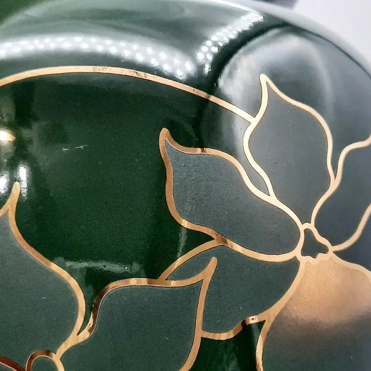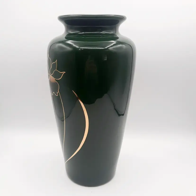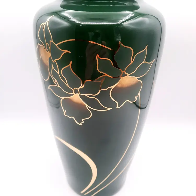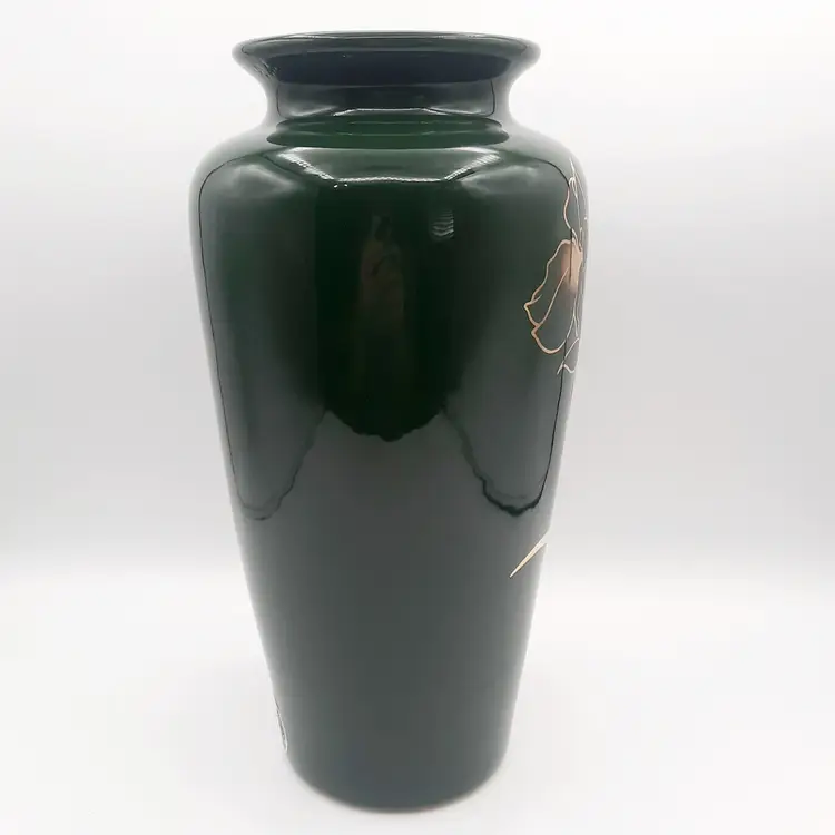 Beautiful vase is 12" tall in overall good condition with some wear to gold, other flaws are design imperfections - uneven spot on bottom edge and spots of missing paint under rim