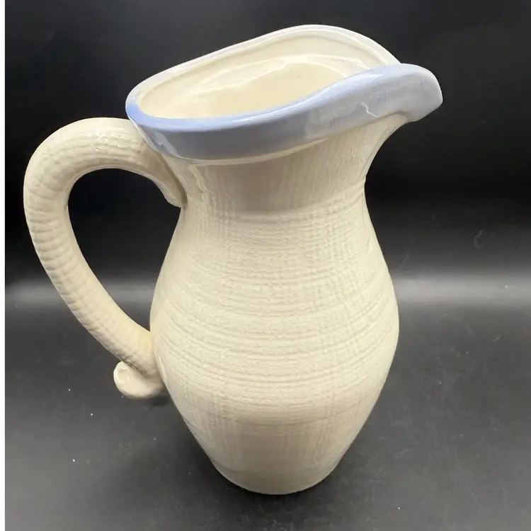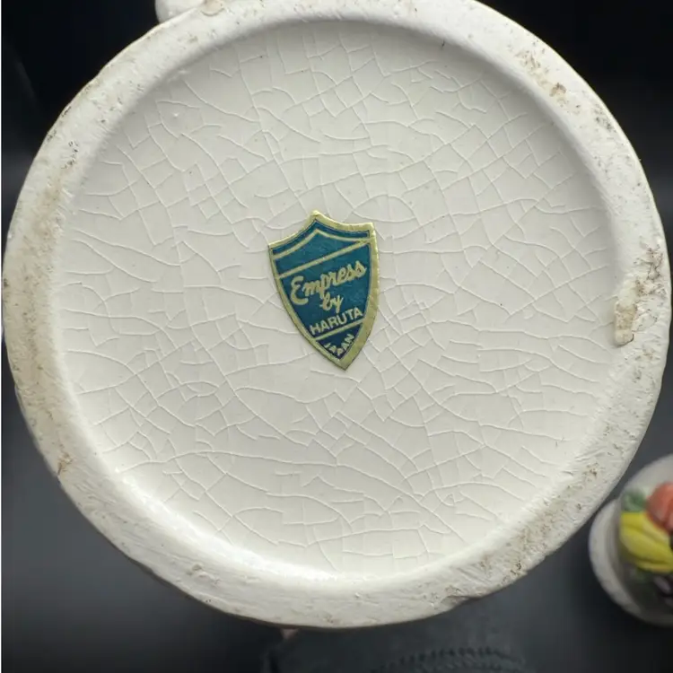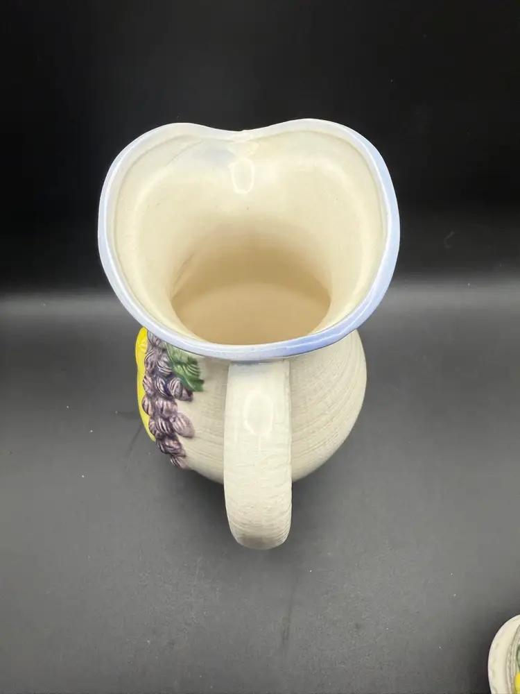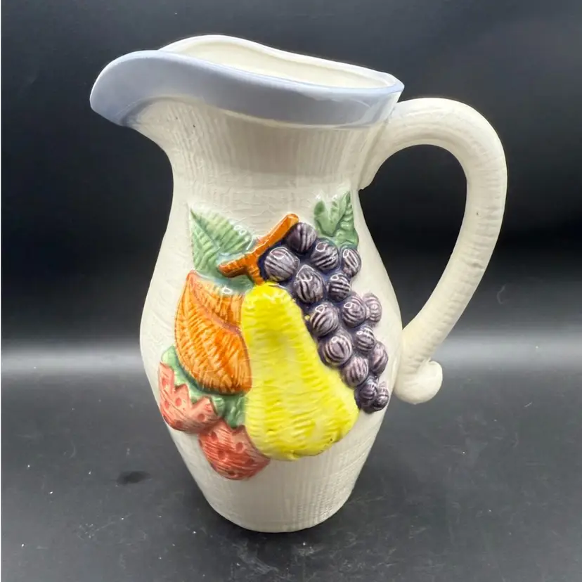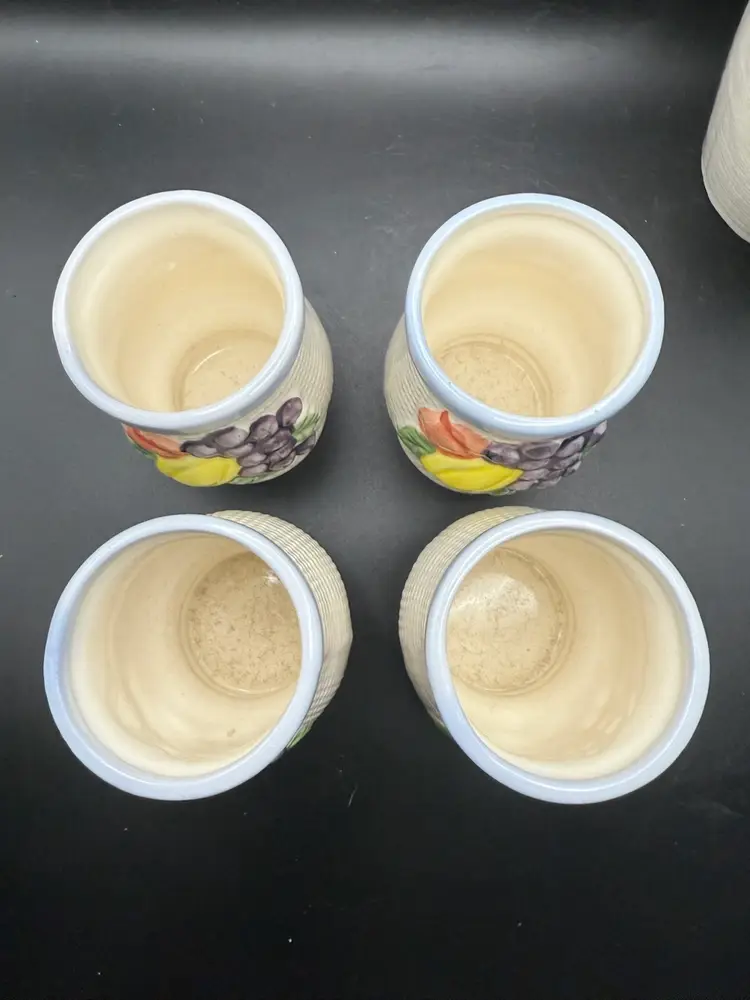 This MCM set of pitcher and four cups was made by Haruta. The pitcher stands 7 in tall and is 5.5 in wide. The cute little cups are in amazing condition and are 3.5 in tall by 2.5 in This particular set, with its fruit motifs and basket weave texture, exemplifies the kind of decorative tableware that was widely produced and appreciated during the post-war era.