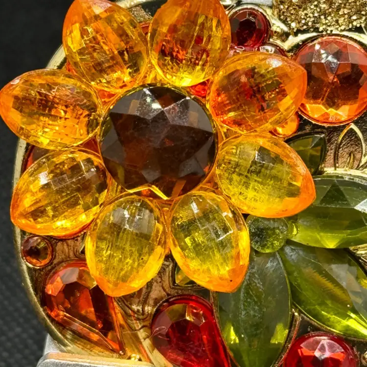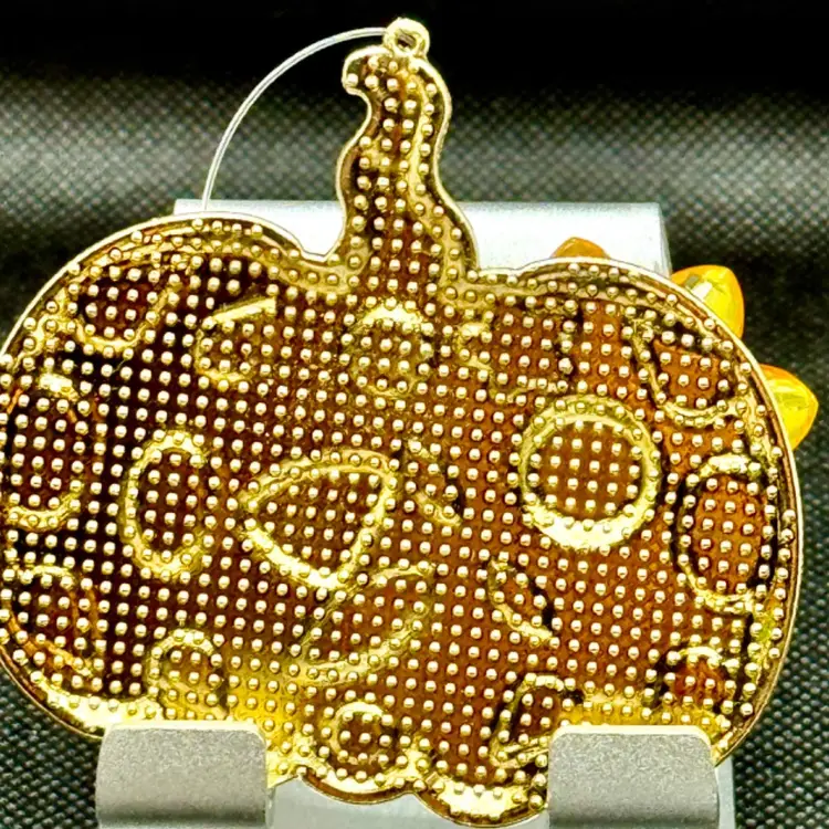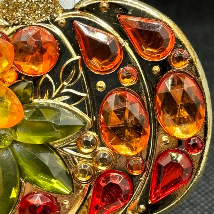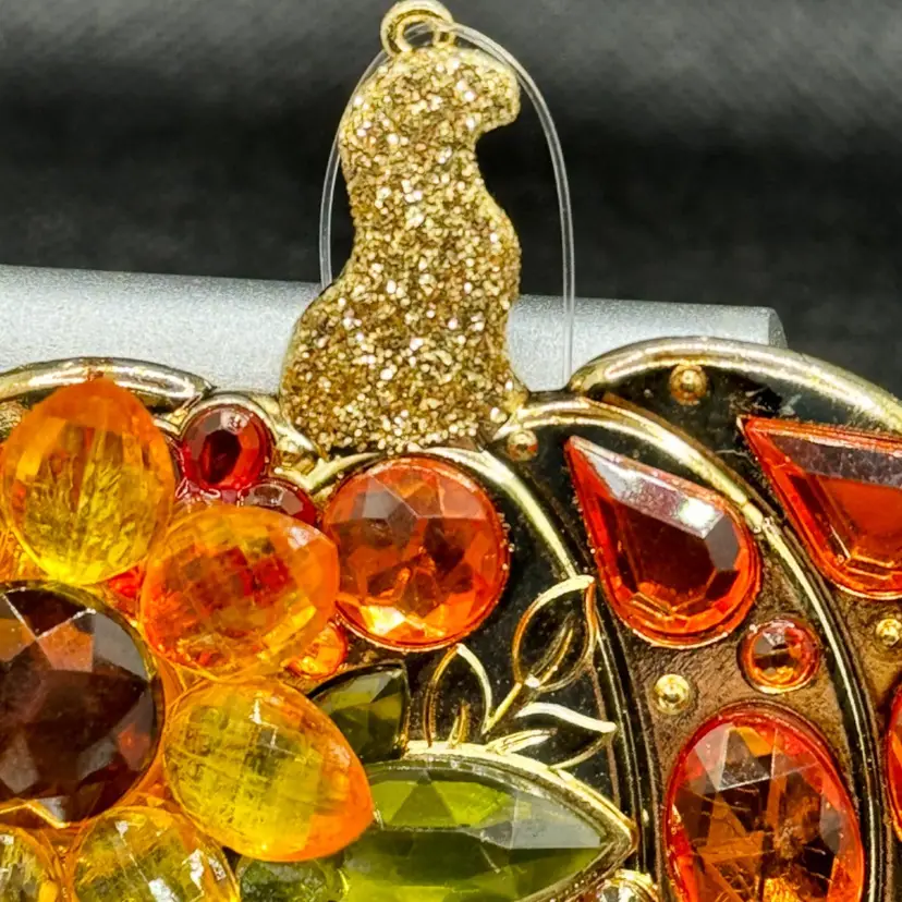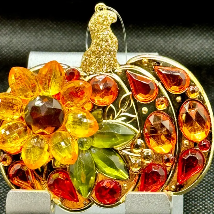 Vintage harvest sunflower pumpkin multicolor crystals metal backing ornament, by Ganz, made in China. Very beautiful piece, crystals really sparkle, perfect for any occasion not just holidays. No chips or cracks. Measures 3x3x.25. Weighs 4oz.
