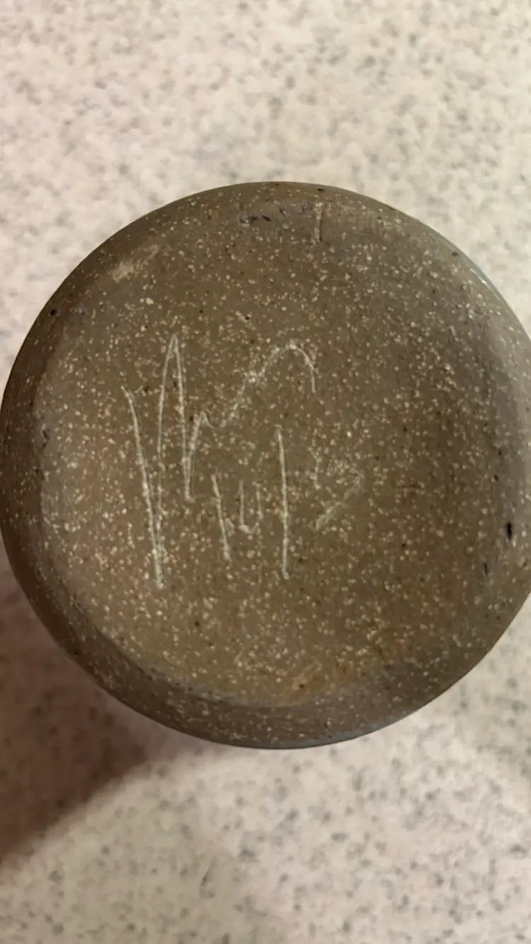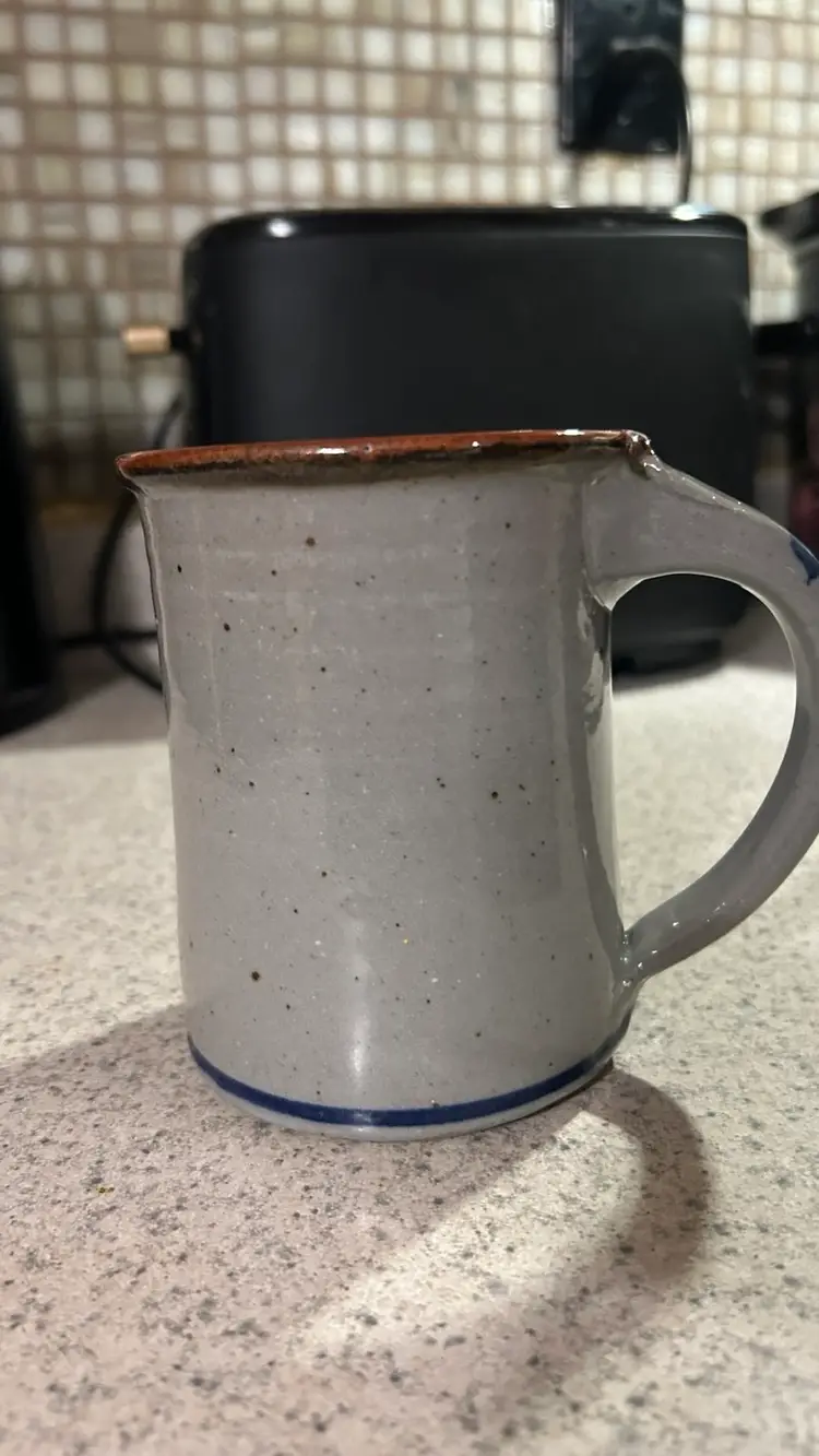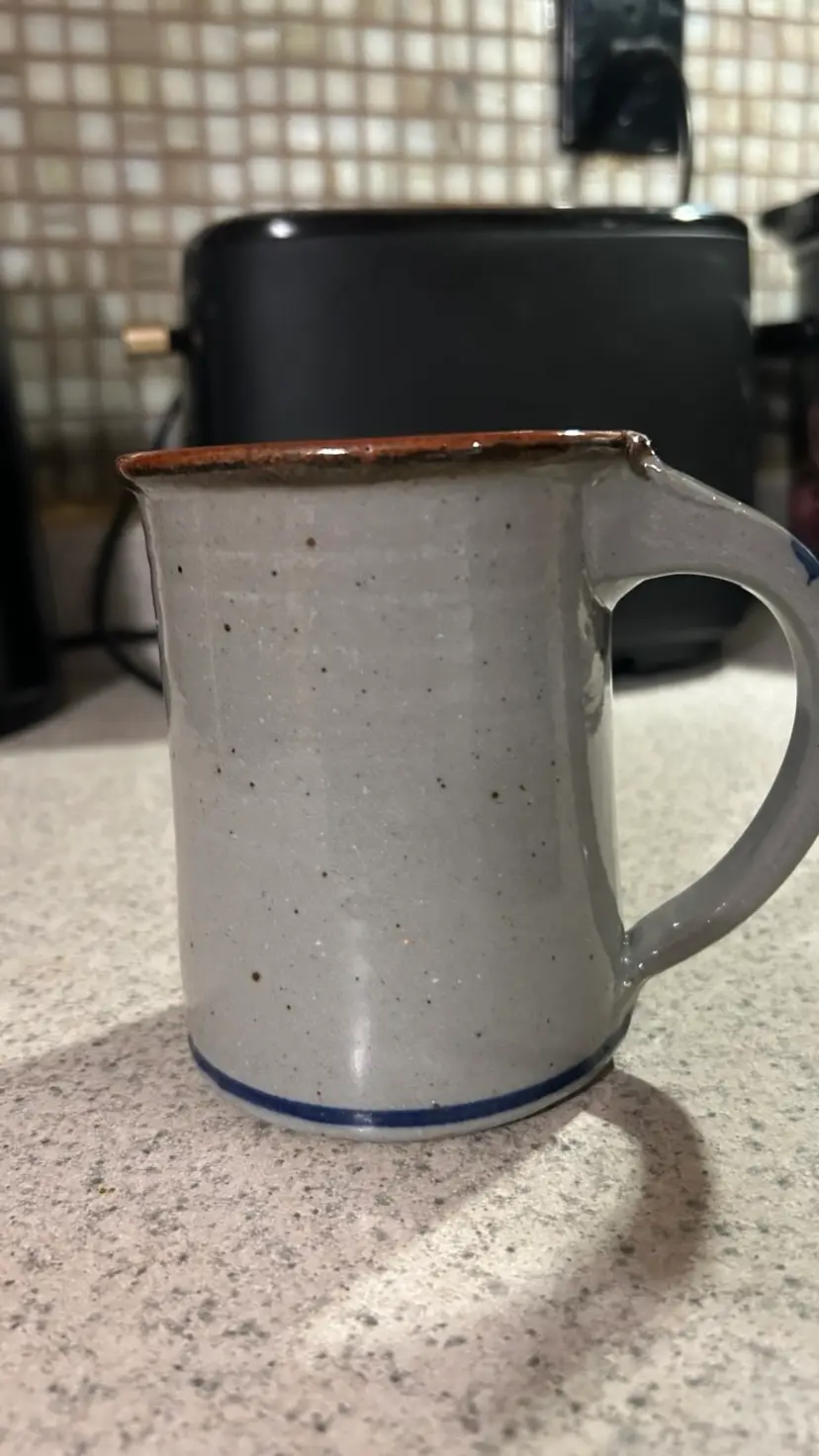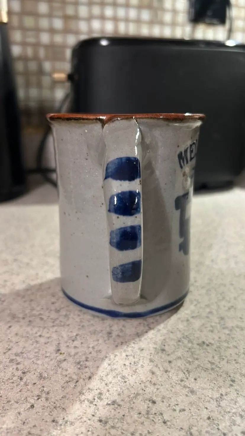 A Harvey Salt Pottery mug is a handmade, hand-thrown stoneware mug, primarily known for its distinctive gray salt glaze and cobalt blue decoration. These mugs feature a classic, colonial style and often commemorate specific towns or events. This one is the Melrose MA mug.