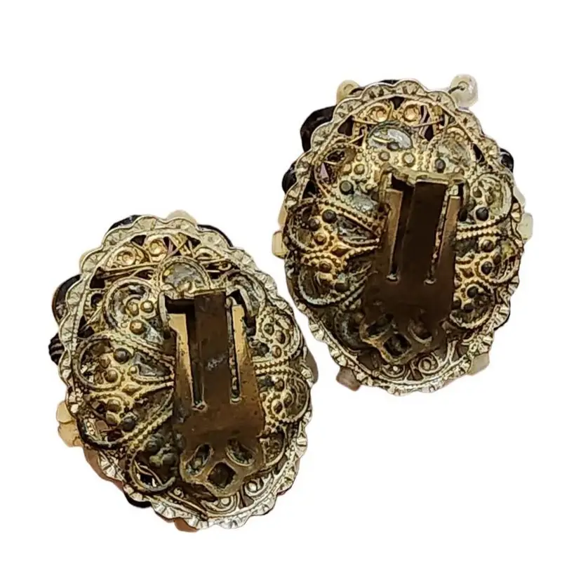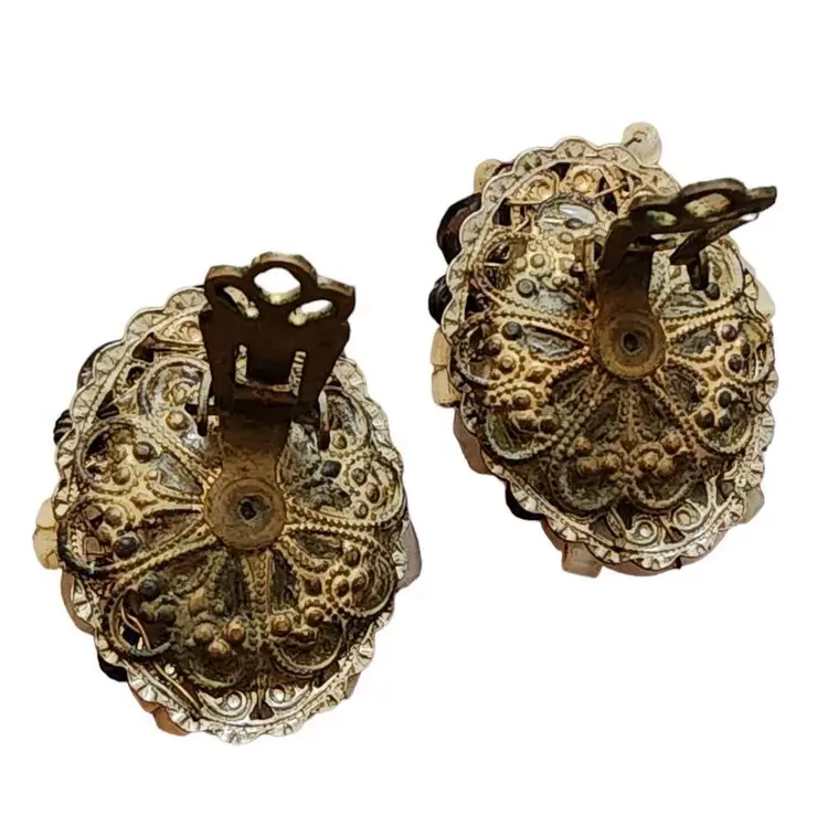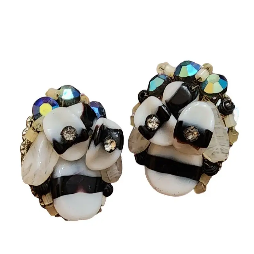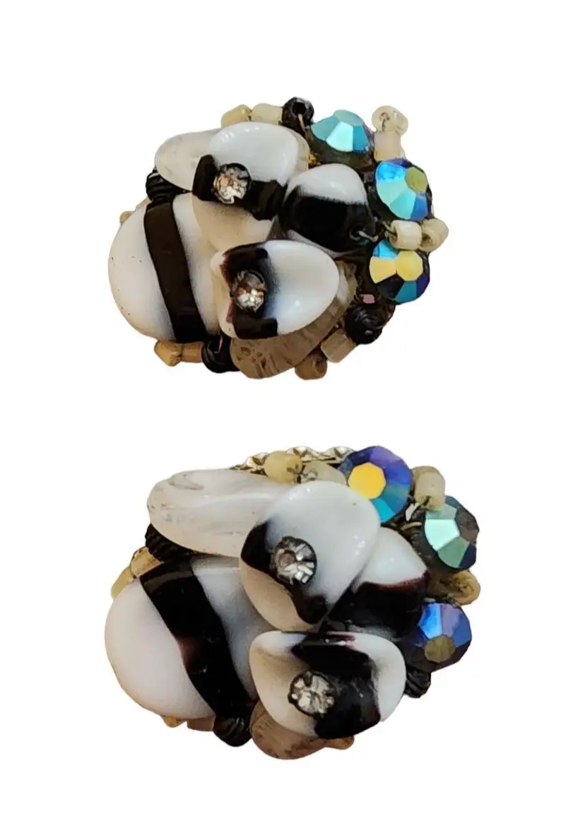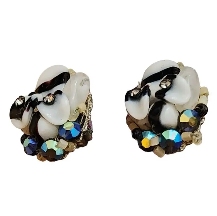 Vintage Haskell Style Black & White Art Glass Crystal Wired Earrings (A1890)