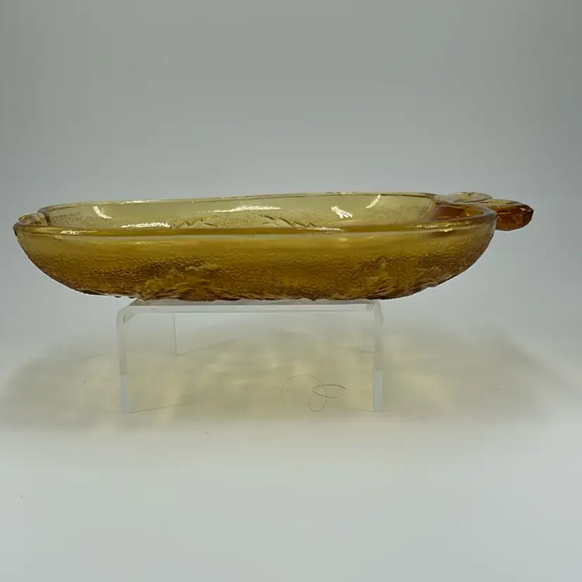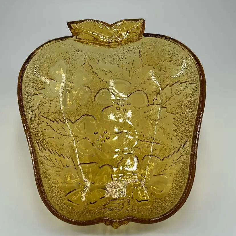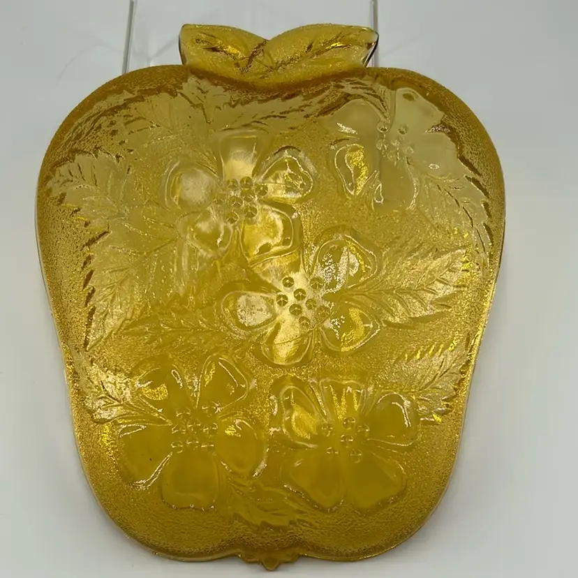 This piece is a vintage hazel glass amber glass dish shaped like an apple. It has a floral or apple blossom design. It can be used as a trinket dish or a candy dish. It stands 1 inch tall and about 6 1/2 inches wide and 5 1/2 inches across. There are no chips or cracks.