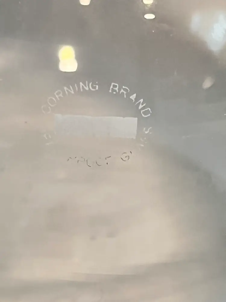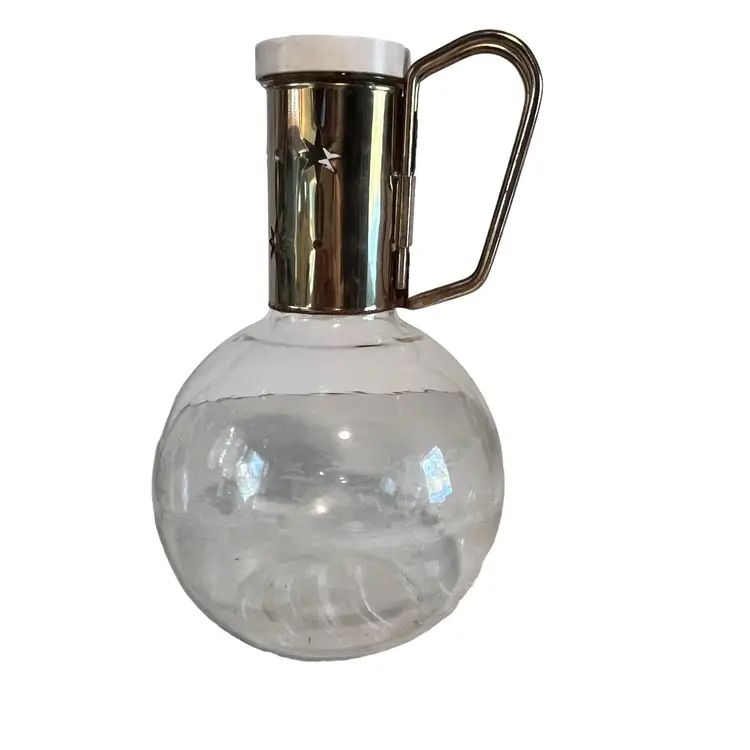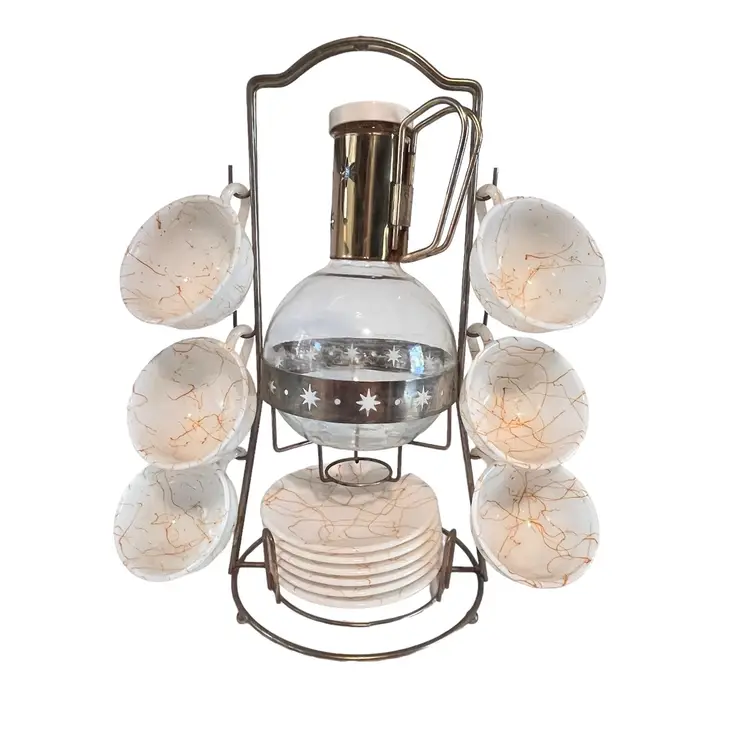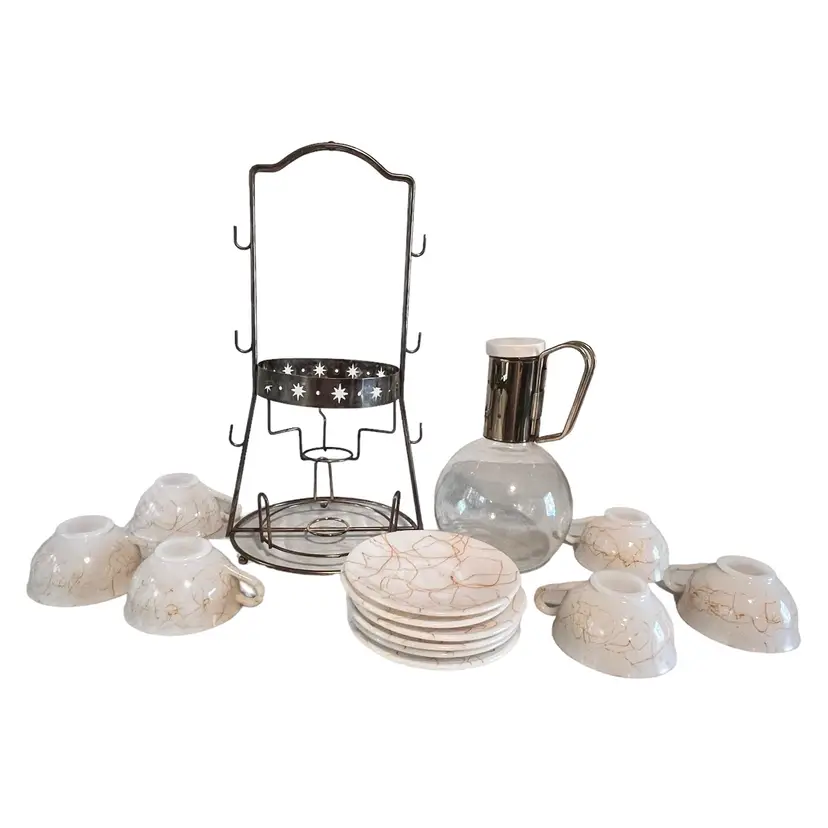 Vintage Hazel Atlas Spaghetti String Drizzle Cups & Saucers (6) each, hanging on a Metal Stand with Glass Corning Ware Carafe/Metal Handle. Stand needs some TLC polishing and Glass Carafe has some hard water deposits.