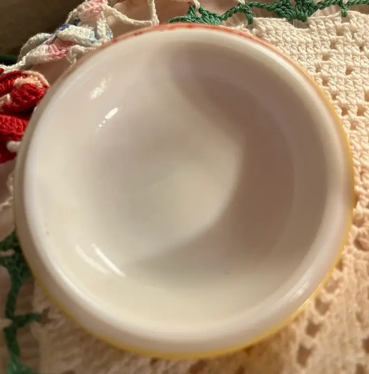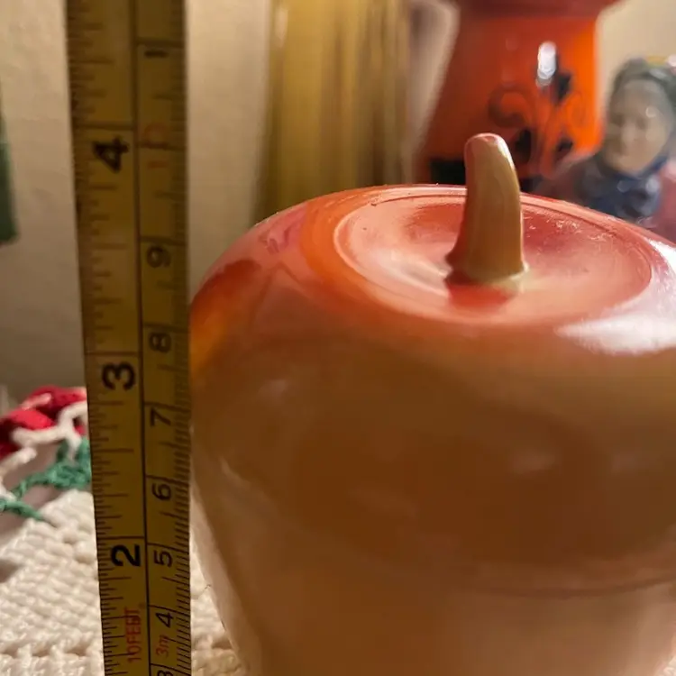 THIS APPLE IS PERFECT .. TAKE A MOMENT TO LOOK AT THE PHOTOS .. THIS IS MILK GLASS WITH THE SPRAY ON COLOR .. THIS APPLE LOOKS LIKE IT HAS NEVER BEEN USED .. A MUST FOR EVERY VITAGE KITCHEN COLLECTION..