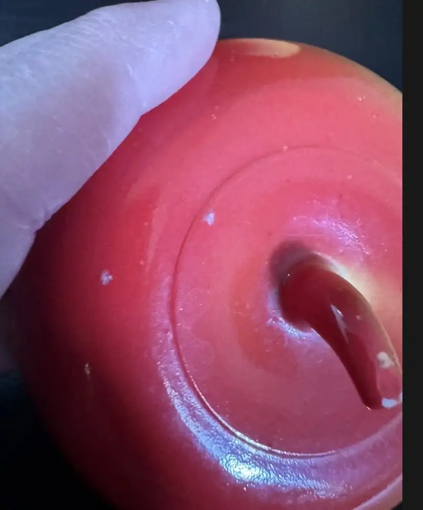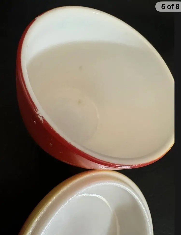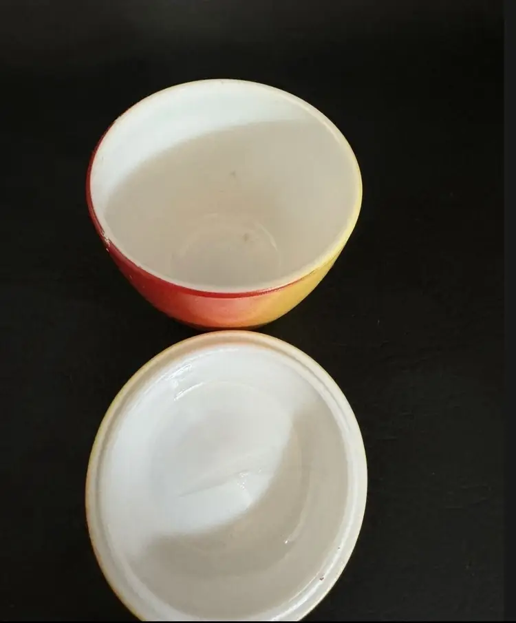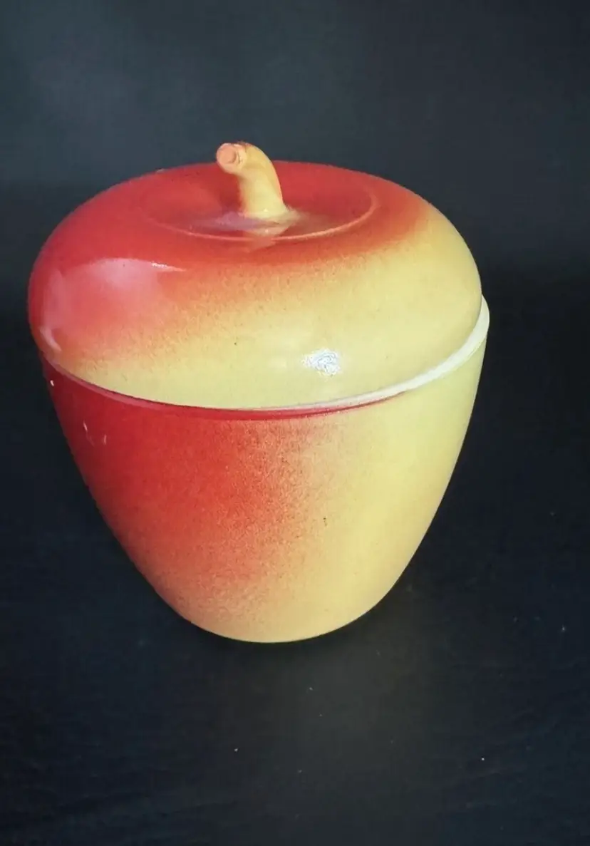 Add a pop of color to your kitchen with this vintage Hazel-Atlas milk glass apple jam jar. The jar, made in the United States during the 1940s, 1950s, and 1960s, features a beautiful red apple pattern and comes with a handle lid. The jar has a capacity of 8 oz and is perfect for storing your favorite jams or jellies.