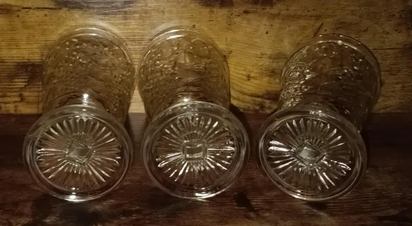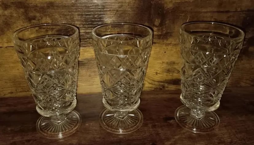 Vintage Hazel Atlas set of 3 tea glasses on pedestals. All are in good condition with no damages. They measure approx. 5.5 inches tall, top is 3 inches across, and the bottom is 2.5 inches across.