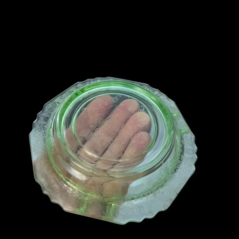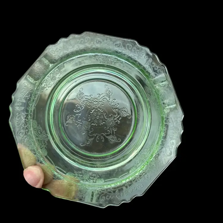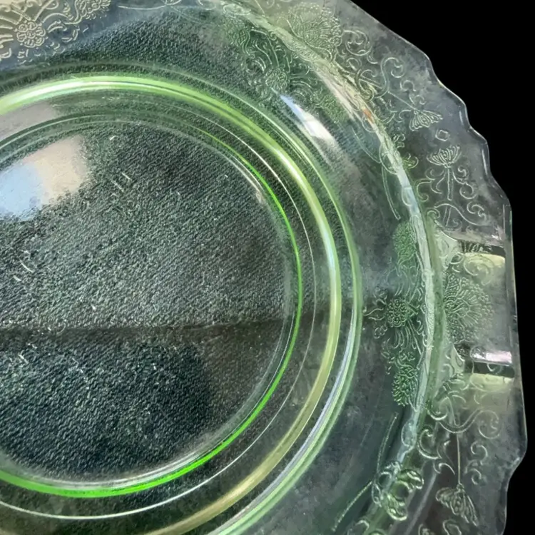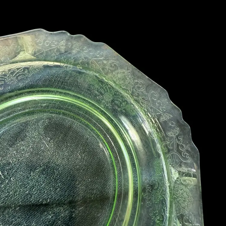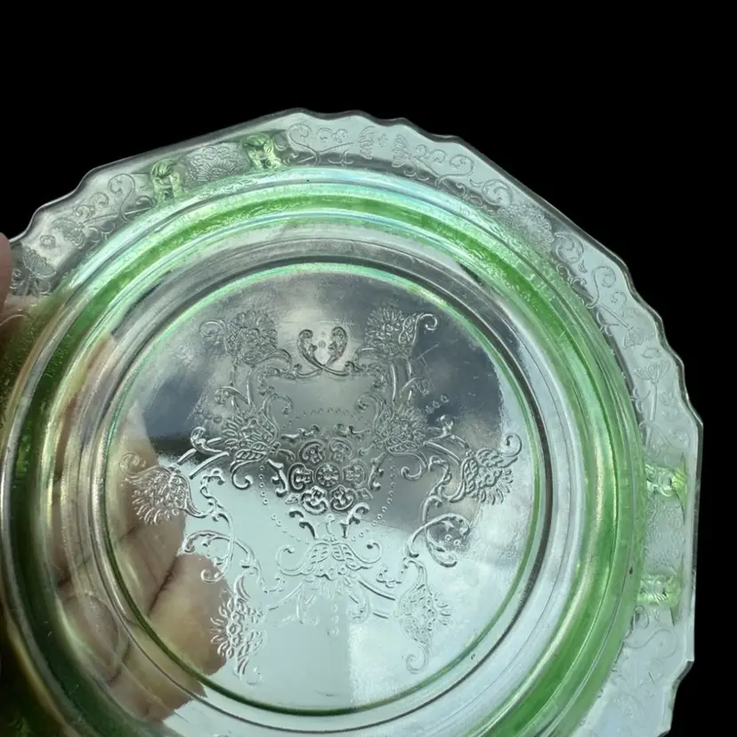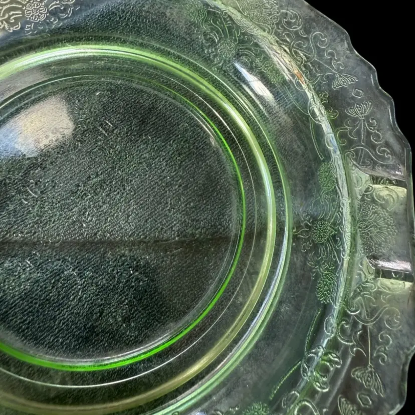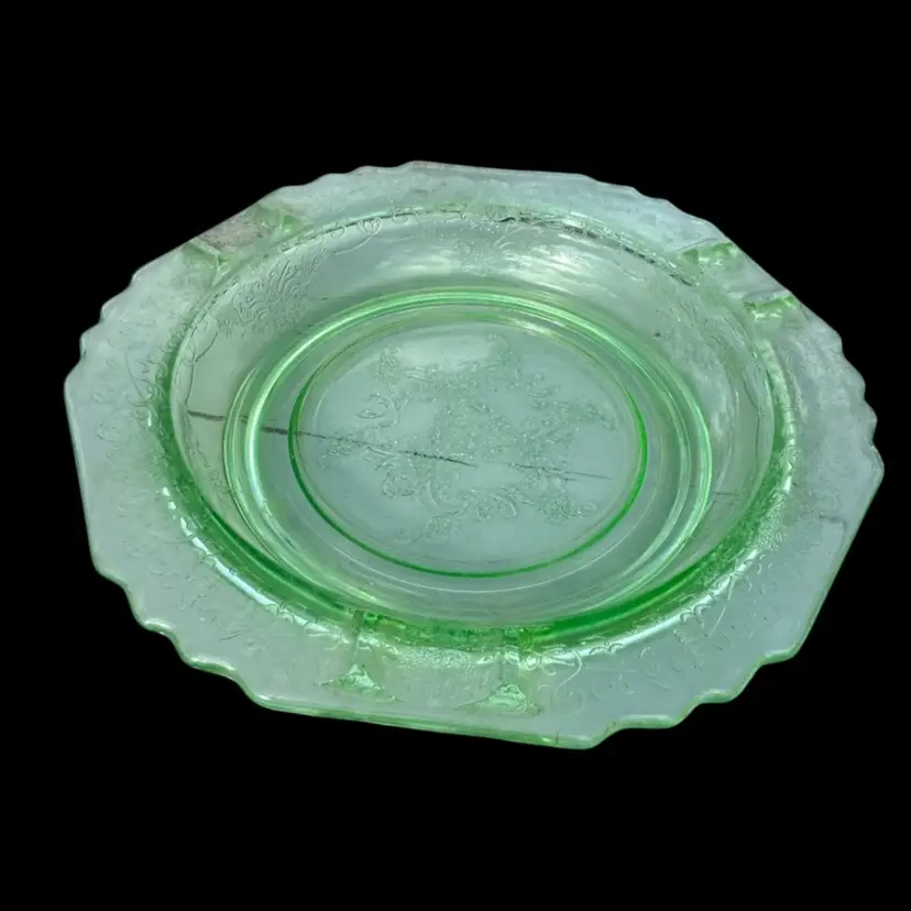 5 1/2” diameter Glows under UV light Has fleabites on the inside rim of the dish I have tried to show them in my photos. No cracks 3/17/2025