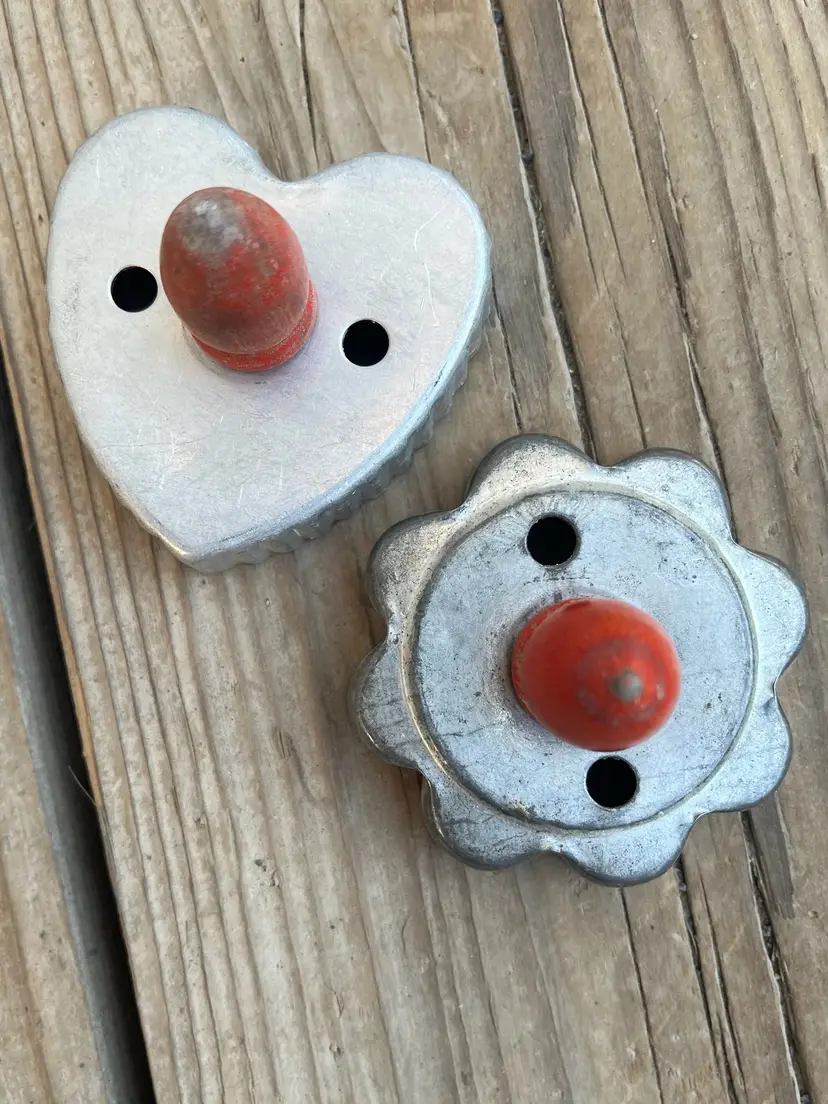 A pair of vintage cookie cutters. Both a star and heart shape. Painted red wood handles. They are great for display or you can use them for baking your cookies.