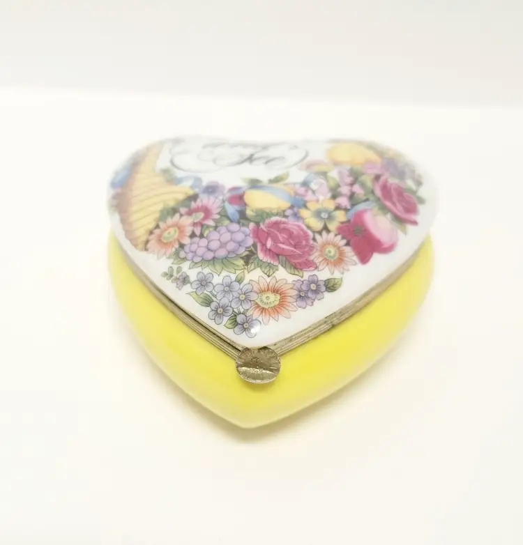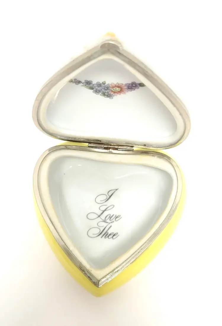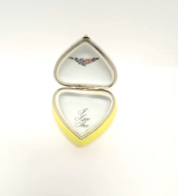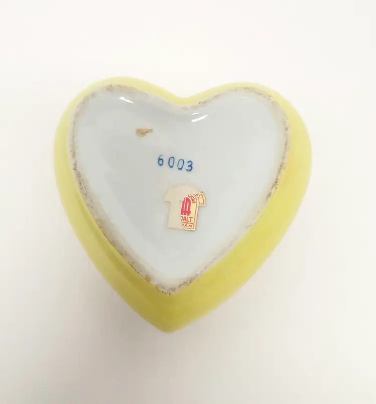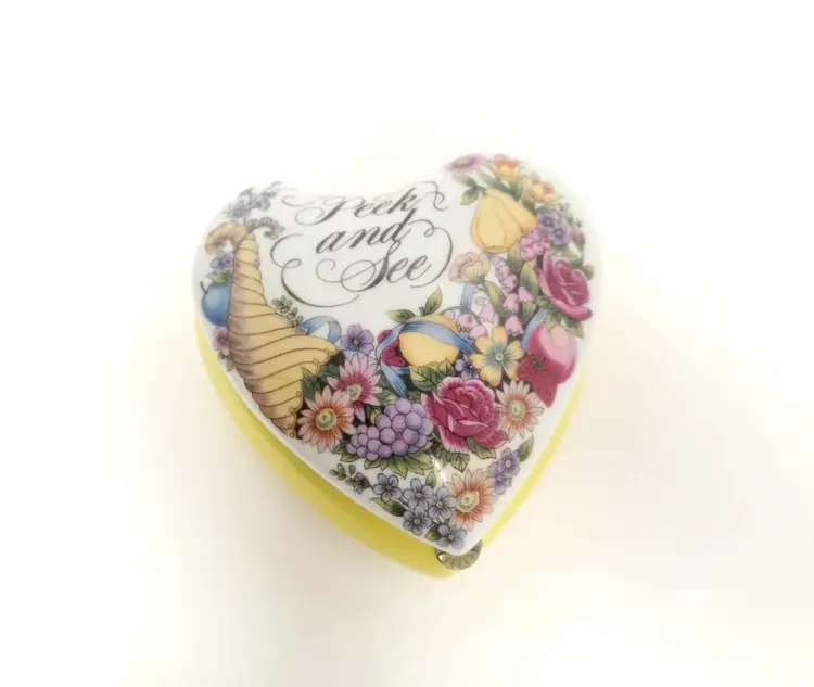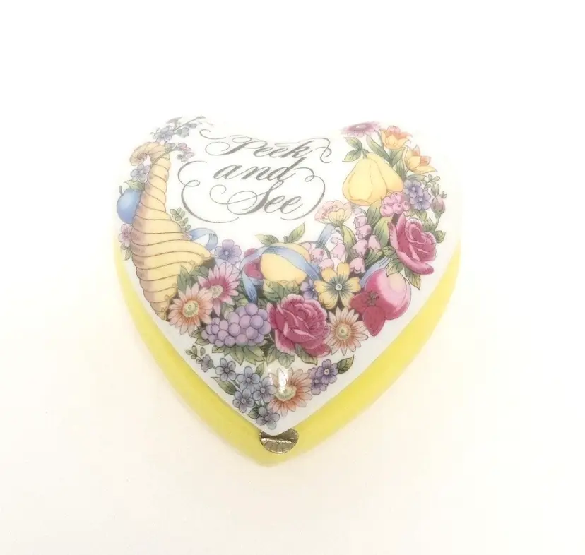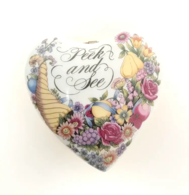 Vintage porcelain heart shaped hinged trinket box. Says “Peek and See”. Floral design. Japan #6003. Vintage condition, as seen in photos.