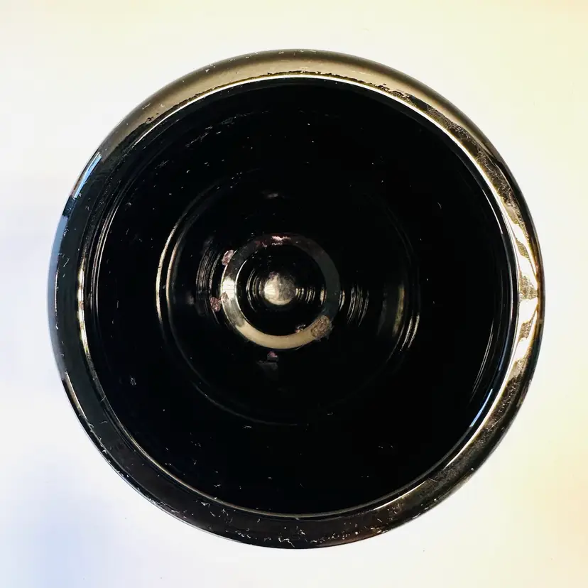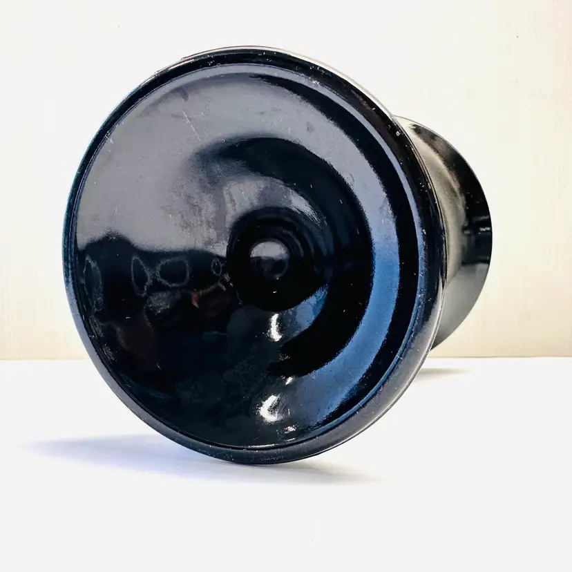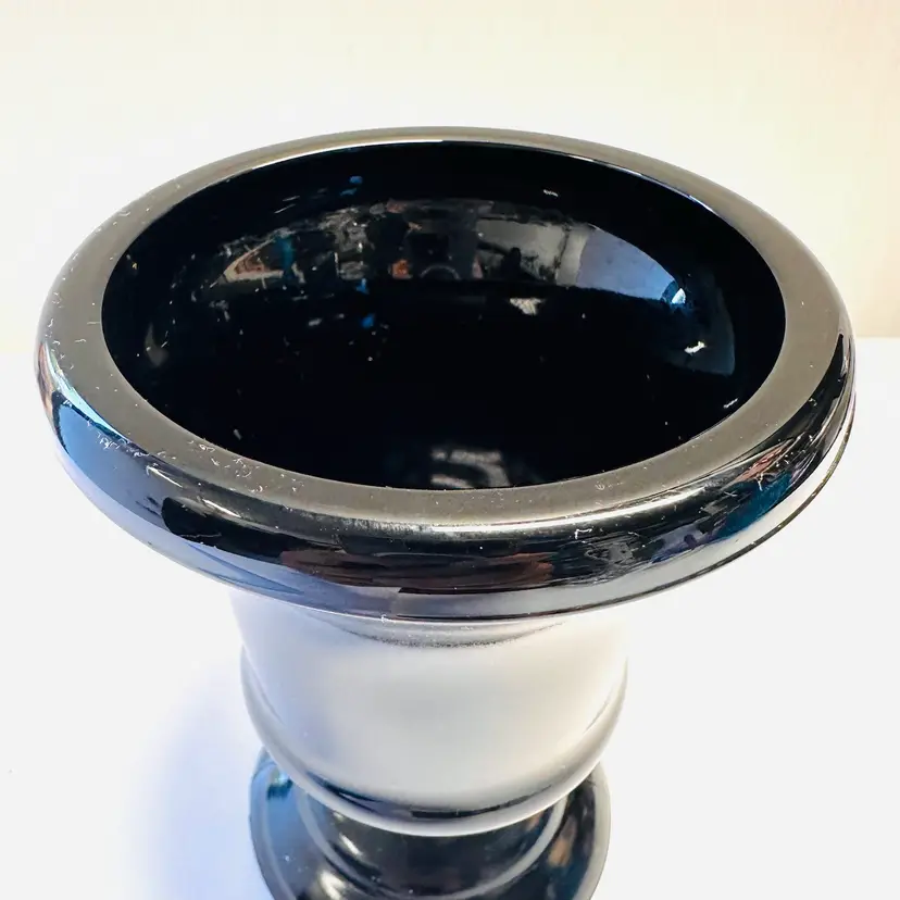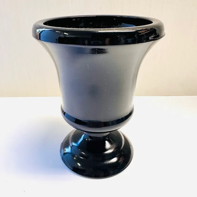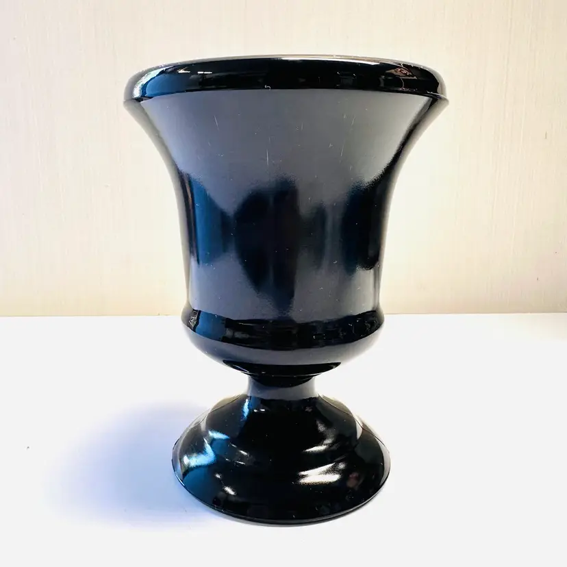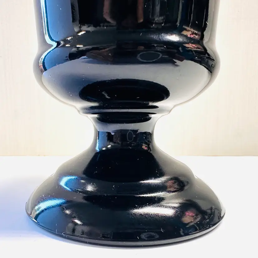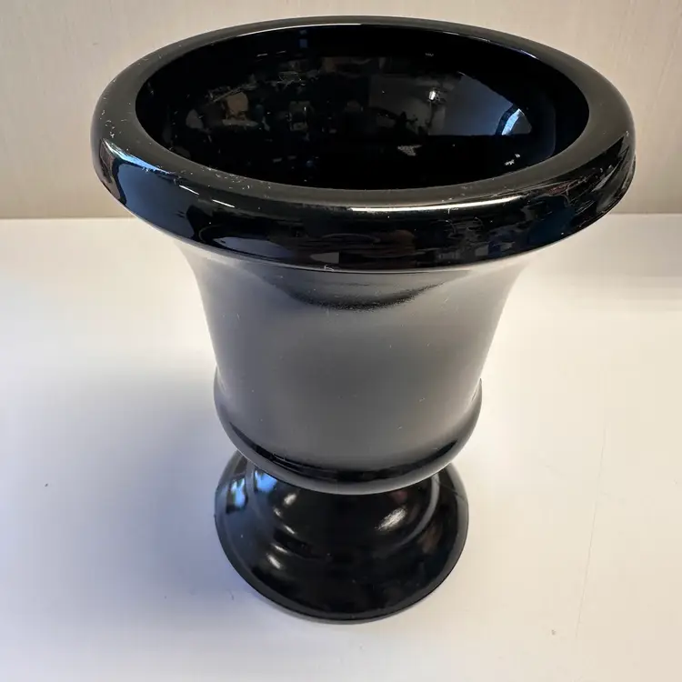Previously owned heavy black amethyst glass urn or pedestal vase. There are no maker marks.