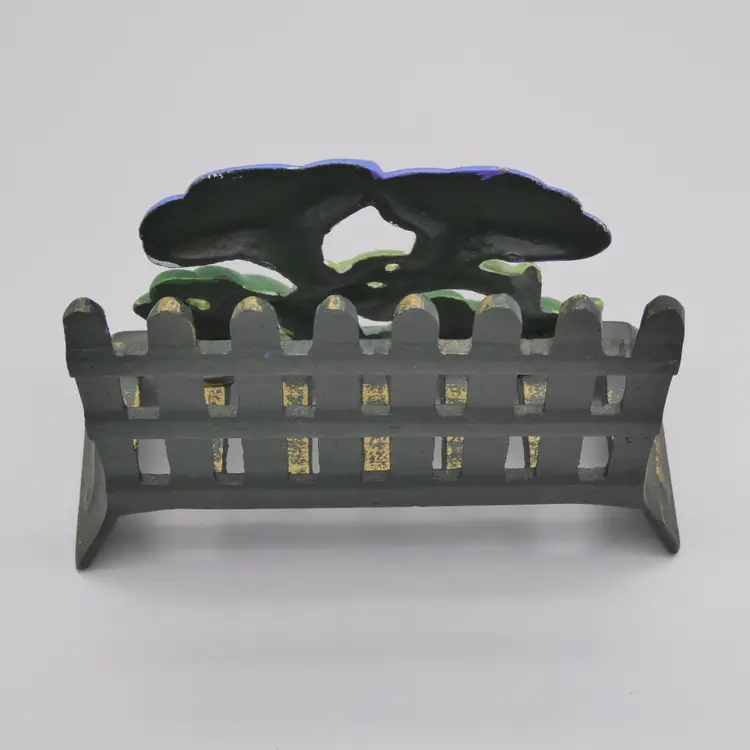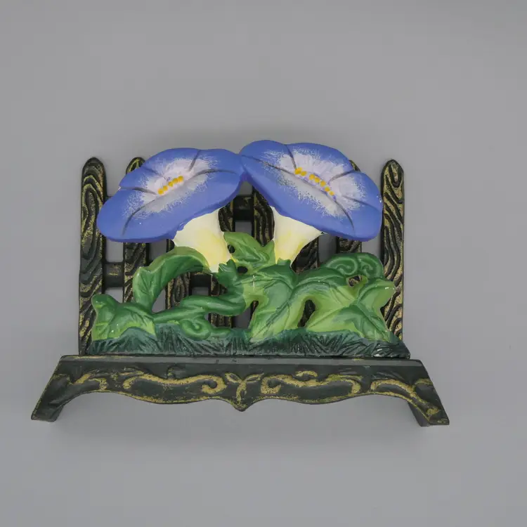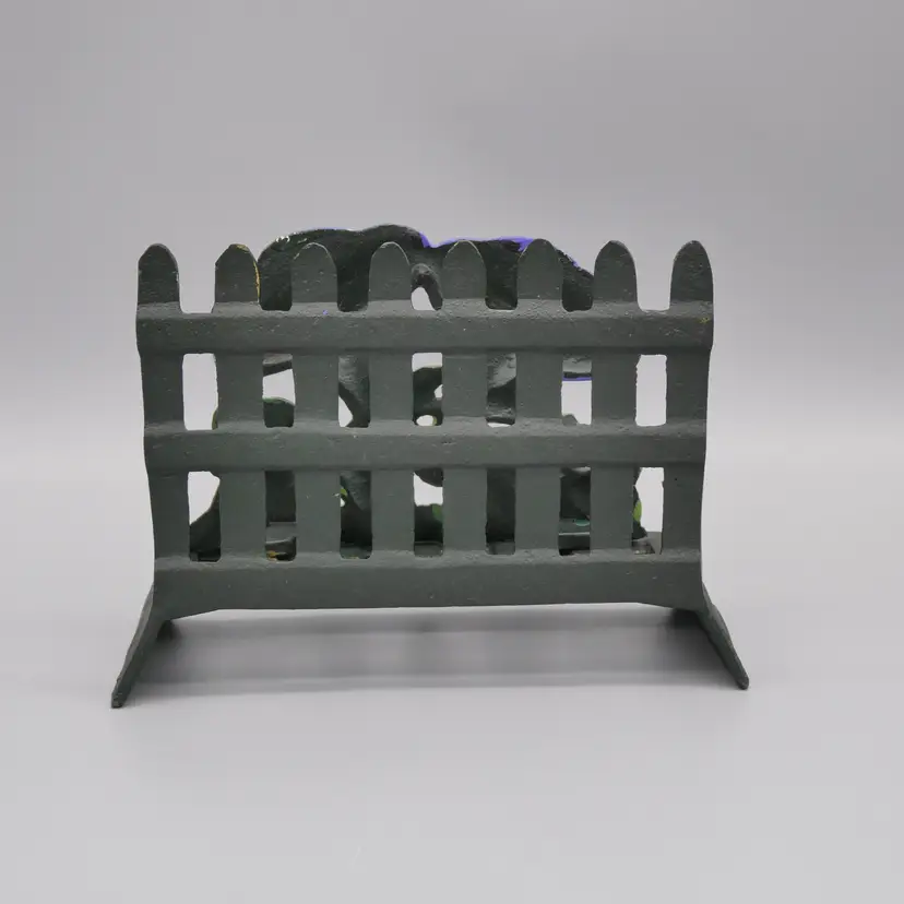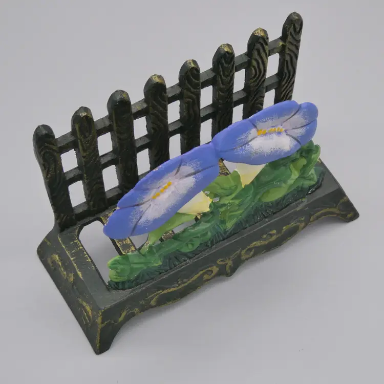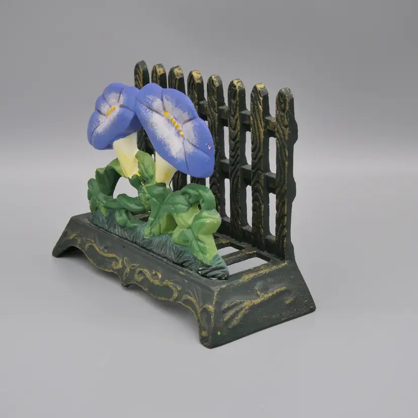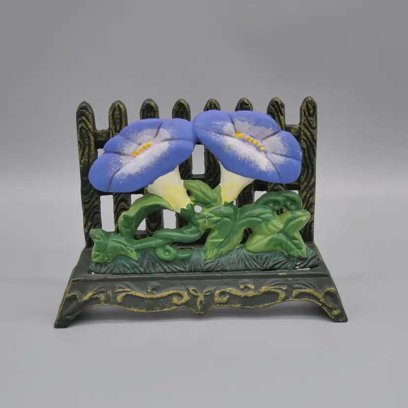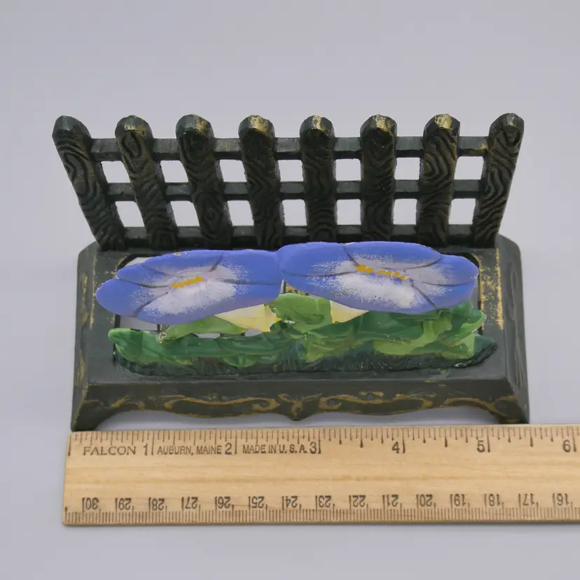 Featuring a picket fence with a morning glory flower vine in the forefront Cast iron composition with hand painted features Main body is a very dark green - almost black with gold accents Flowers are painted with a periwinkle / blue-ish purple, green, yellow, white and ecru colors Can be used as a napkin or mail holder Measures overall about 4" tall x 5-5/8" long x 2-3/8" wide Weighs about 1 pound 4 ounces before being packaged to ship