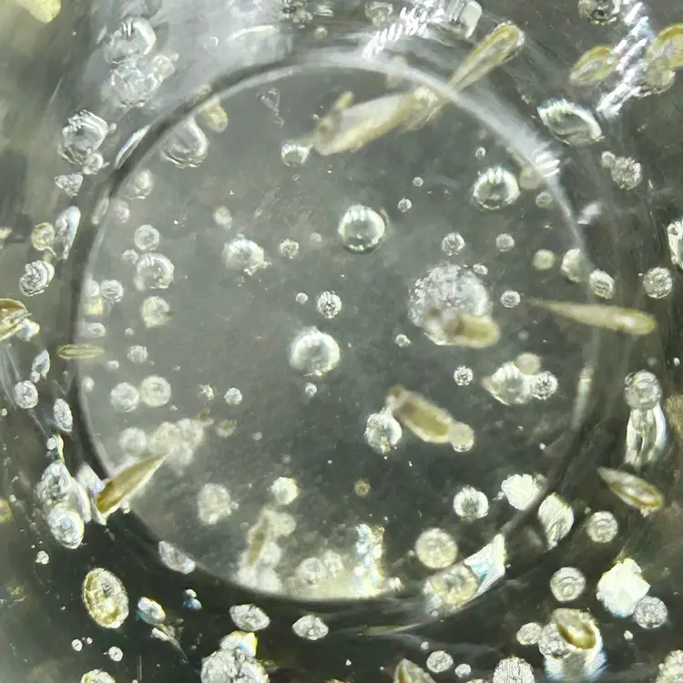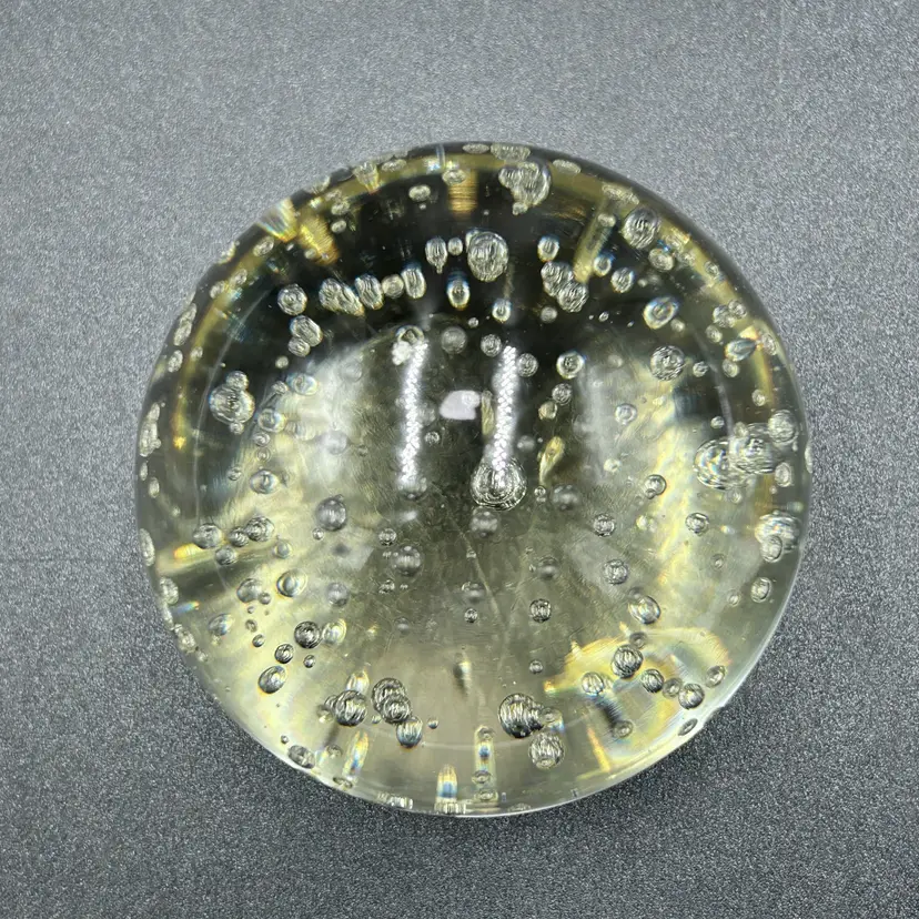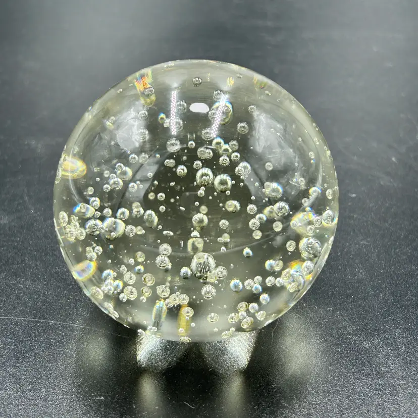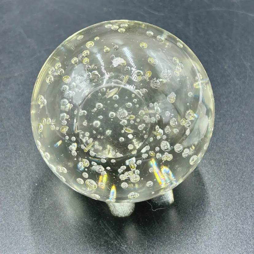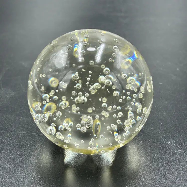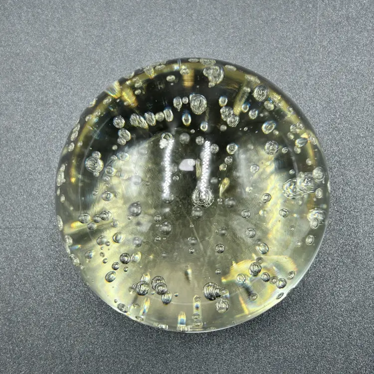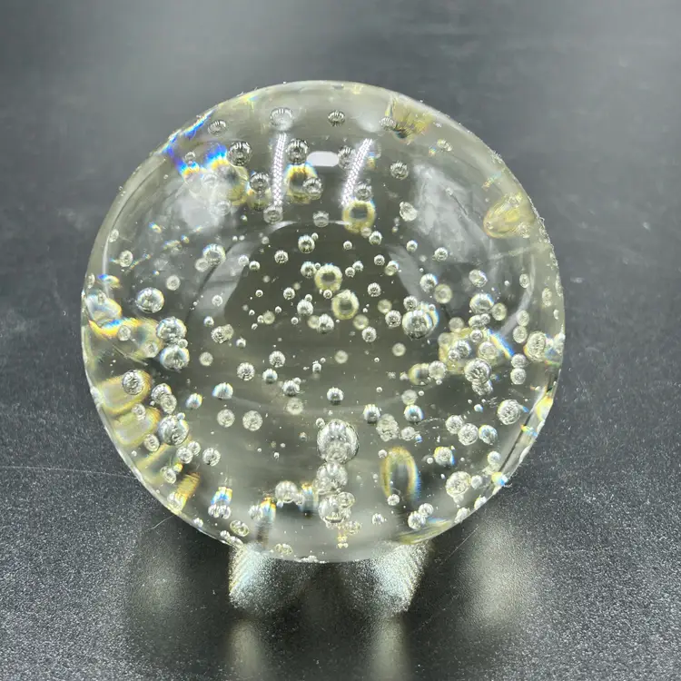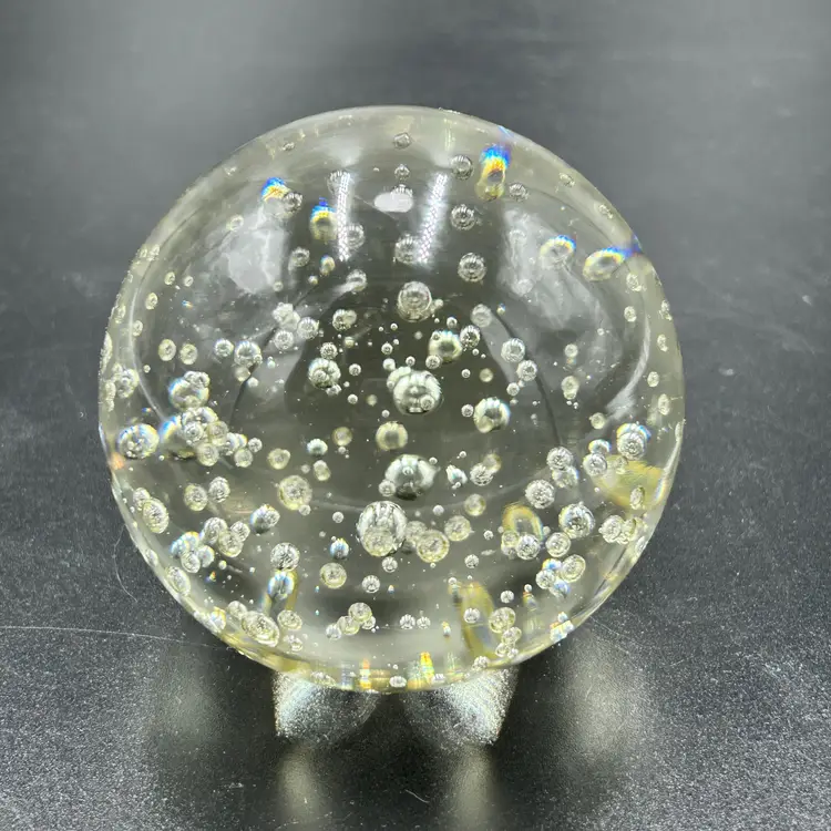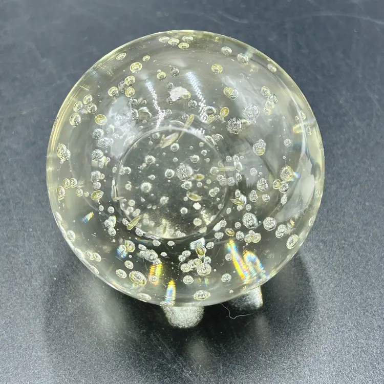 This vintage paperweight is a beautiful addition to any collection. Made of heavy clear glass with bubbles, it has a glossy finish and is hand blown in the late 20th century. The pattern of bubbles adds a unique touch to the piece, making it a one-of-a-kind addition to your decorative glassware. The paperweight is unmarked, but its originality is confirmed by the production technique, smooth bottom, and the fact that it is a handmade item. Perfect for anyone who loves art glass and vintage decor, this piece will add a touch of elegance to any room. Excellent condition. Approximate size: 3 1/8" diameter Please see photos for more details.