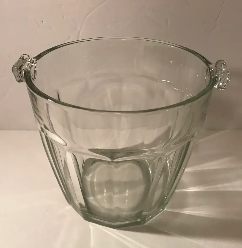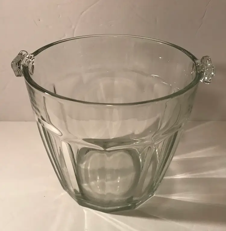 The round shape and clear glass material make it a stylish addition to any occasion. Measuring 6 1/2 inches in height and 7 1/4 inches in diameter, this ice bucket is perfect for all your ice needs. The tab side handles make it easy to carry and add a touch of convenience to your bar setup. Made of high-quality glass, this ice bucket is durable and built to last. Add it to your collection today and elevate your bar experience.