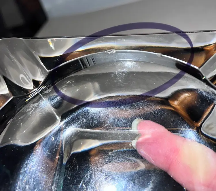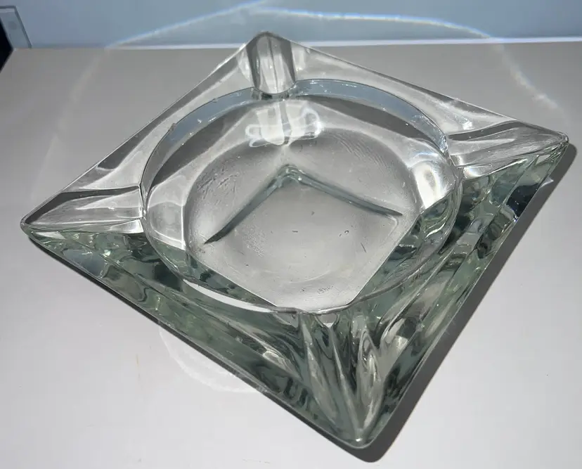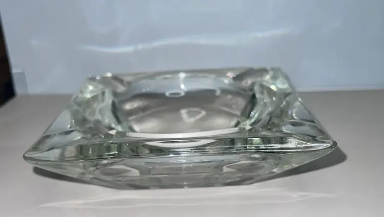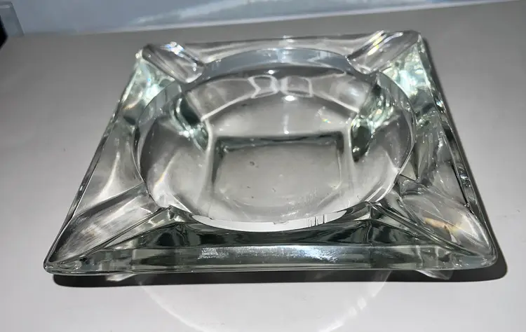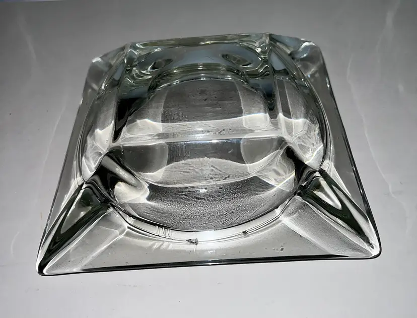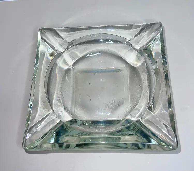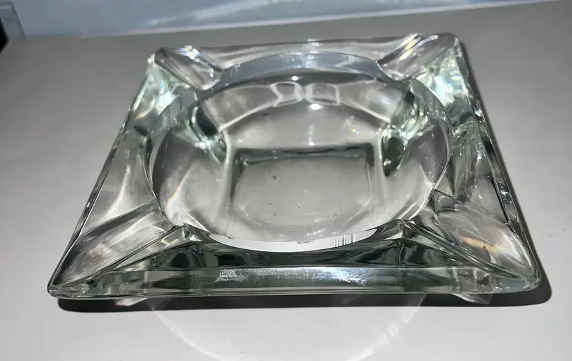 5 3/4” square. 1 1/2” tall. Beveled edges. Very heavy substantial glass. Small chips on edges as shown in photos