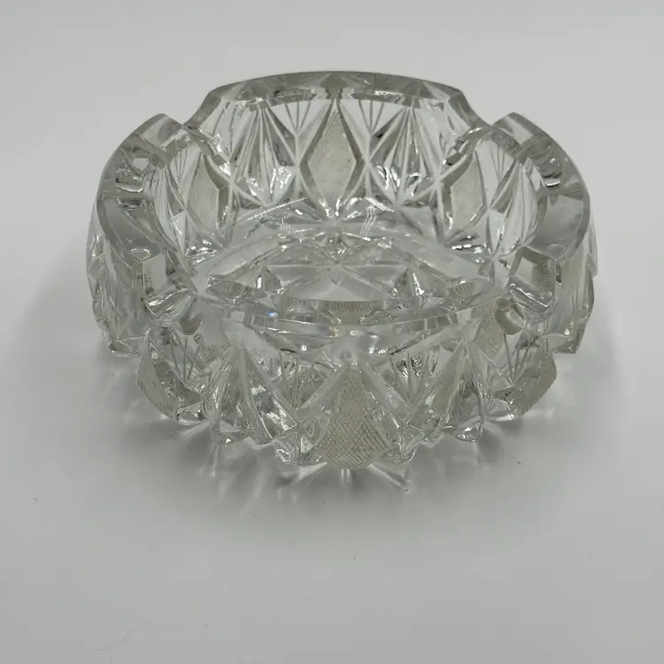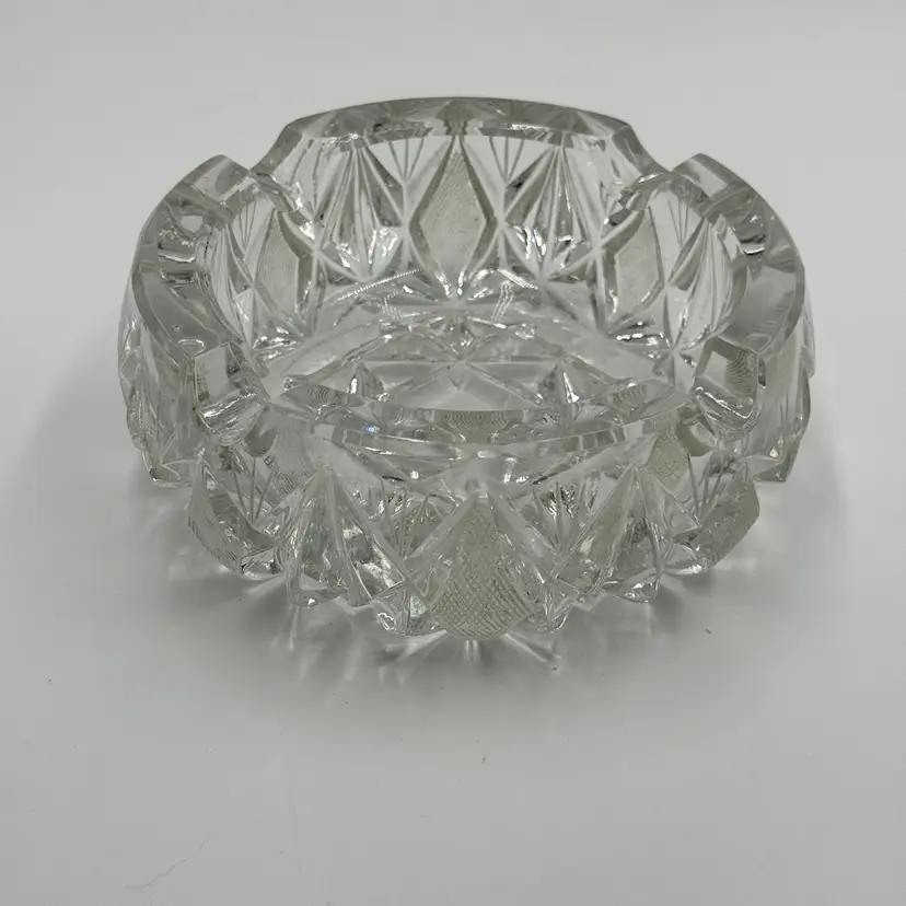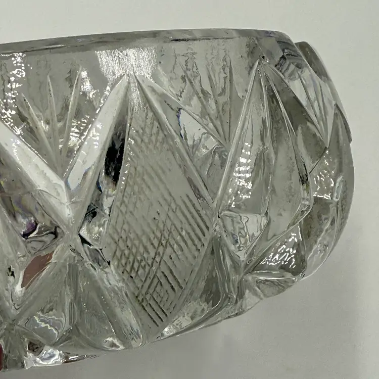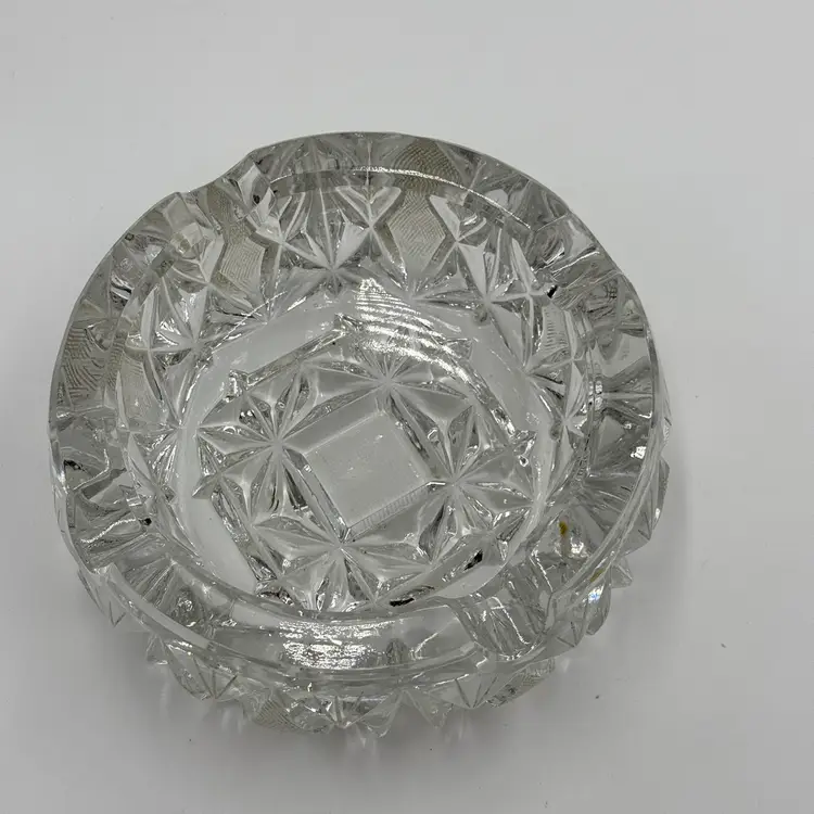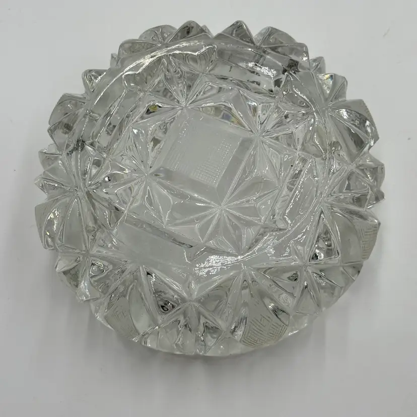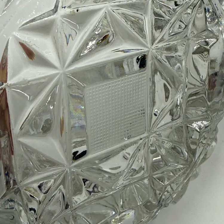In good condition. Has a couple of minor flea bites on the rim. Will need delicate cleaning on the cross hatch pattern. Measures 6 inches in diameter and 2 3/8 inches tall.