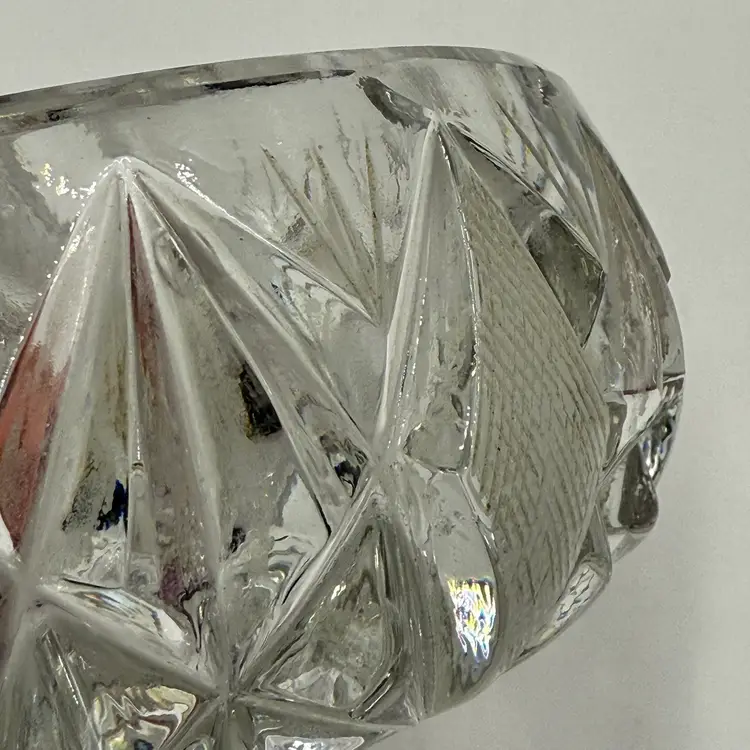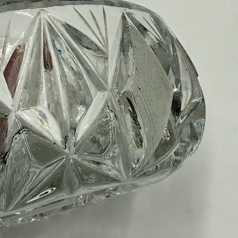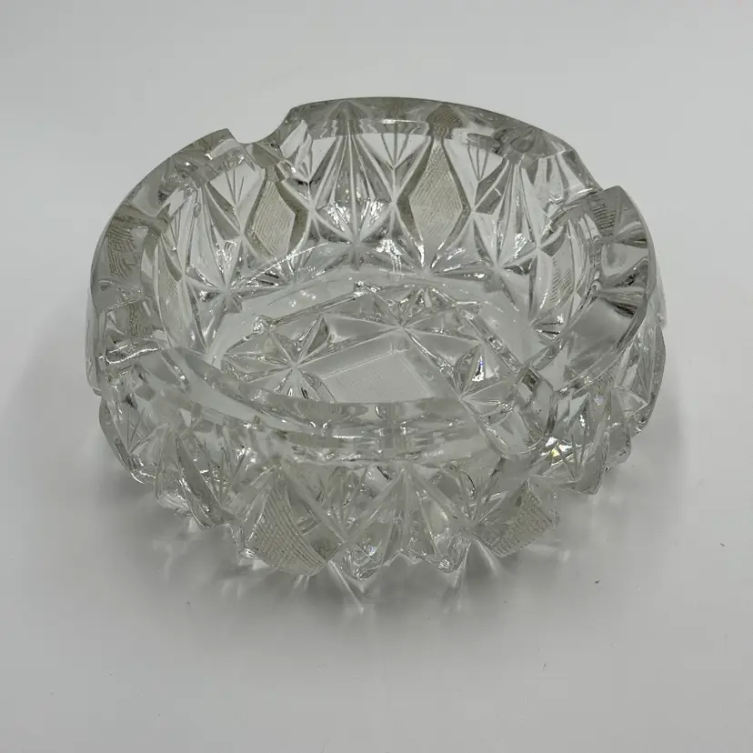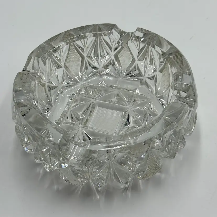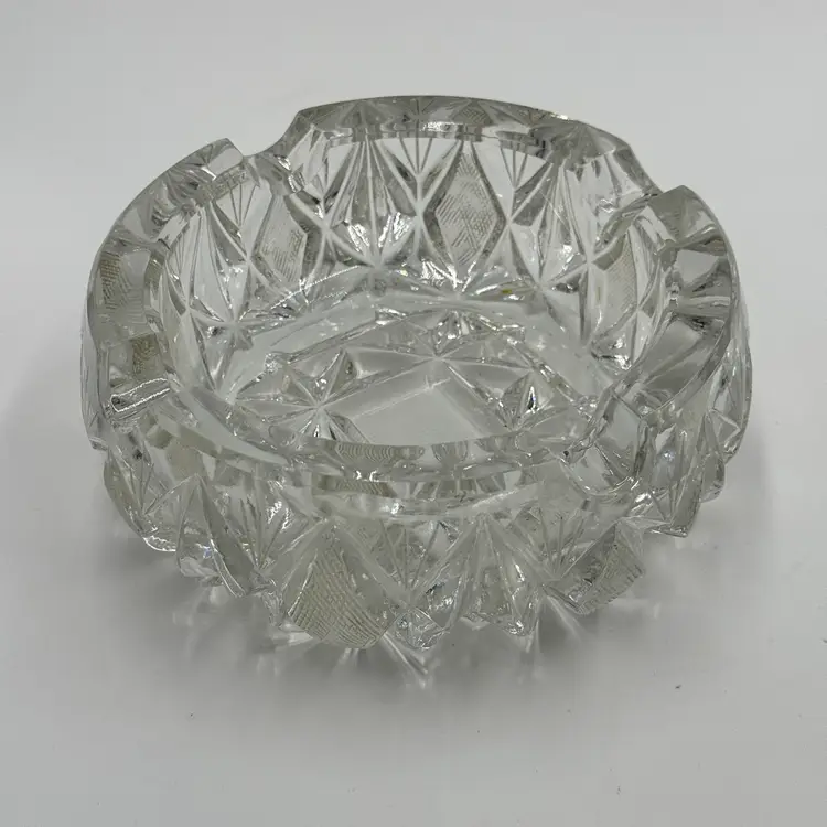 In good condition. Has a couple of minor flea bites on the rim. Will need delicate cleaning on the cross hatch pattern. Measures 6 inches in diameter and 2 3/8 inches tall.