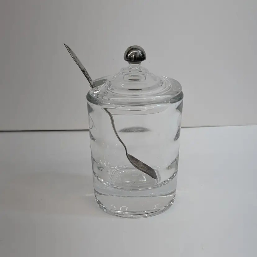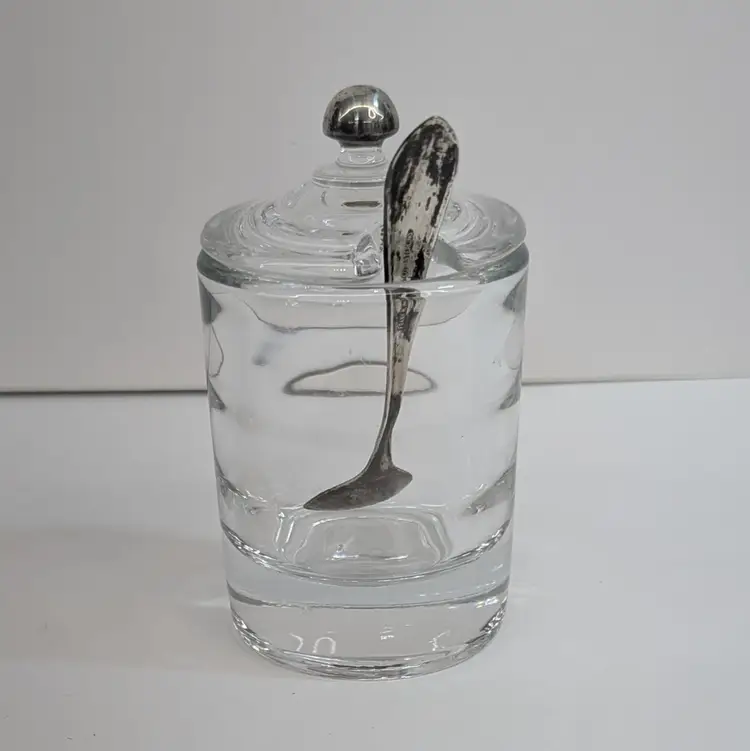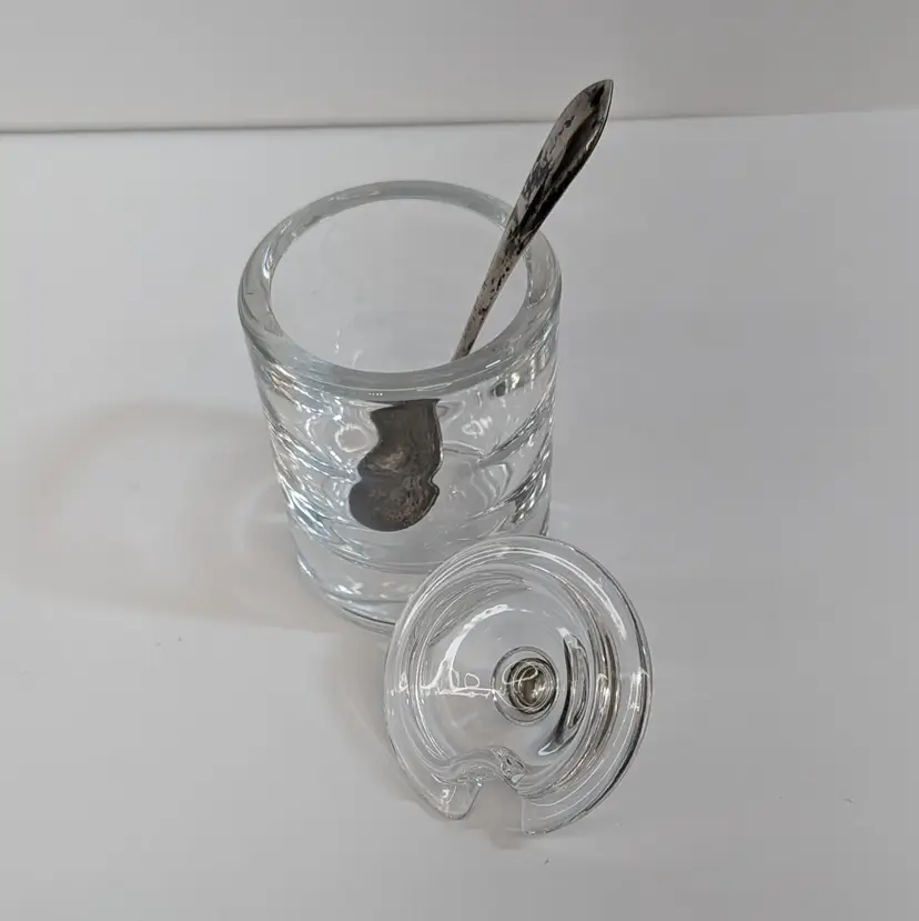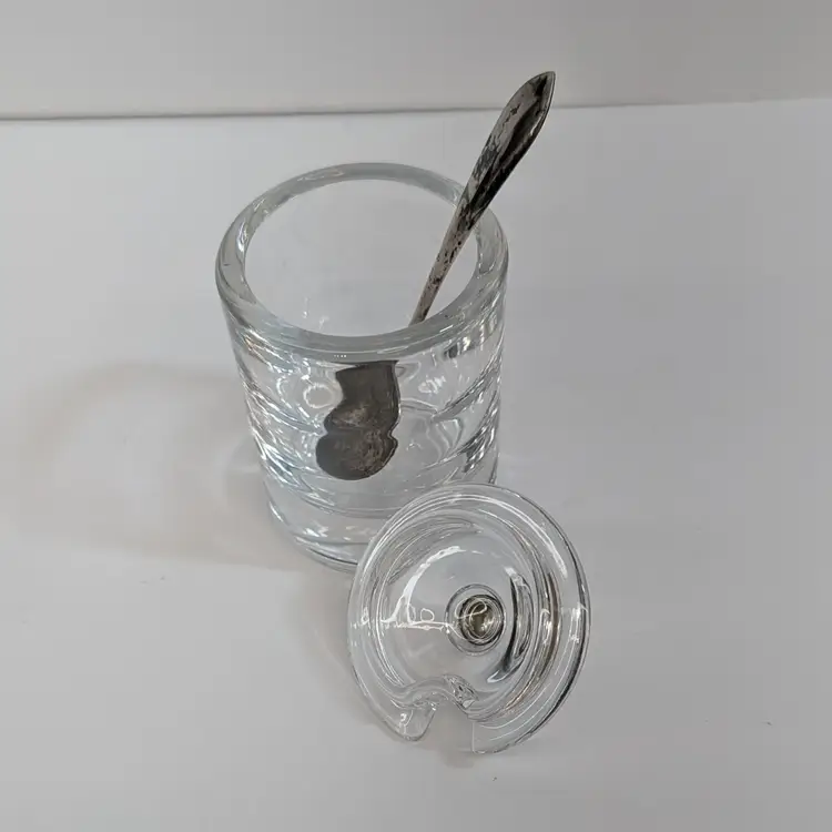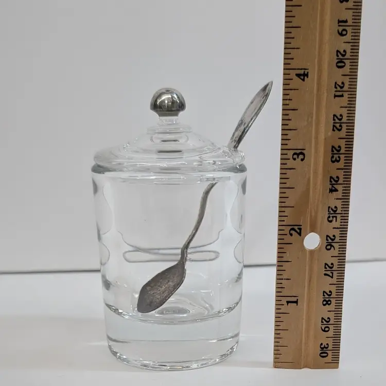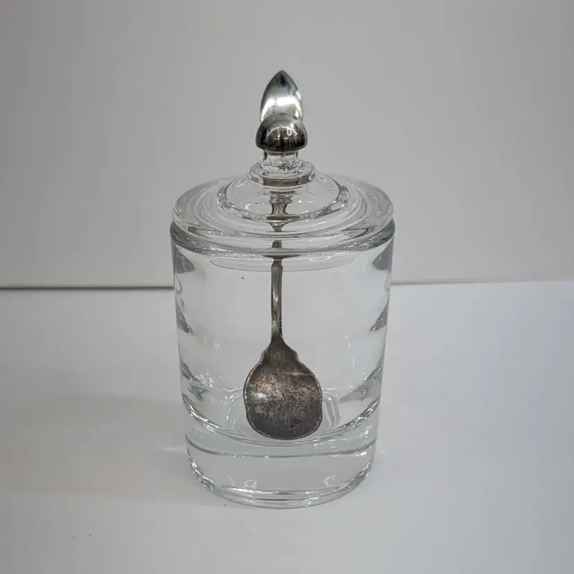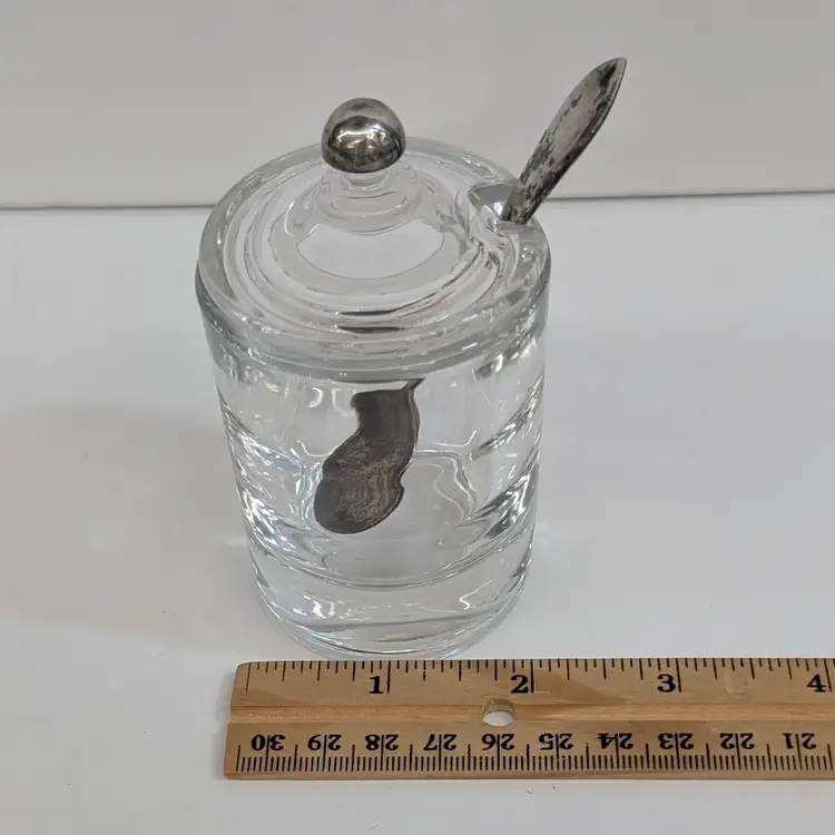 Heisey Glass condiment jar perfect for mustard, jam, salt, etc. It has optic groves in the glass, a lid with a spoon hole, a silver knob and a Frank M. Whiting Co sterling silver spoon. There is a small dent on the knob, some tarnish that could be polished off and some wear on the head of the spoon from use. Measurements ~ 2 x 3.75" tall or a little higher with the spoon, the sterling spoon is 8 grams