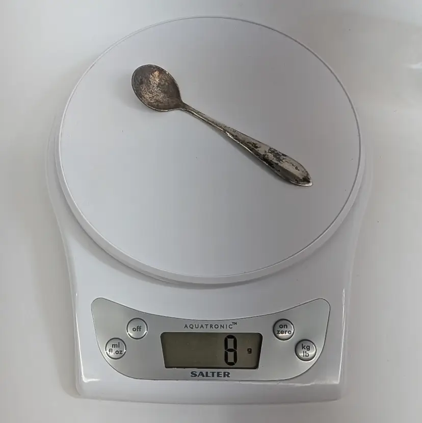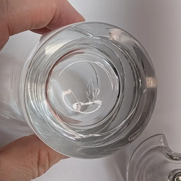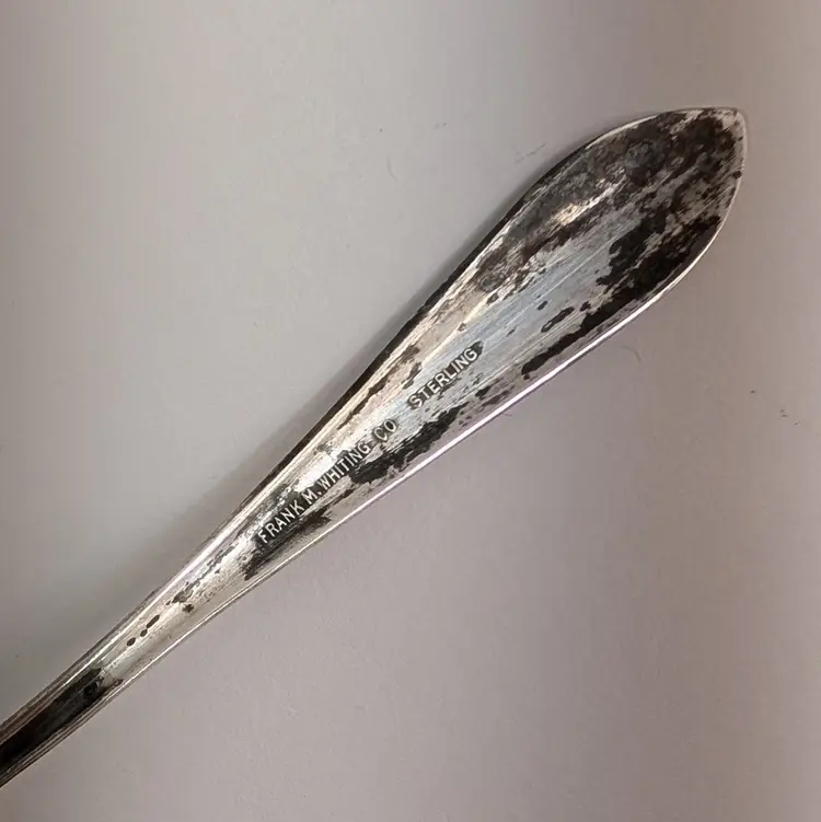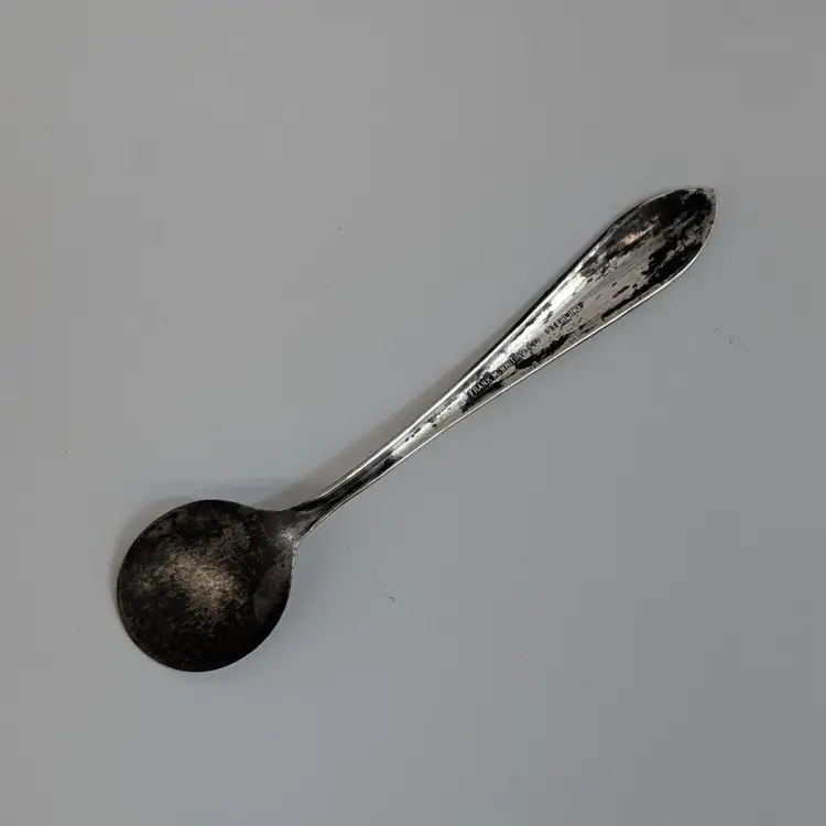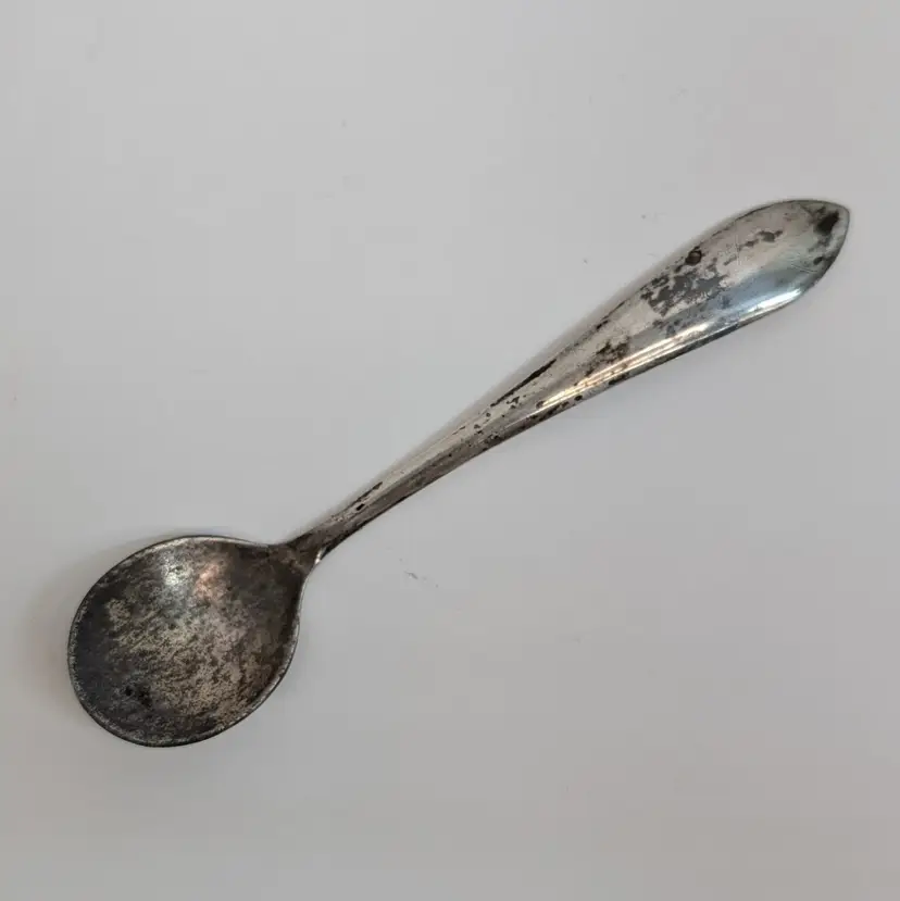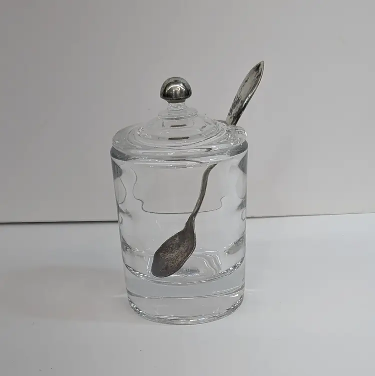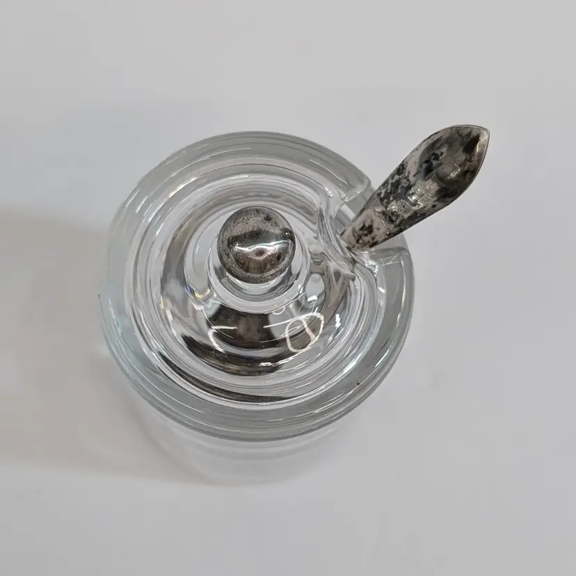 Heisey Glass condiment jar perfect for mustard, jam, salt, etc. It has optic groves in the glass, a lid with a spoon hole, a silver knob and a Frank M. Whiting Co sterling silver spoon. There is a small dent on the knob, some tarnish that could be polished off and some wear on the head of the spoon from use. Measurements ~ 2 x 3.75" tall or a little higher with the spoon, the sterling spoon is 8 grams