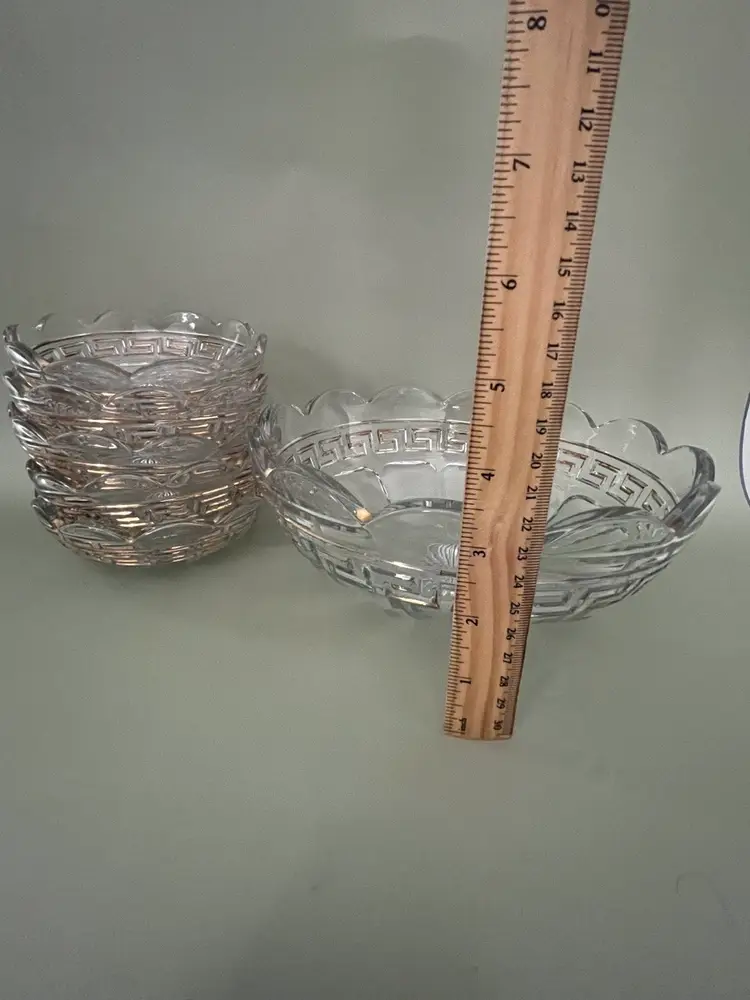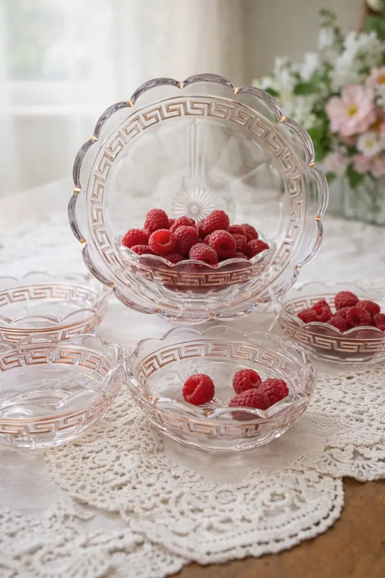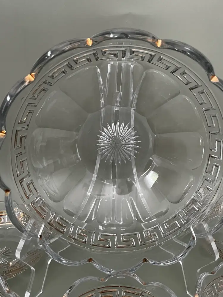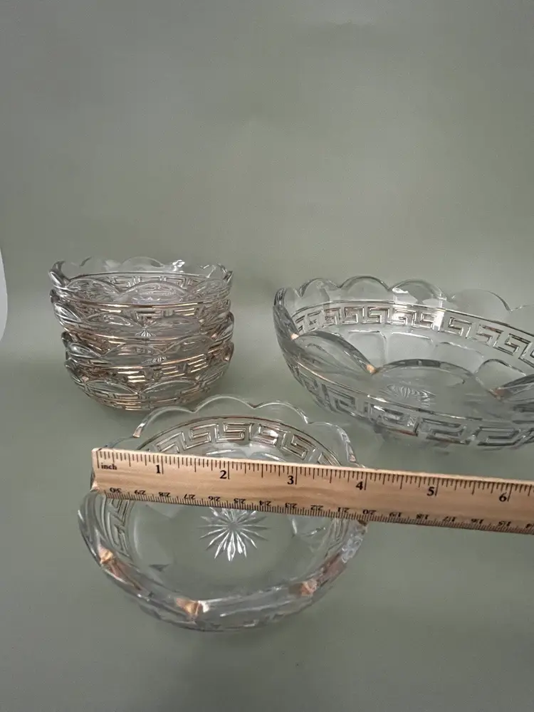 Antique Heisey Berry Bowl Set. Elegant vintage Heisey glass dessert set featuring a classic Greek key etched border and brilliant starburst bases. This set includes five individual berry bowls and one matching serving bowl in a delicate crystal. A timeless addition to any vintage table, perfect for cottagecore or classic entertaining. There is some wearing on the gilded edges of the serving bowl and one of the berry bowls as to be expected in a set this age. The set truly in beautiful antique condition.