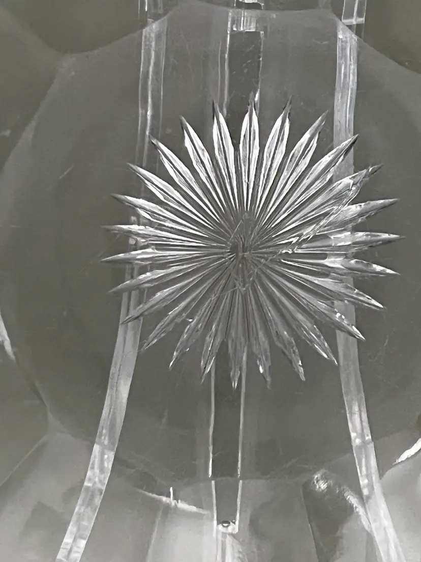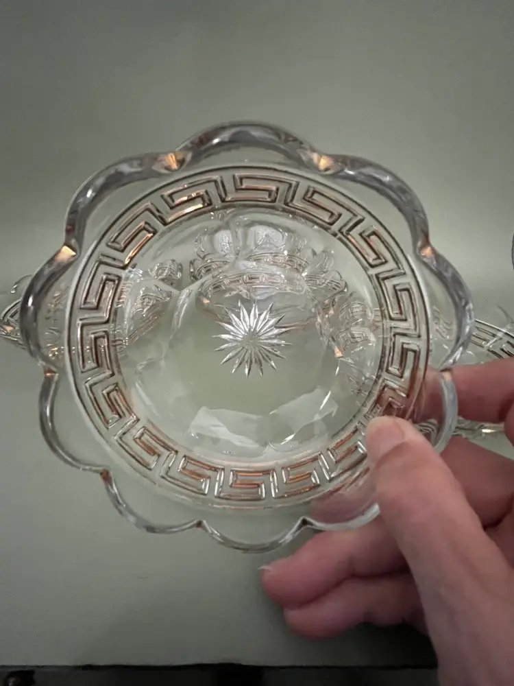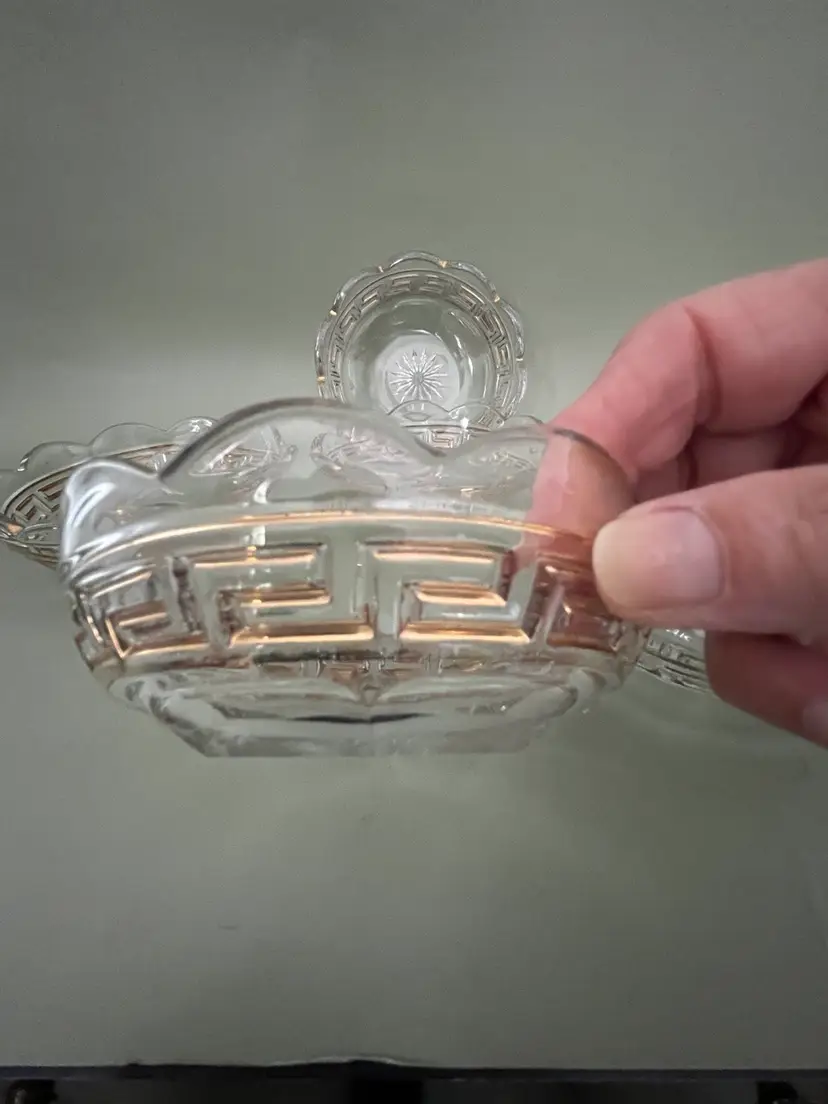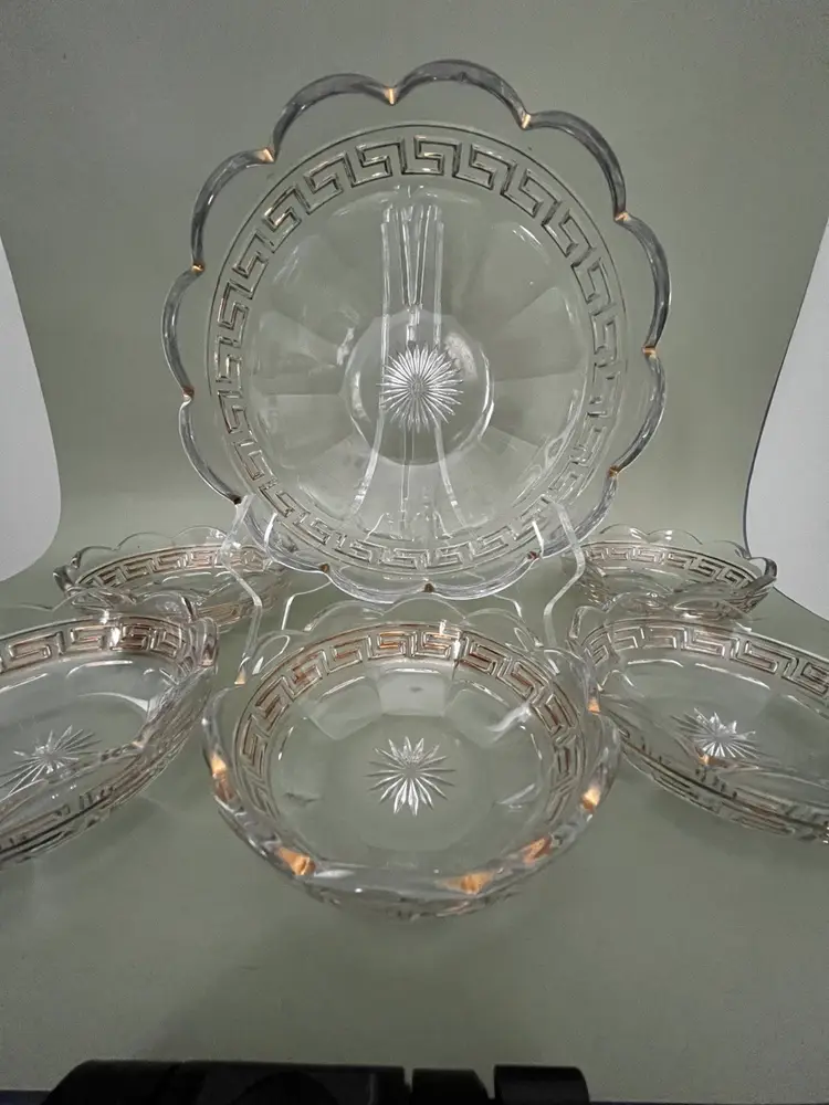 Antique Heisey Berry Bowl Set. Elegant vintage Heisey glass dessert set featuring a classic Greek key etched border and brilliant starburst bases. This set includes five individual berry bowls and one matching serving bowl in a delicate crystal. A timeless addition to any vintage table, perfect for cottagecore or classic entertaining. There is some wearing on the gilded edges of the serving bowl and one of the berry bowls as to be expected in a set this age. The set truly in beautiful antique condition.